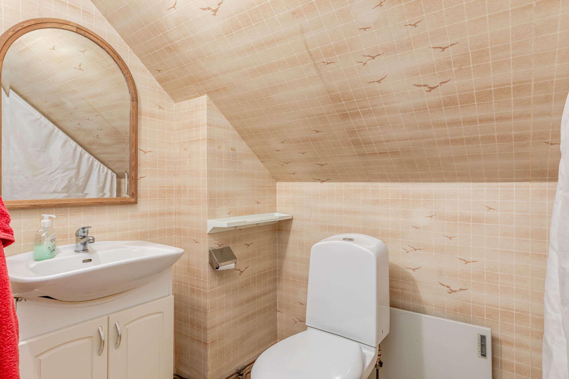 Äldre duschrum med våtrumstapet och våtrumsmatta. Duschhörna, tvättställ och wc.