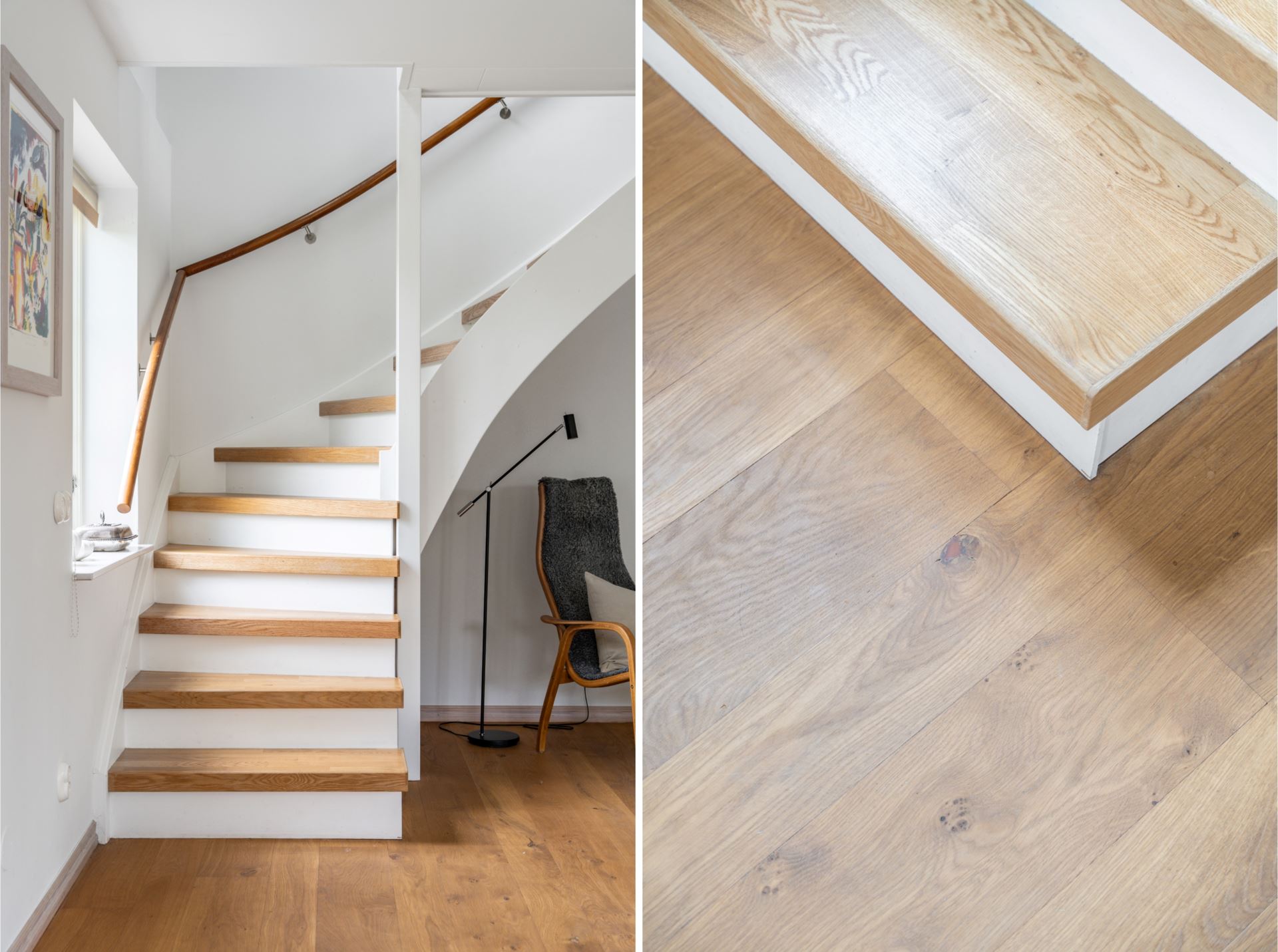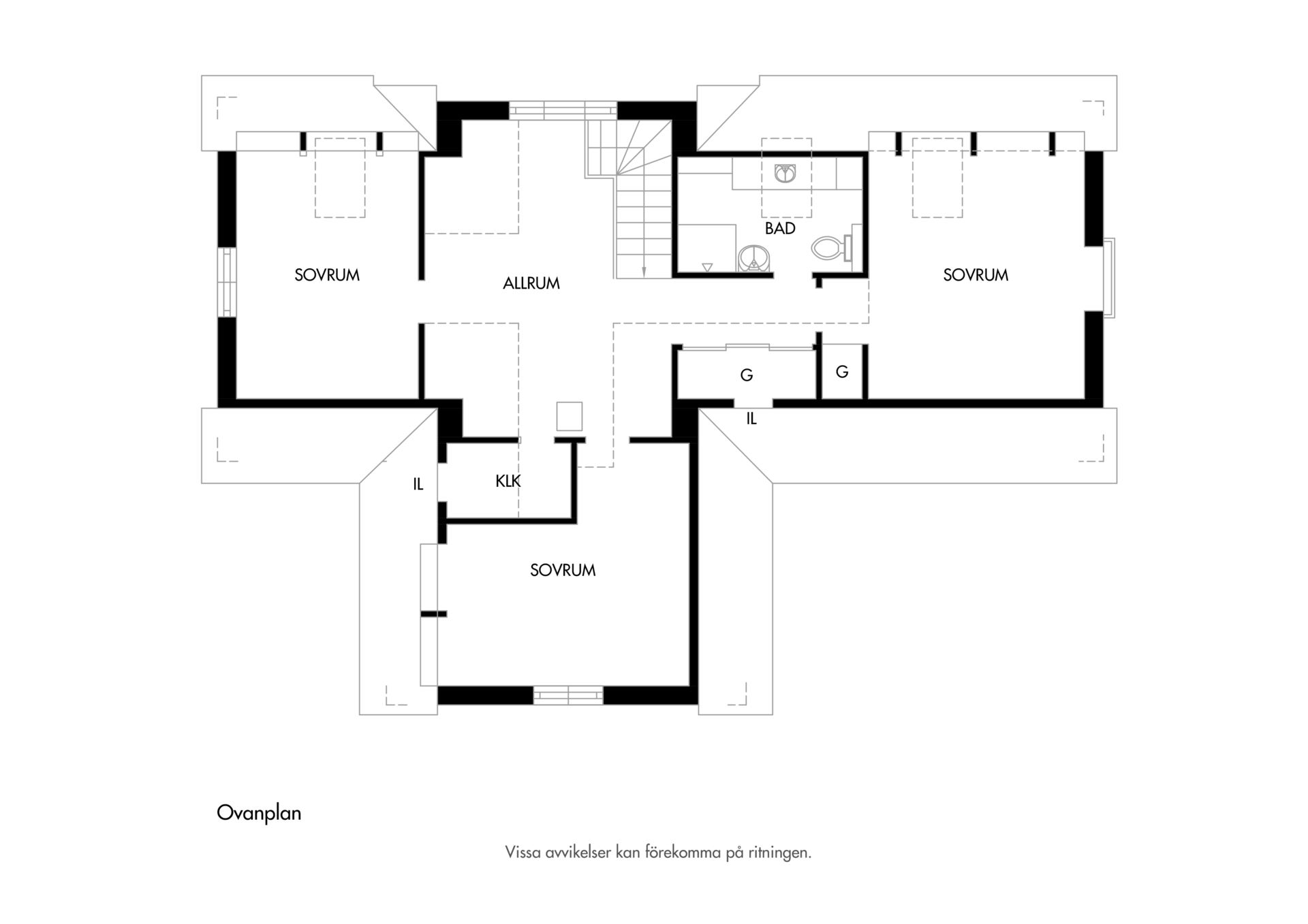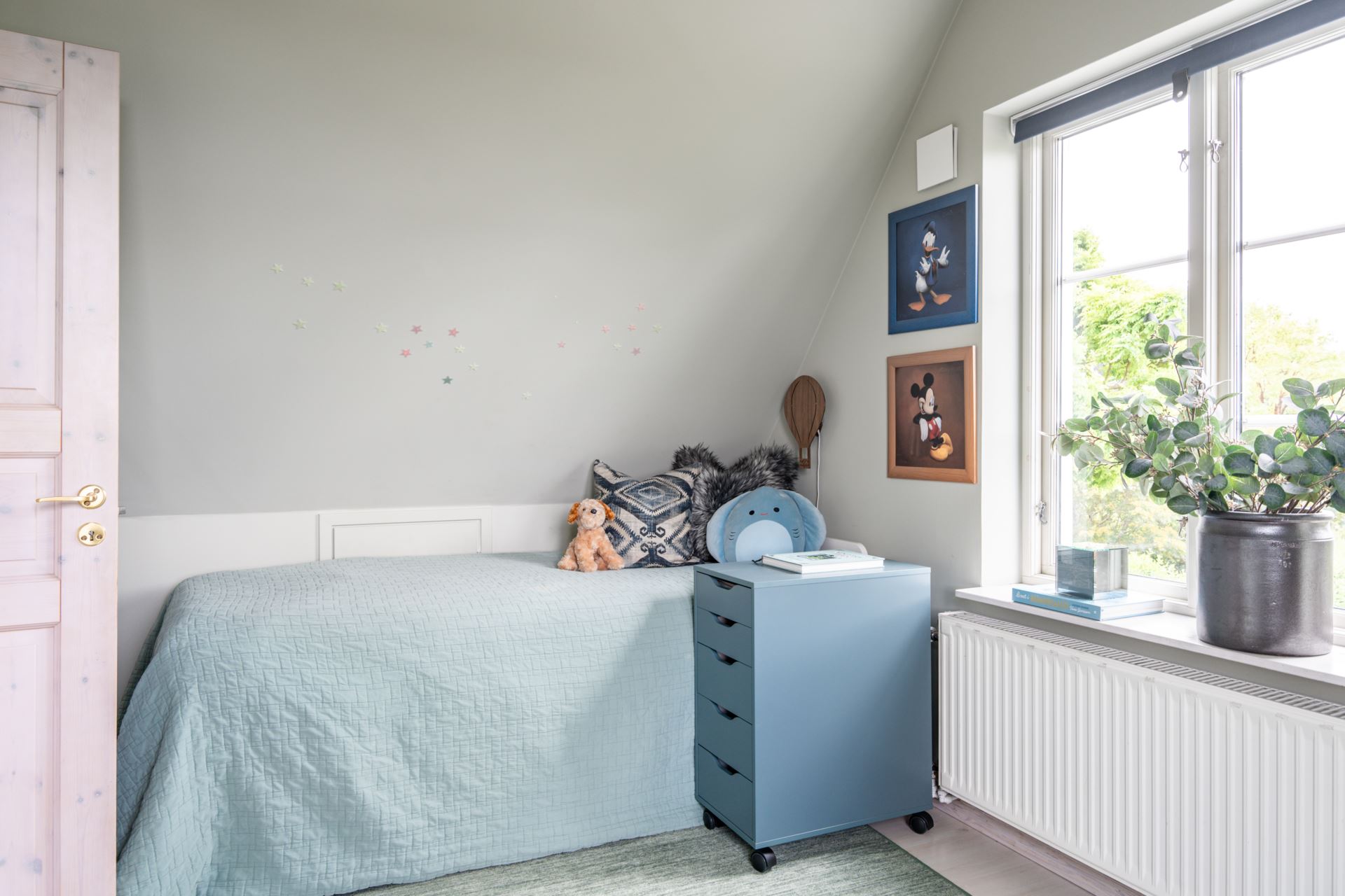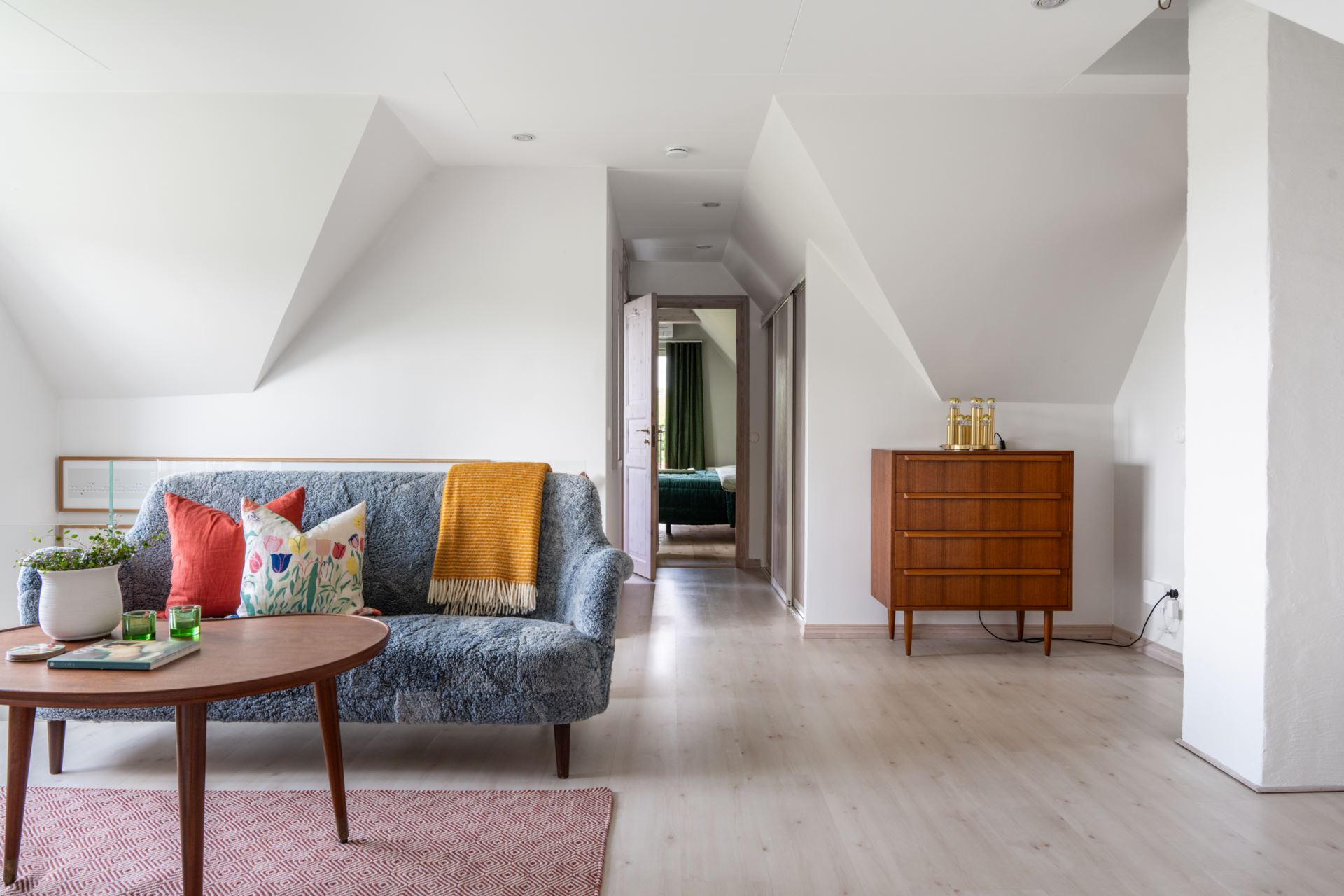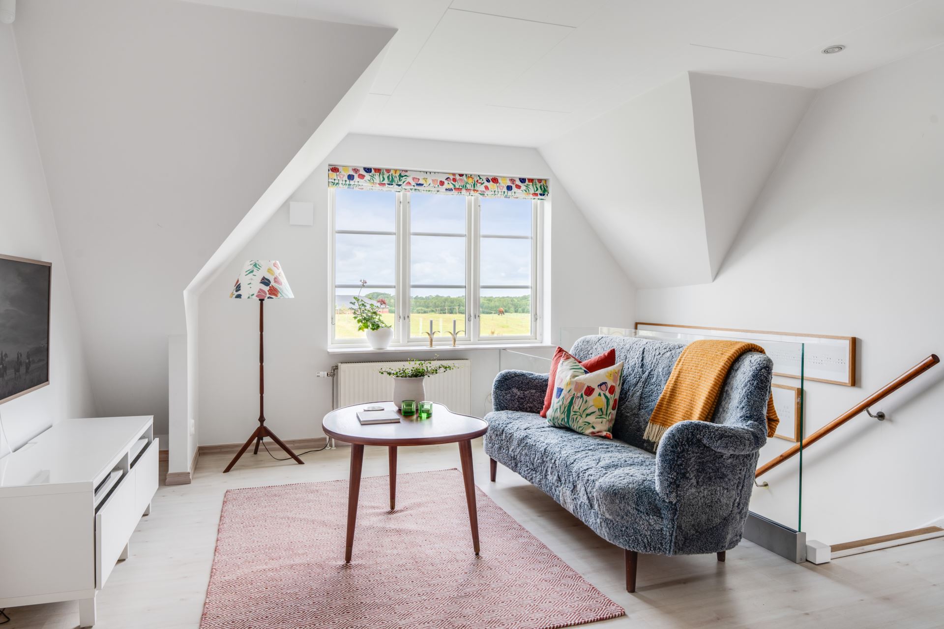Ovanvåningen bjuder på ett ljust och luftigt intryck med genomgående ljusa golv och målade väggar. Här finns en möblerbar övre hall som lämpar sig väl som allrum, arbetsplats eller lekyta. Tre välplanerade sovrum och stort helkaklat badrum. Från både allrum och sovrum njuter du av vacker utsikt över den gröna omgivningen.