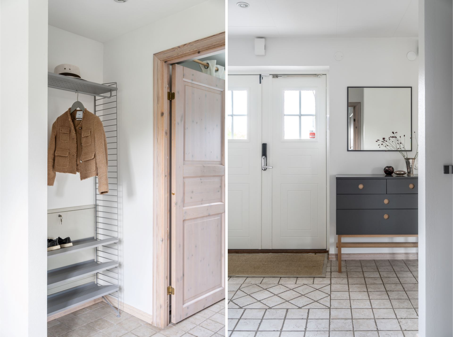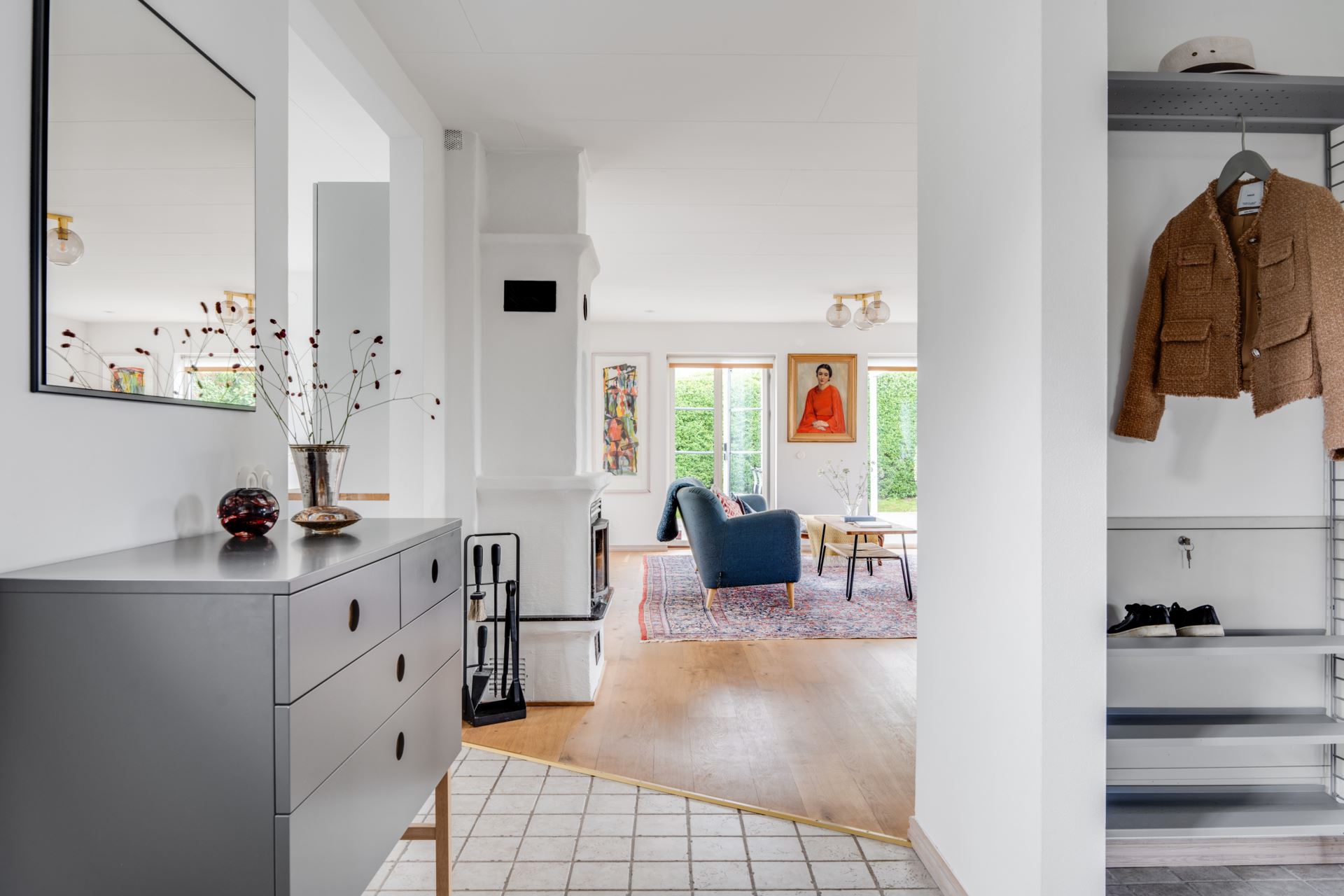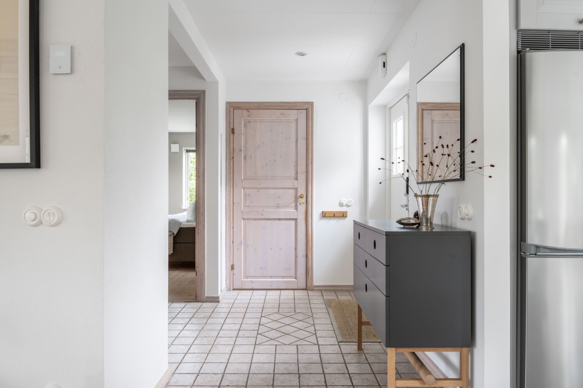 Välkomnande och ljus entré med praktiskt klinkergolv. Här finns gott om plats för avhängning av ytterkläder och skor samt god överblick mot hemmets sociala ytor. En genomtänkt hall som direkt ger ett trivsamt första intryck.