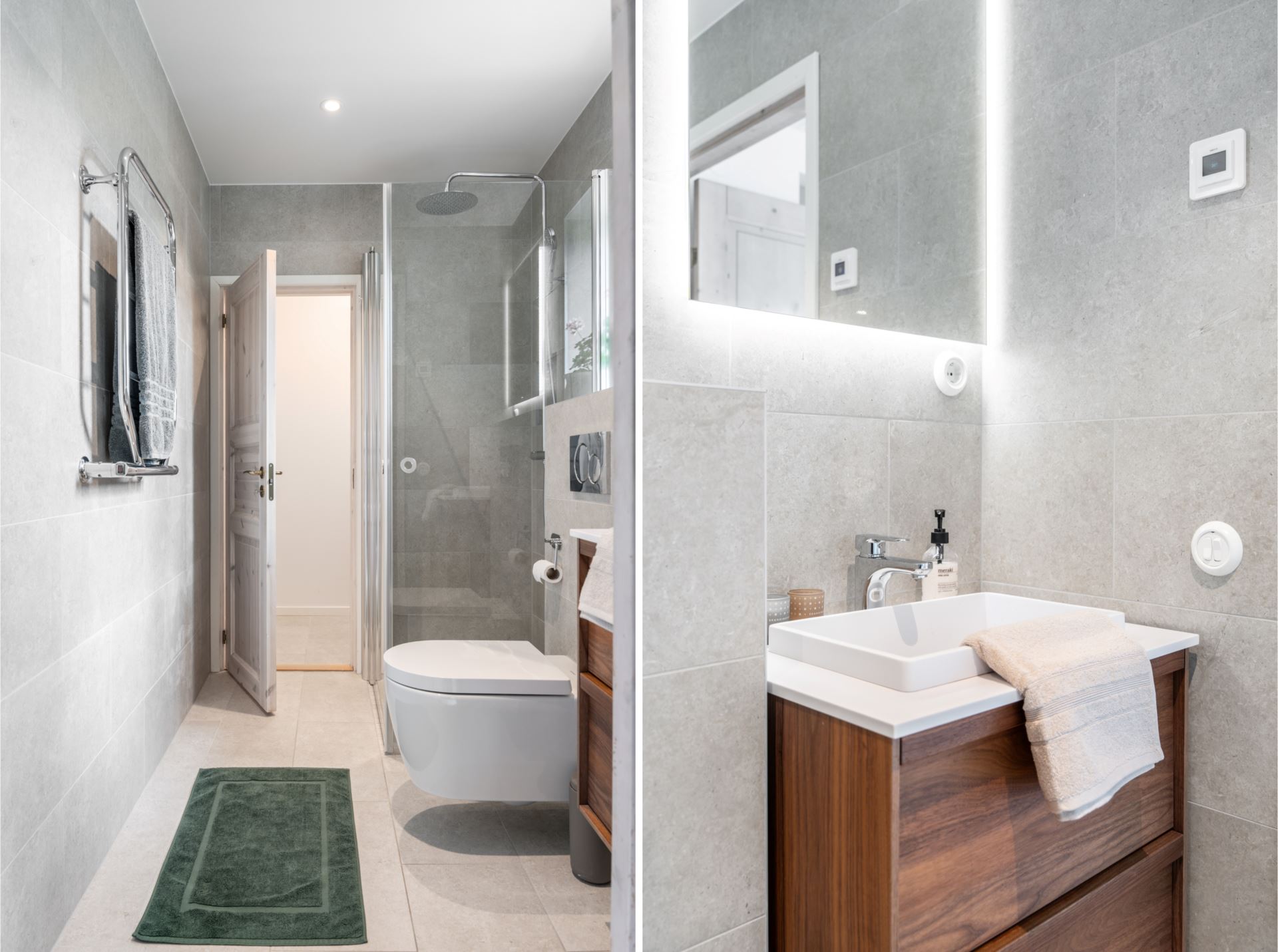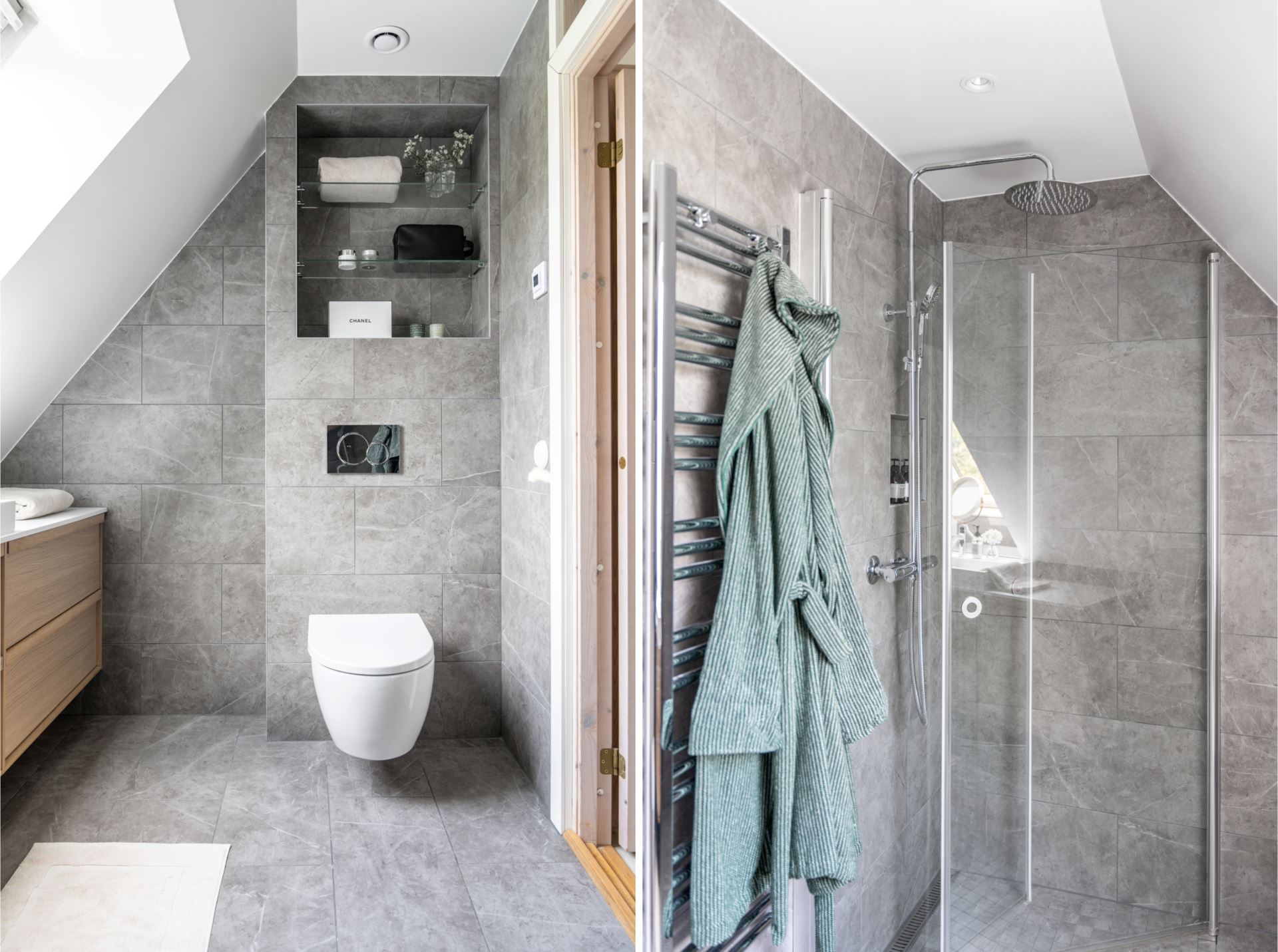 Stilrent, helkaklat badrum i grå ton, renoverat med moderna materialval. Utrustat med wc, kommod med förvaring, dusch med glasväggar samt behaglig golvvärme.