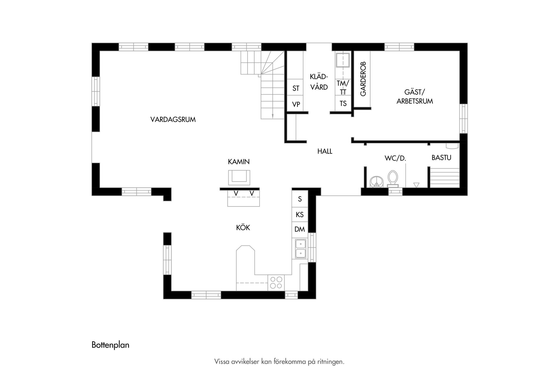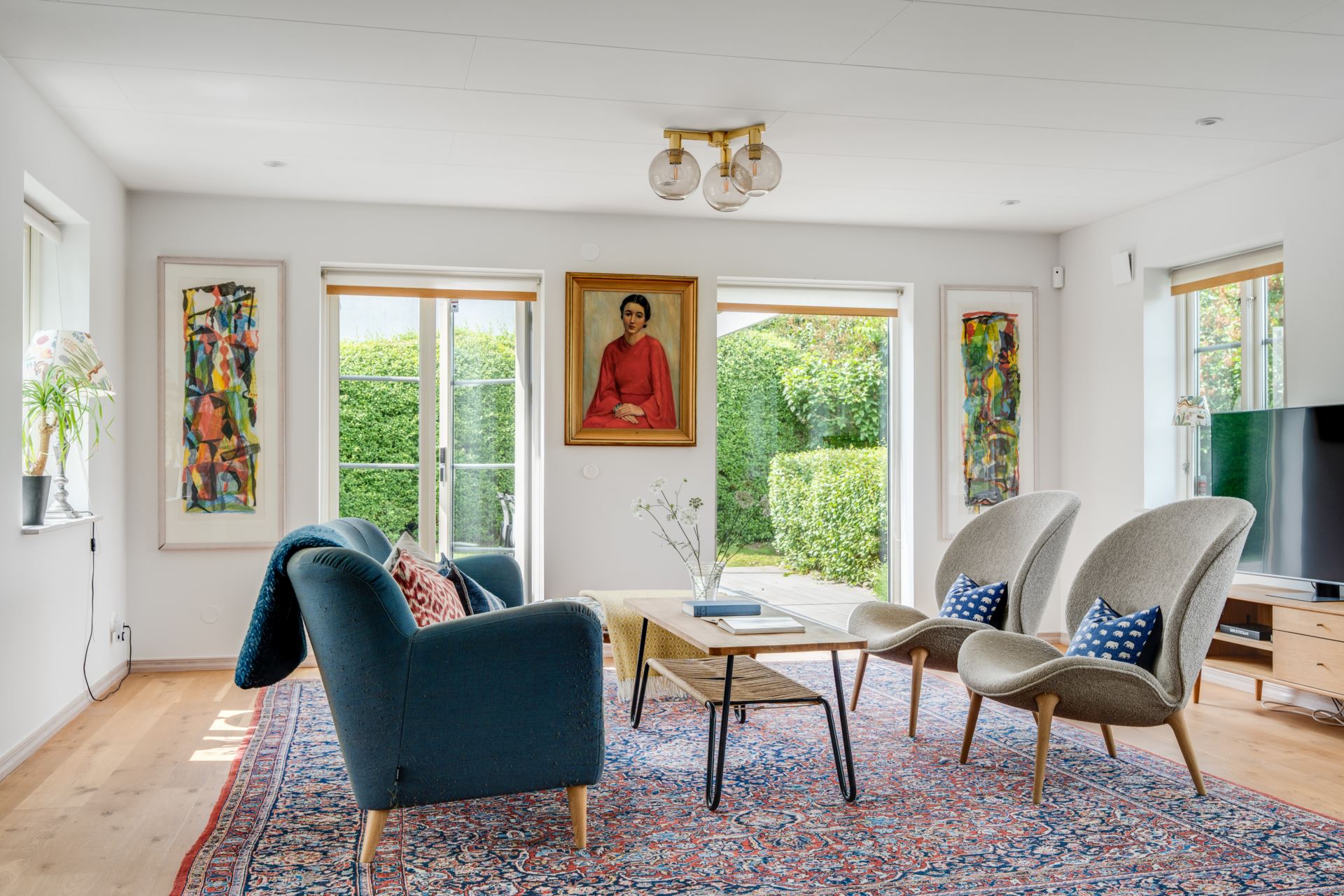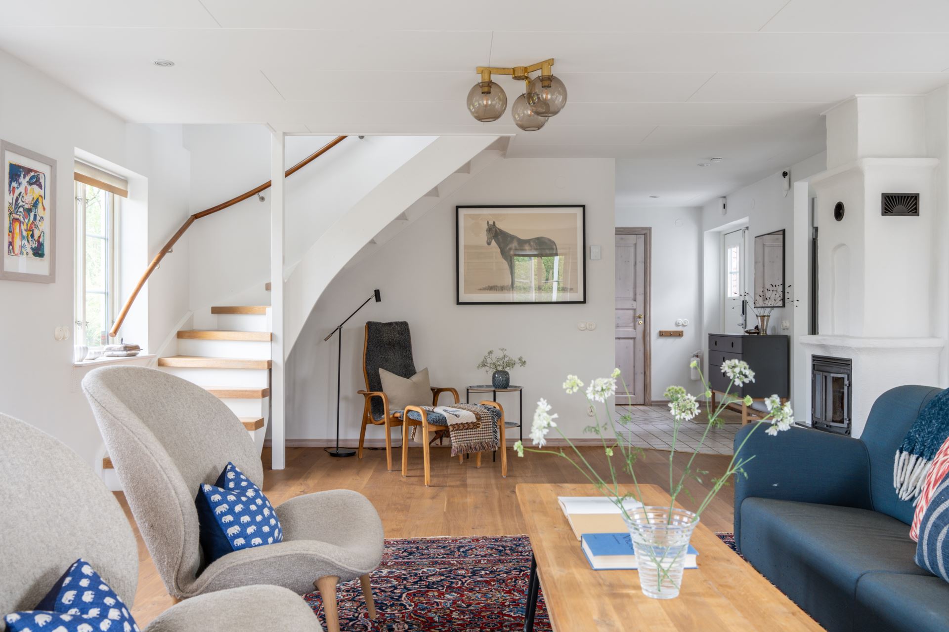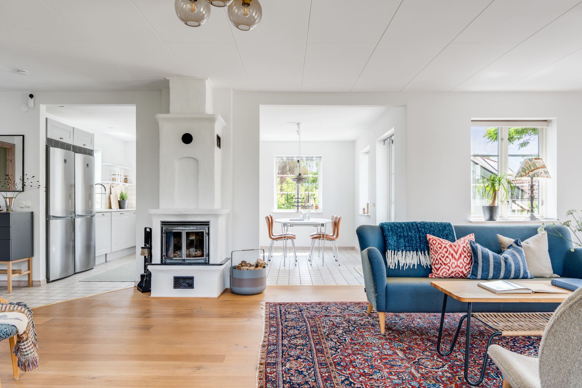 Ljust och trivsamt vardagsrum med stora fönsterpartier och terrassdörrar som öppnar upp mot det generösa trädäcket – en naturlig förlängning av hemmet under sommarhalvåret. Vackert trägolv skapar en varm och inbjudande känsla, den centralt placerade braskaminen ger både stämning och värme under årets kallare månader. Rummet har en öppen och luftig planlösning i direkt anslutning till köket.