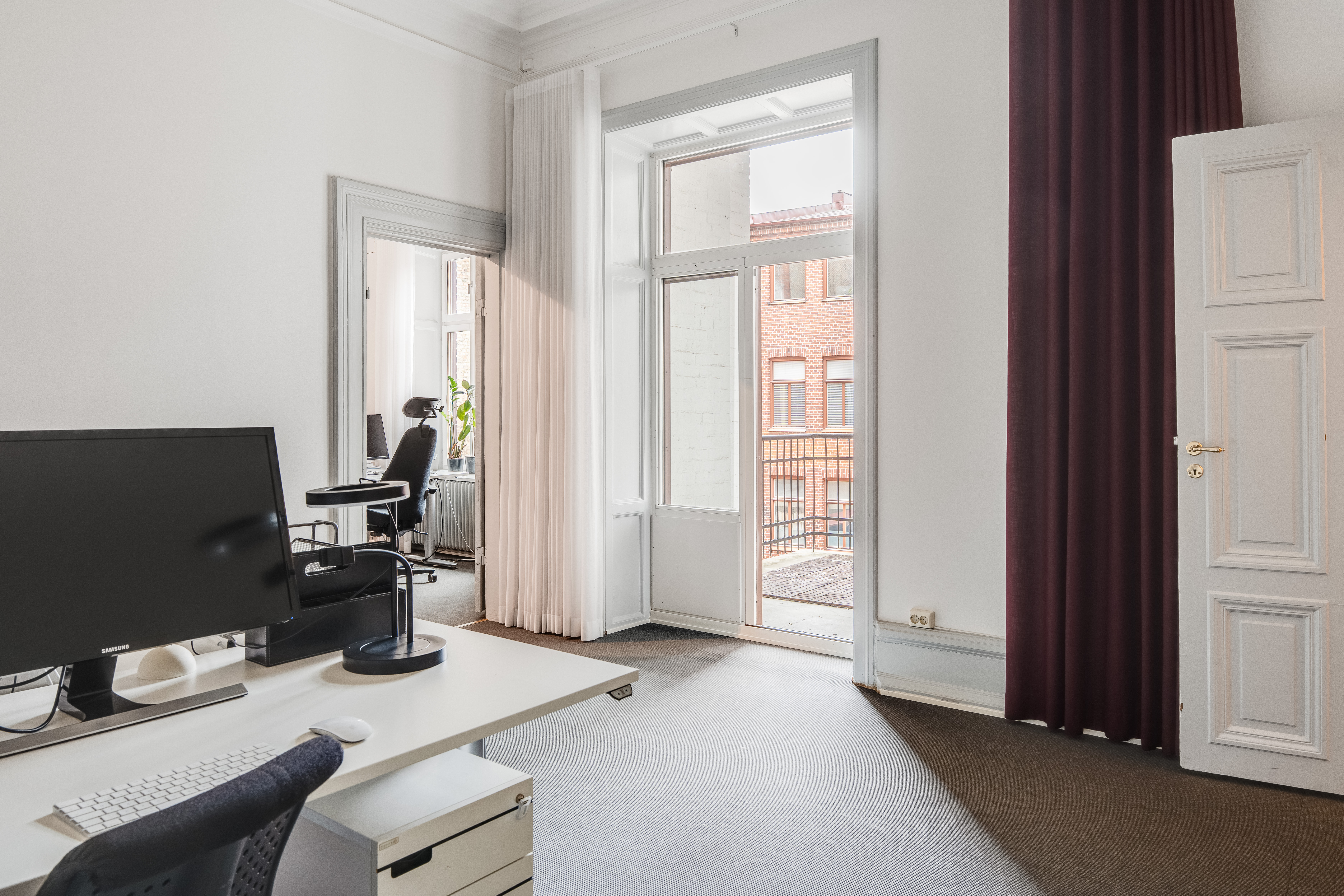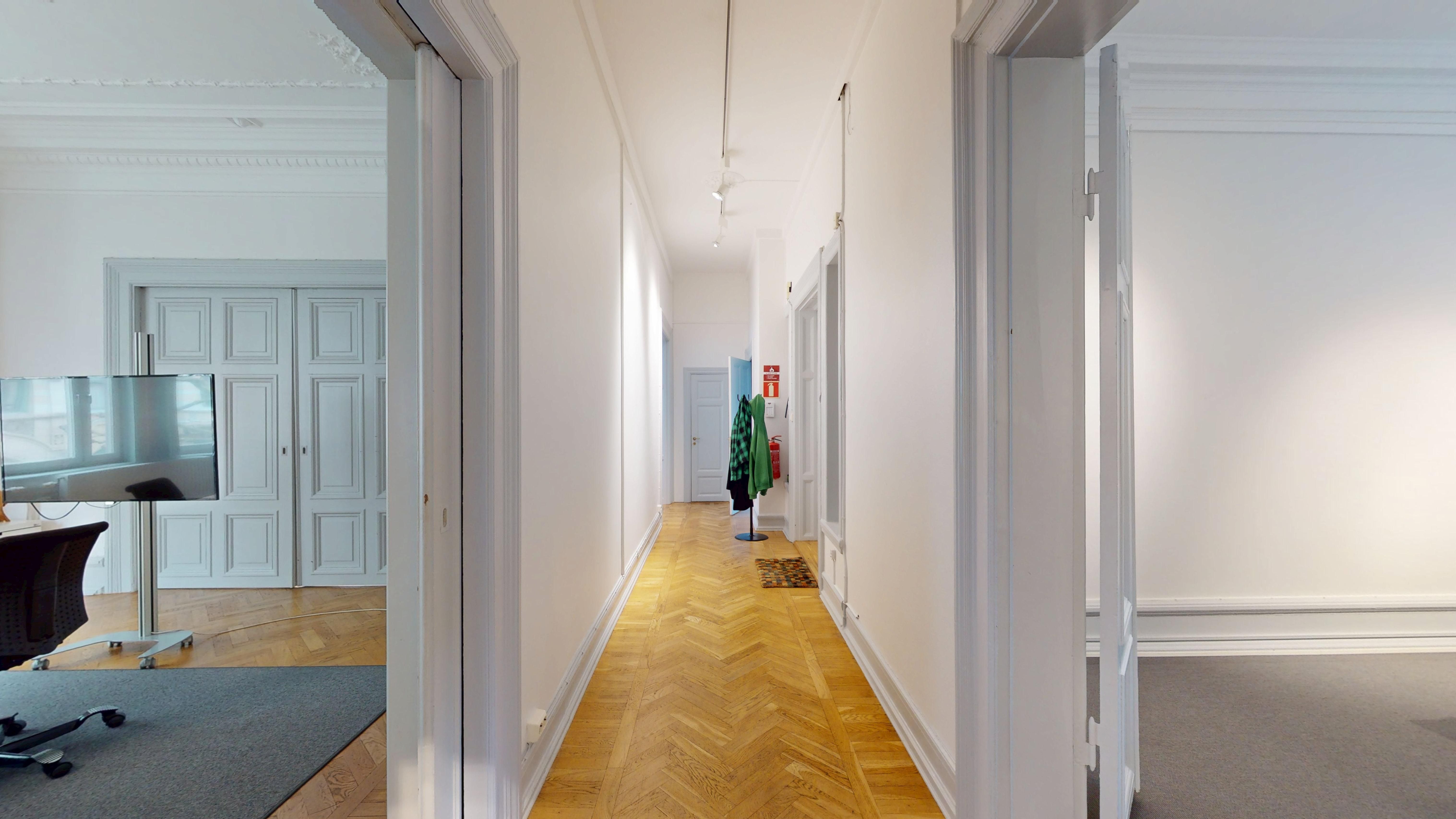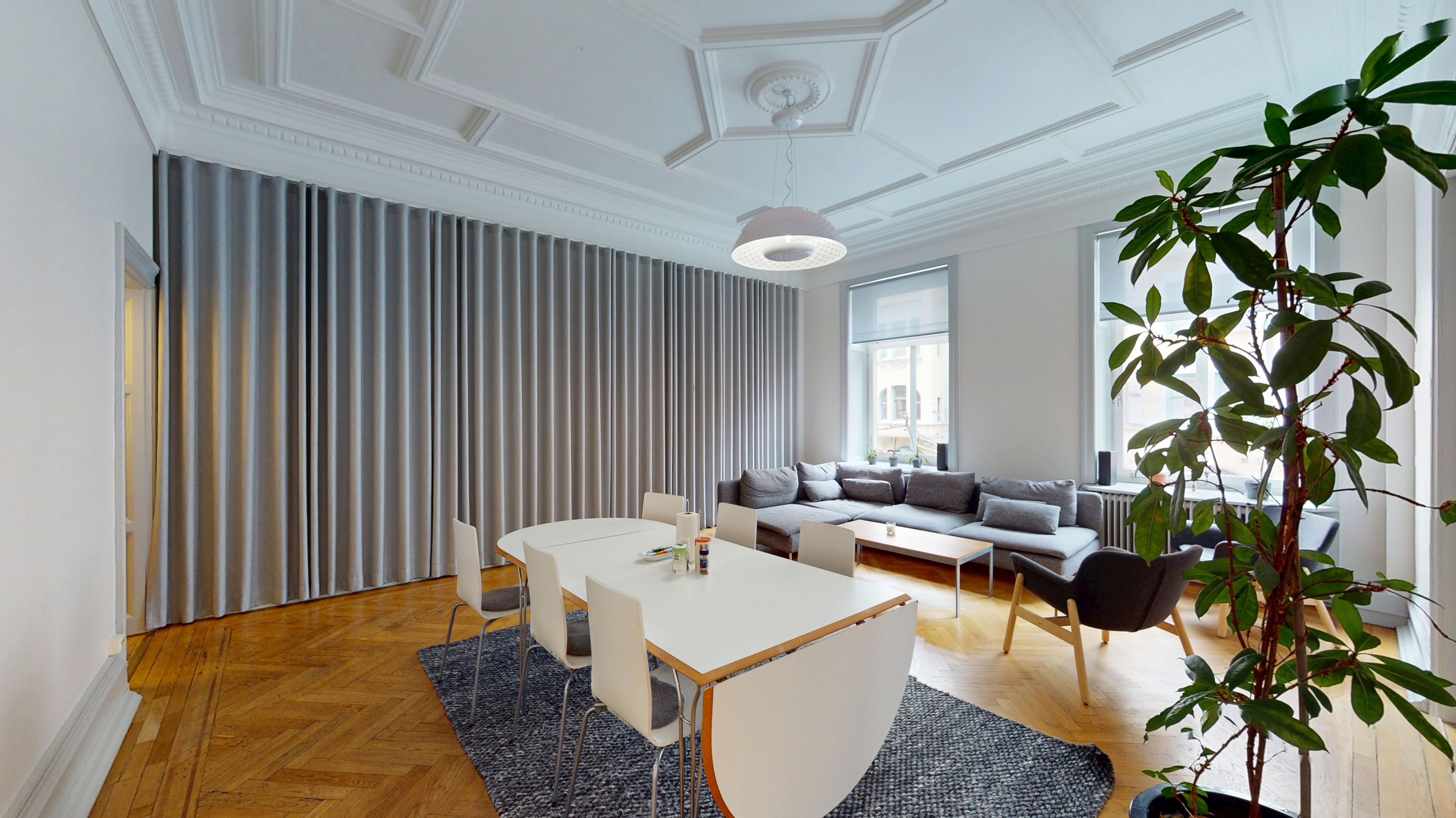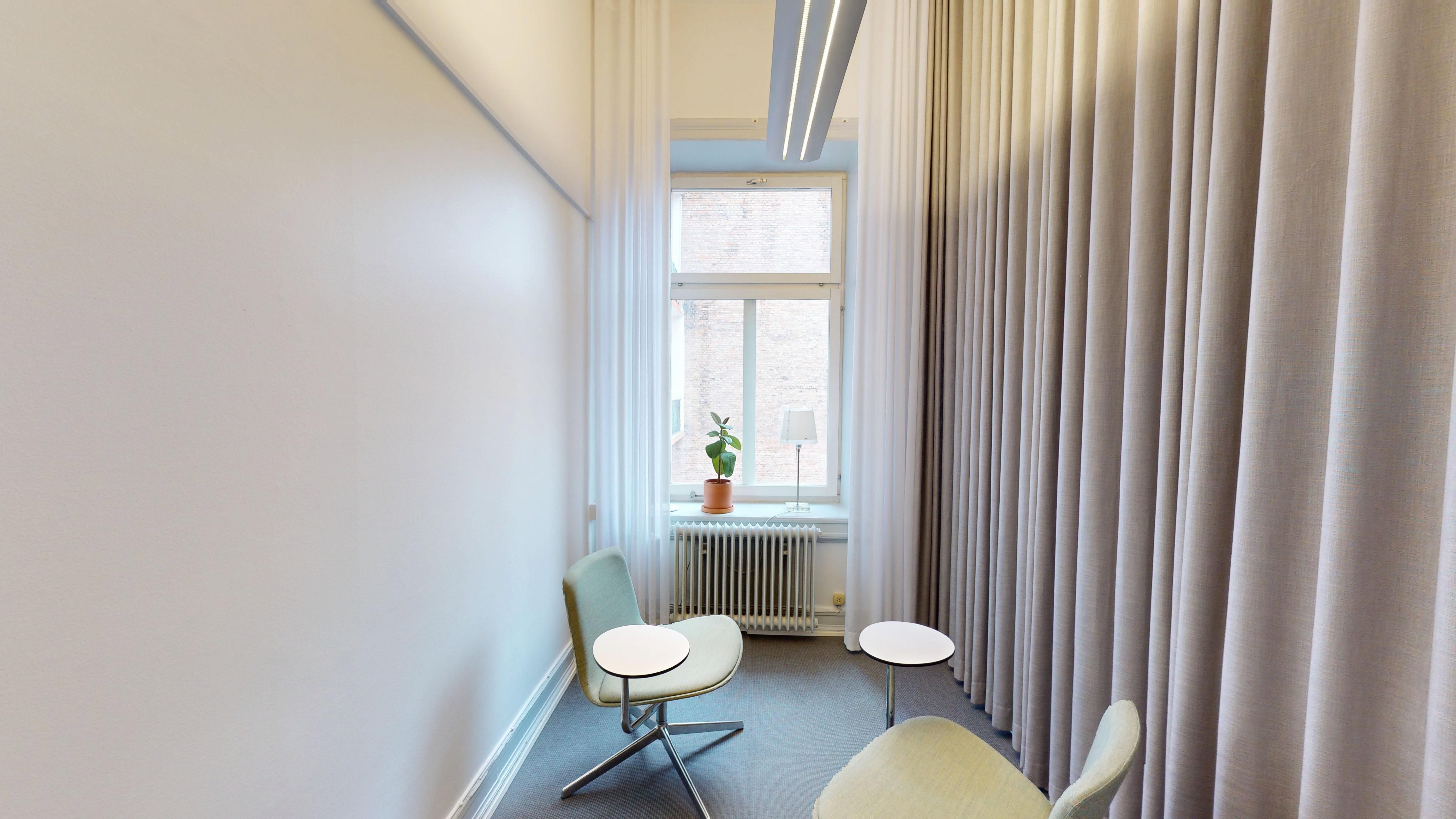 Kontorslokalen är smart disponerad och erbjuder sju rum i varierande storlek – fyra kontorsrum, två rum som lämpar sig väl för möten, konferenser eller pausutrymmen samt ett mindre samtalsrum. Här finns även ett större badrum, en separat wc och praktiska ytor för både personal och besökare. Den genomtänkta planlösningen gör att lokalen fungerar utmärkt för både rådgivande verksamheter, byråer och kreativa bolag.