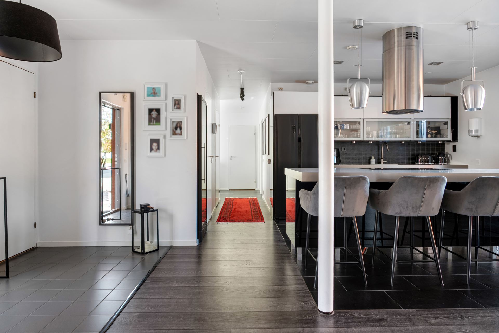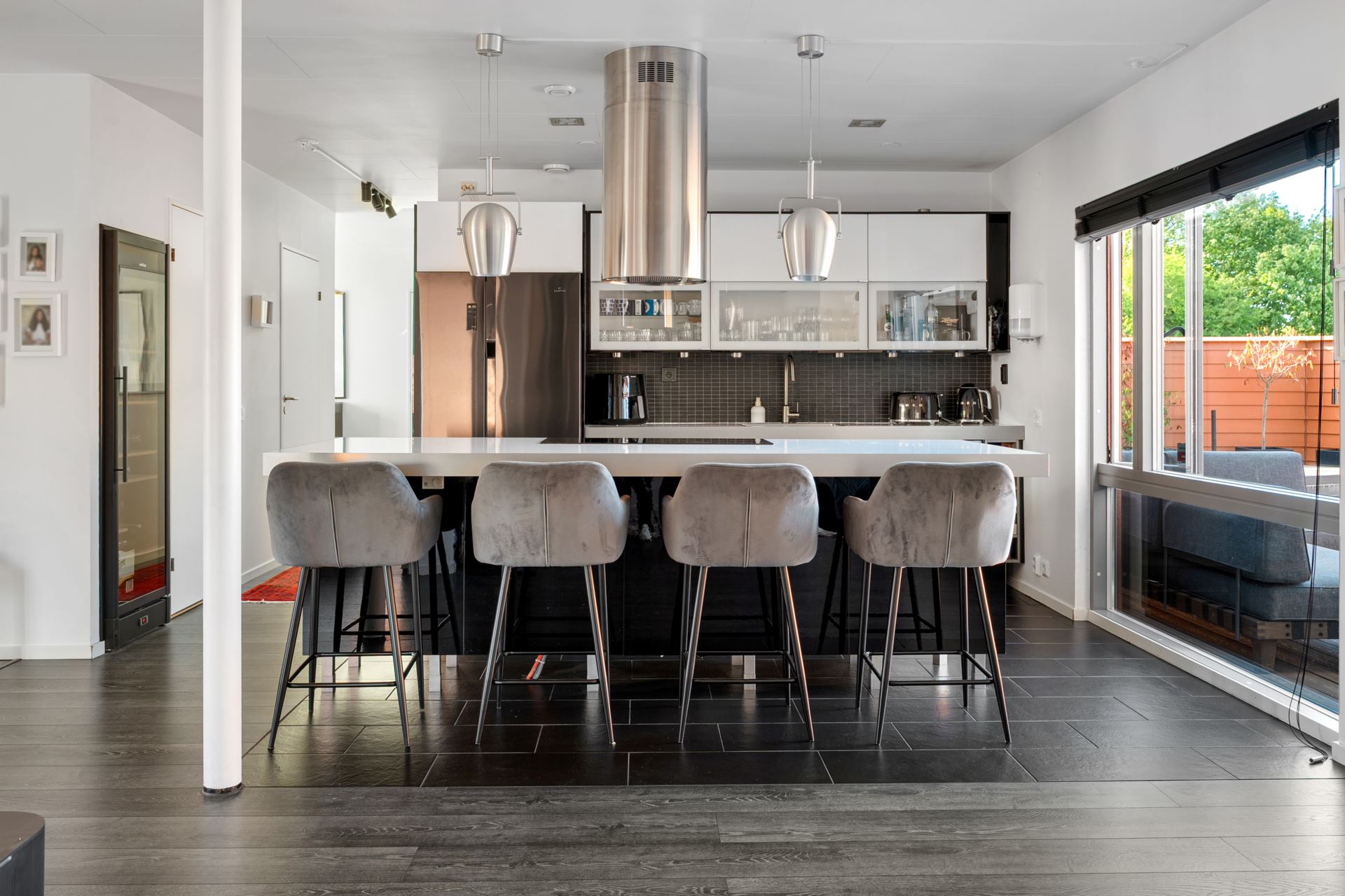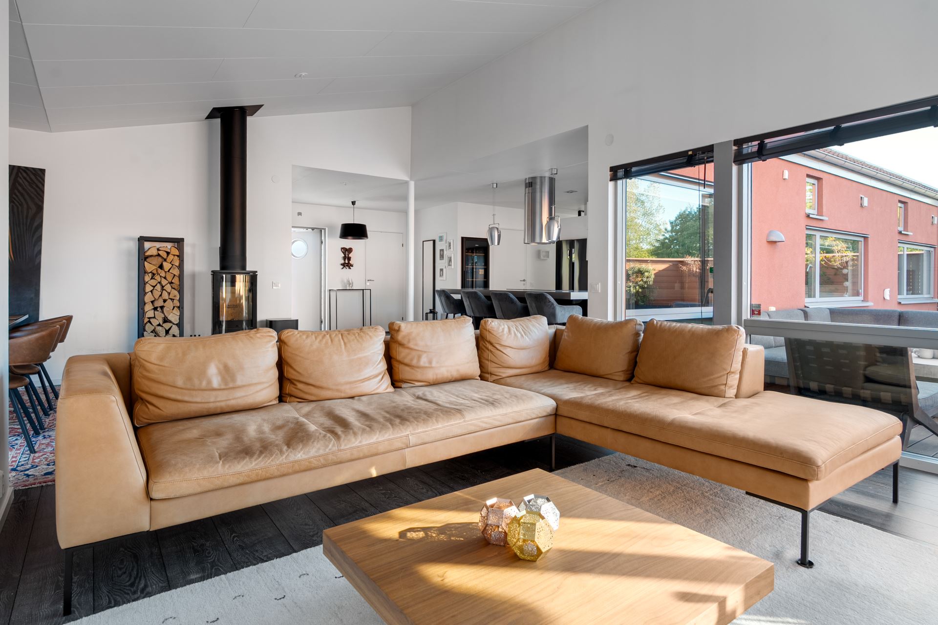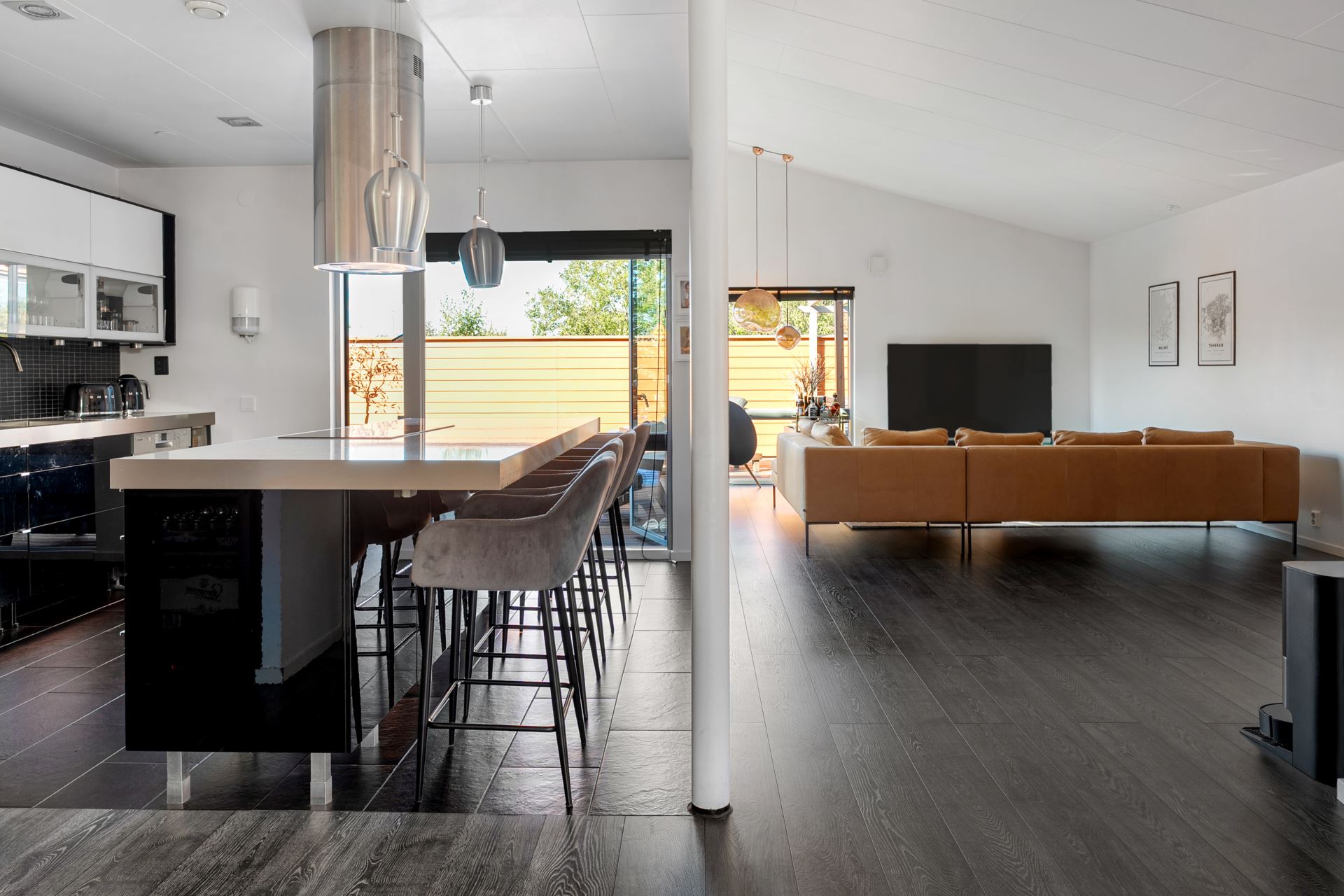 Köket och vardagsrummet ligger i öppen planlösning, där den generösa takhöjden i vardagsrummet tillsammans med de stora fönsterpartierna skapar ett fantastiskt ljusinsläpp och en härlig rymd. Bostaden erbjuder dessutom två helkaklade badrum, varav det ena är utrustat med en stilren bastu som är perfekt för avkoppling. Fyra sovrumsmiljöer ger gott om plats för familjen eller hemmakontor, och här finns även ett praktiskt tvättrum.