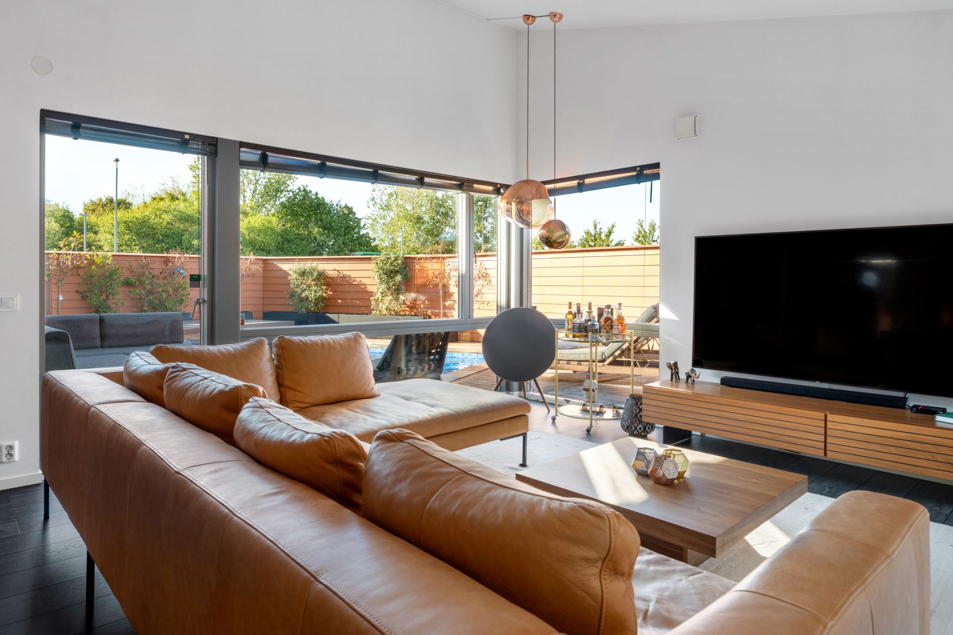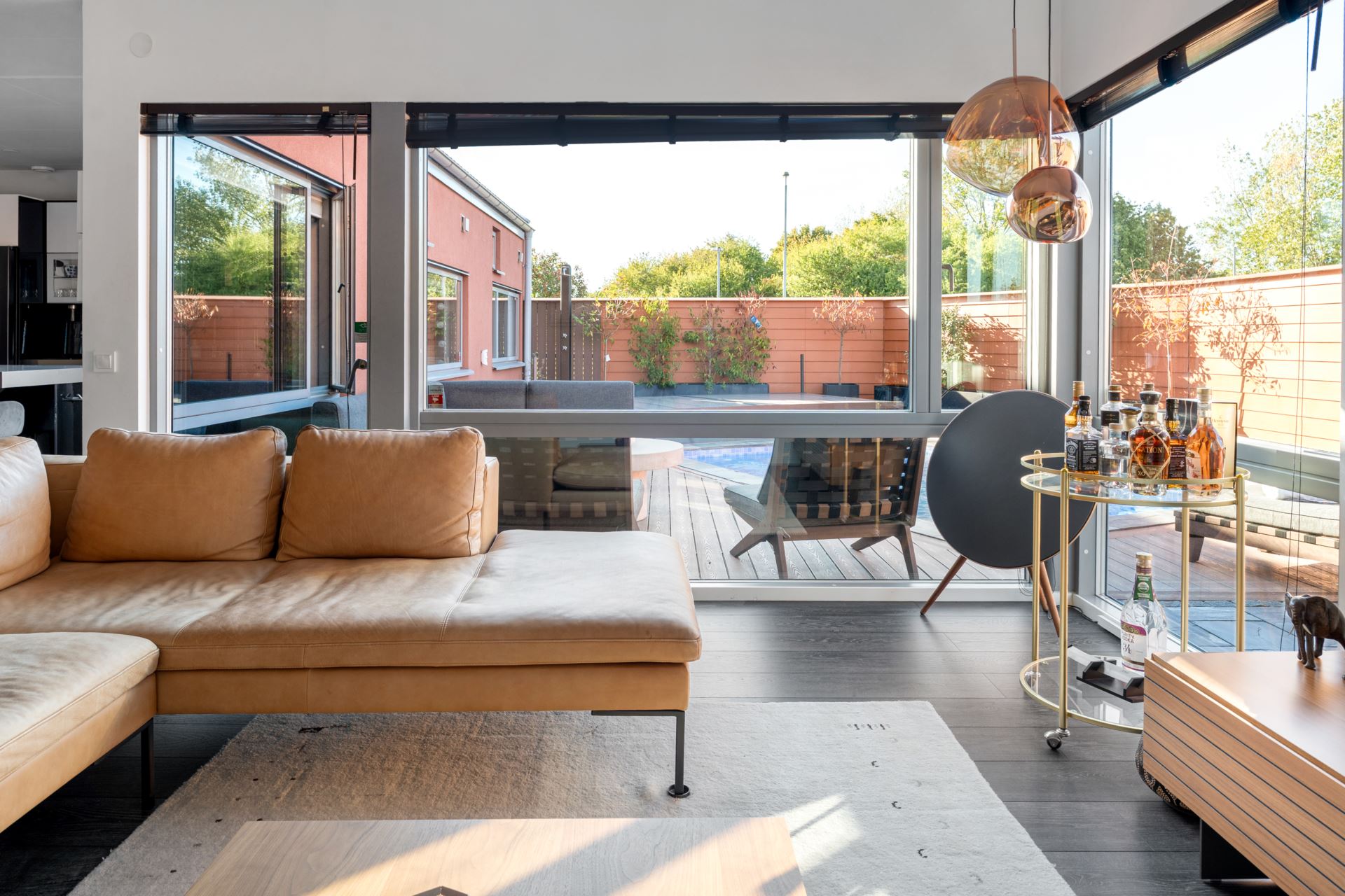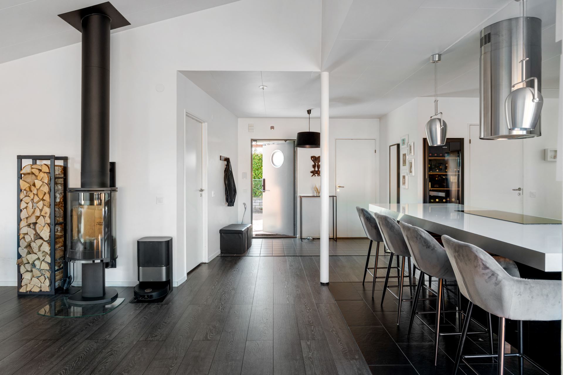 Köket och vardagsrummet ligger i öppen planlösning, där den generösa takhöjden i vardagsrummet tillsammans med de stora fönsterpartierna skapar ett fantastiskt ljusinsläpp och en härlig rymd. Bostaden erbjuder dessutom två helkaklade badrum, varav det ena är utrustat med en stilren bastu som är perfekt för avkoppling. Fyra sovrumsmiljöer ger gott om plats för familjen eller hemmakontor, och här finns även ett praktiskt tvättrum.