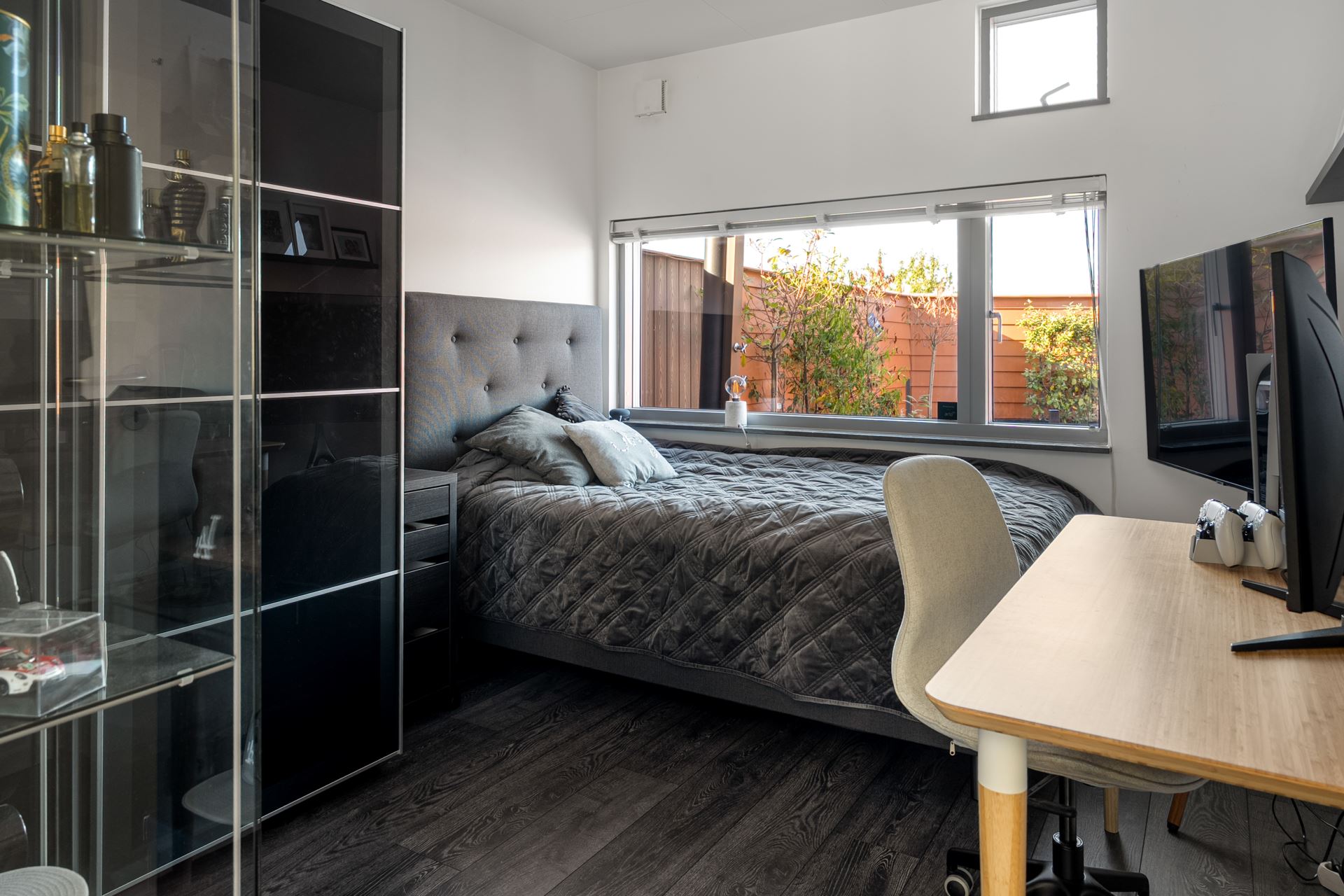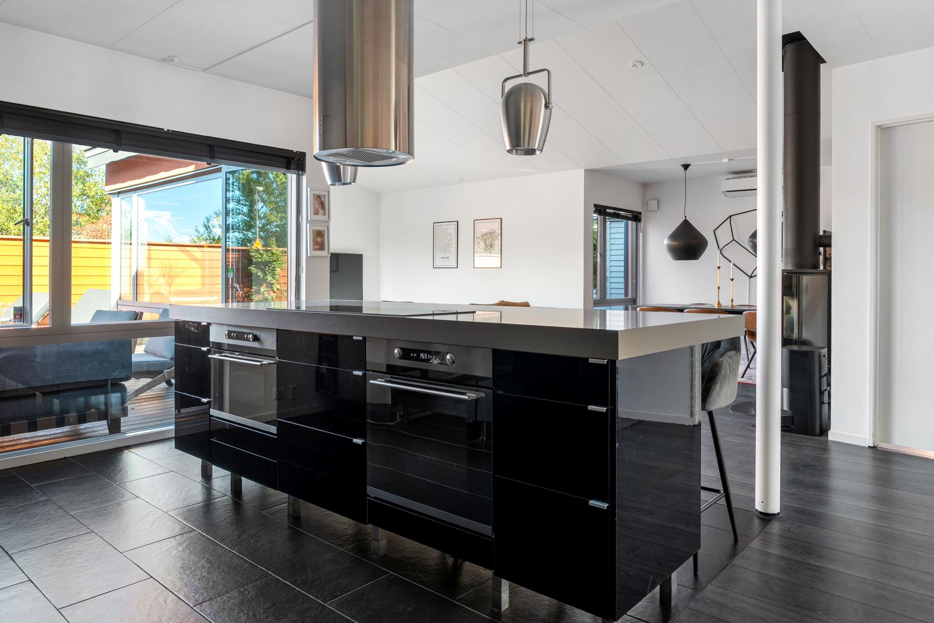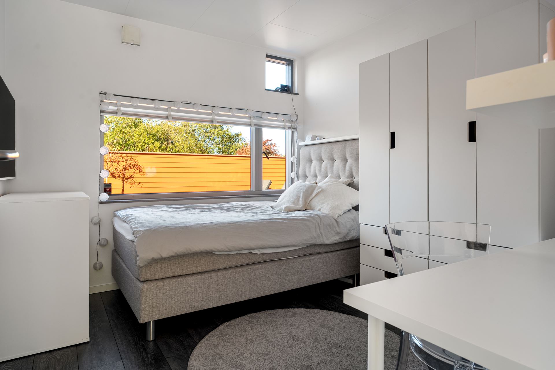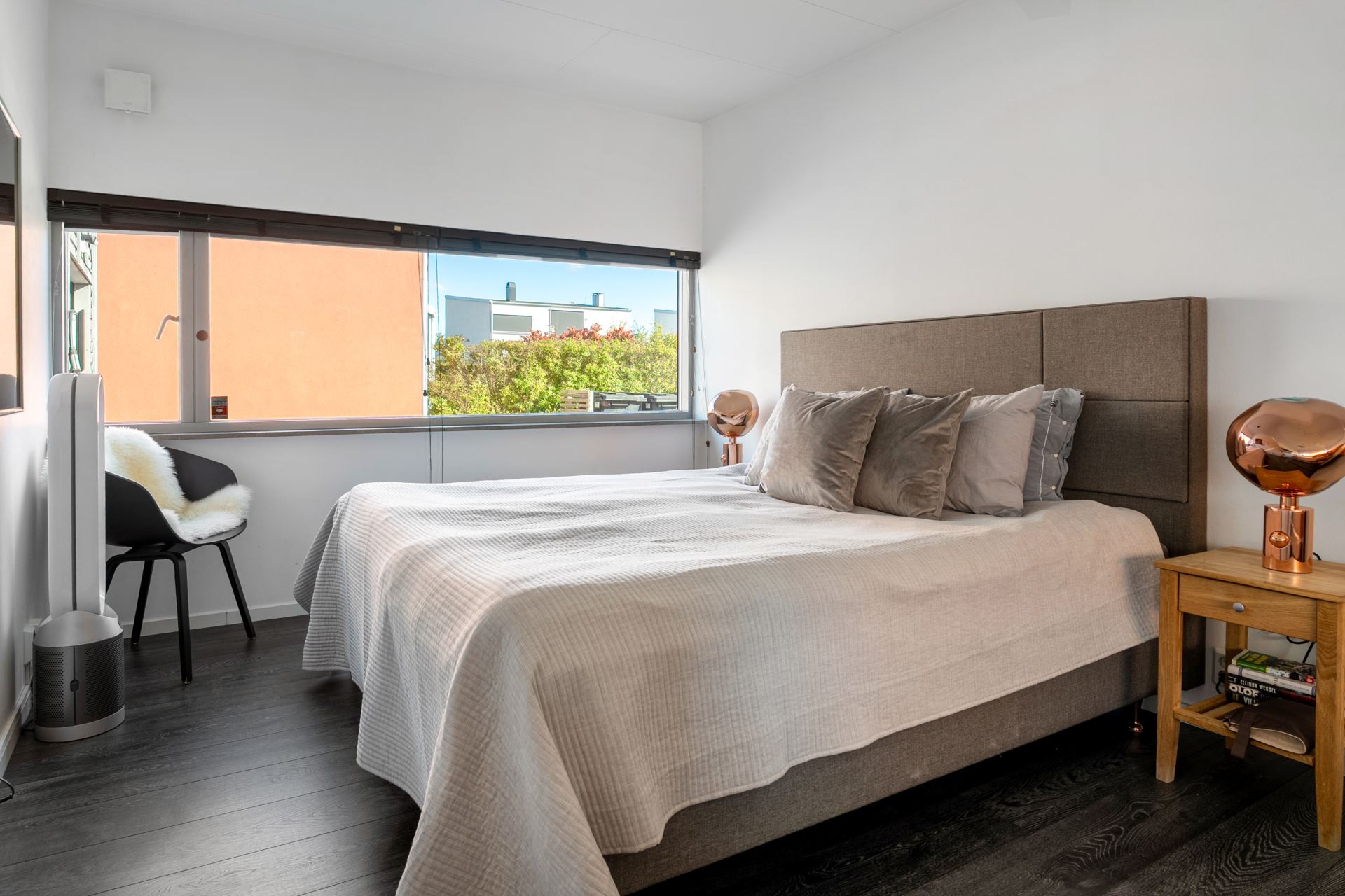 Köket och vardagsrummet ligger i öppen planlösning, där den generösa takhöjden i vardagsrummet tillsammans med de stora fönsterpartierna skapar ett fantastiskt ljusinsläpp och en härlig rymd. Bostaden erbjuder dessutom två helkaklade badrum, varav det ena är utrustat med en stilren bastu som är perfekt för avkoppling. Fyra sovrumsmiljöer ger gott om plats för familjen eller hemmakontor, och här finns även ett praktiskt tvättrum.
