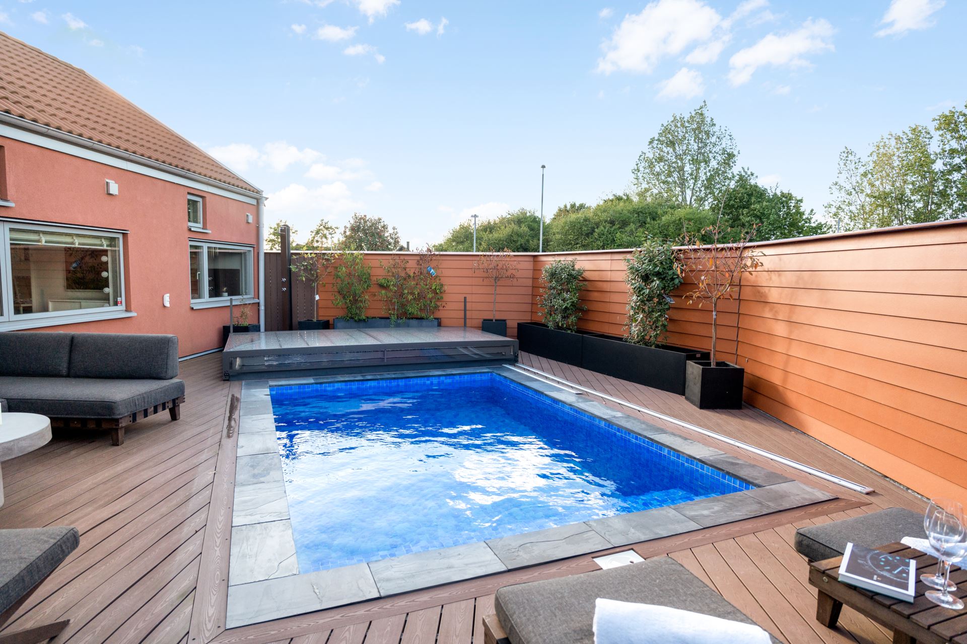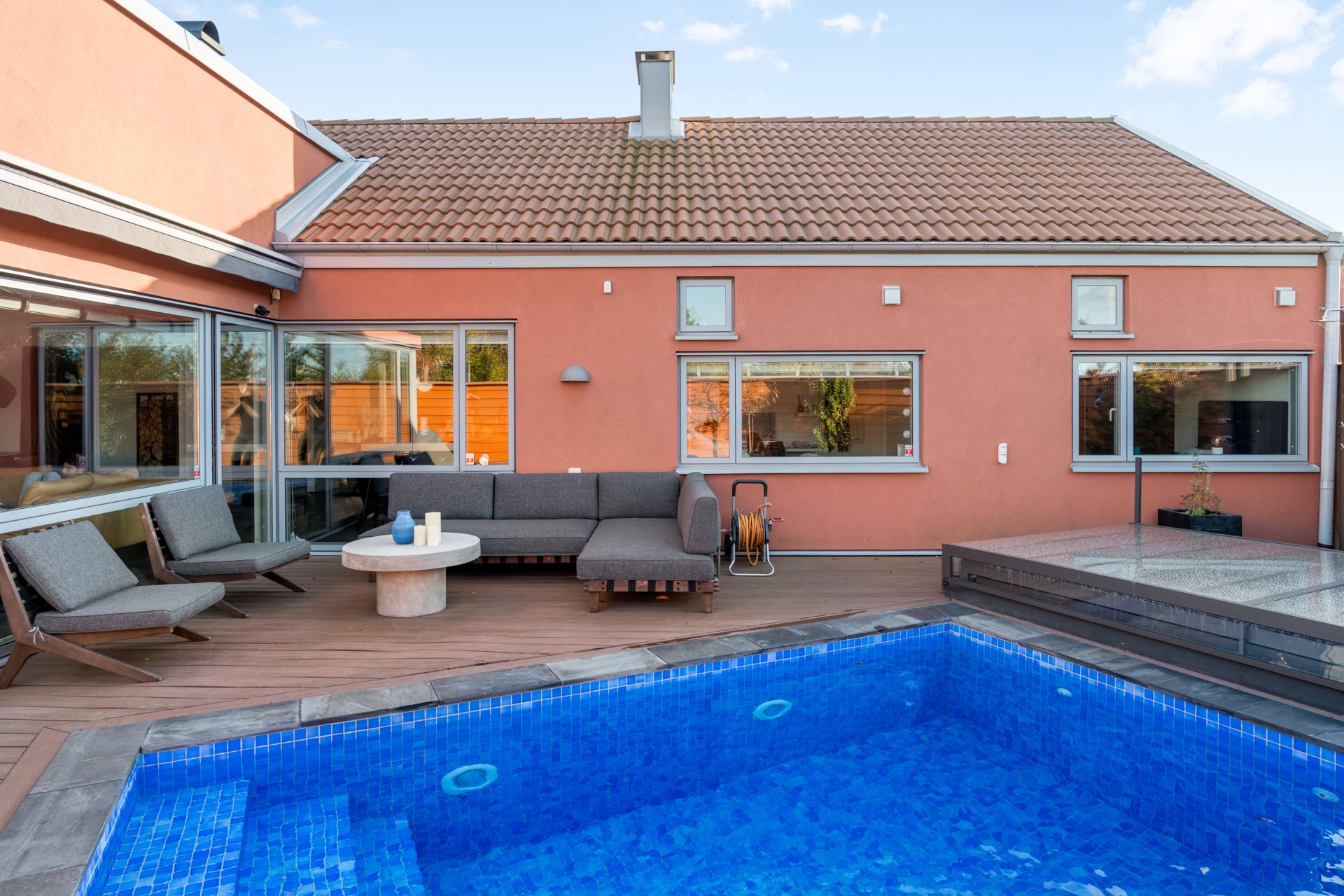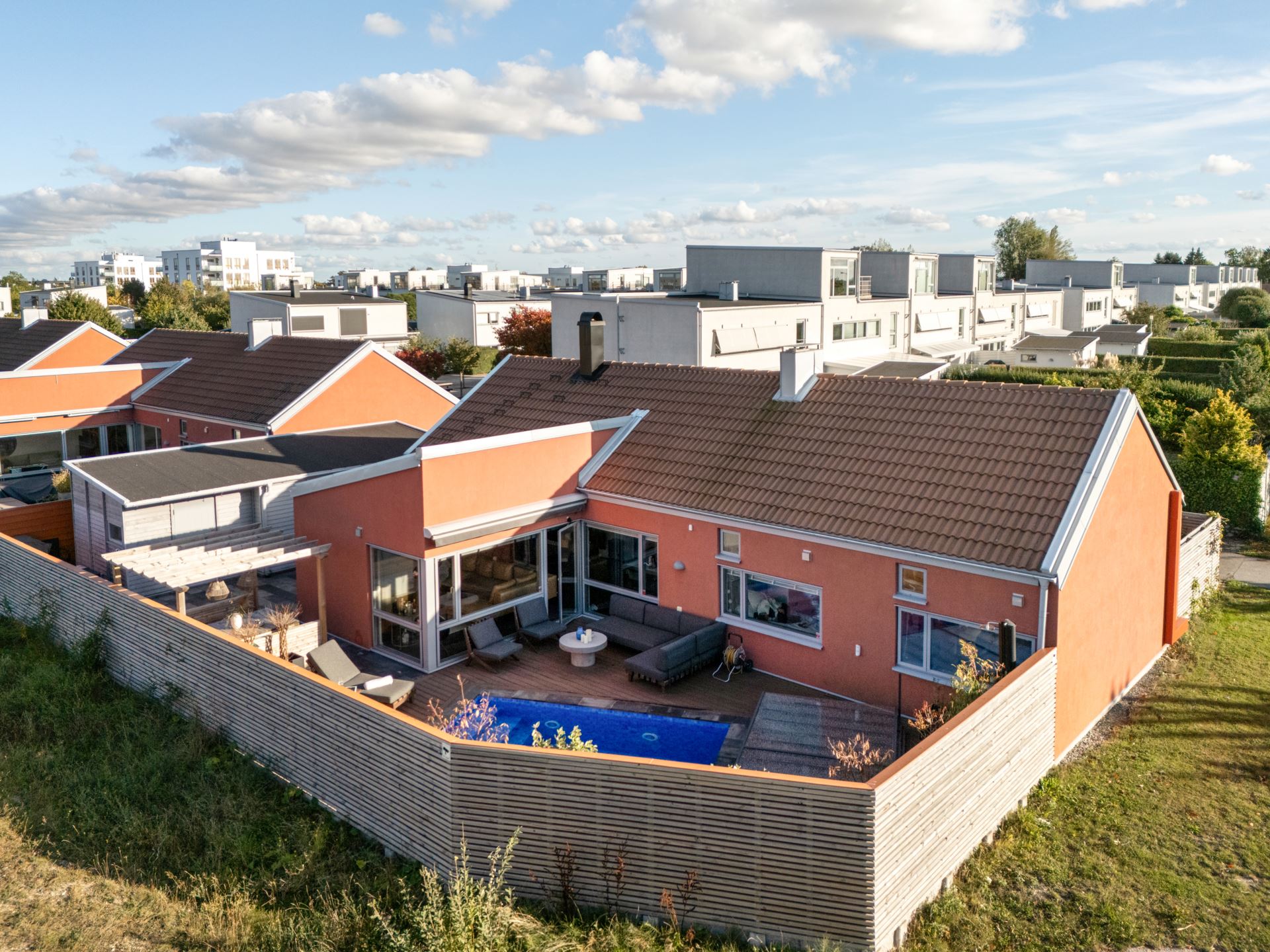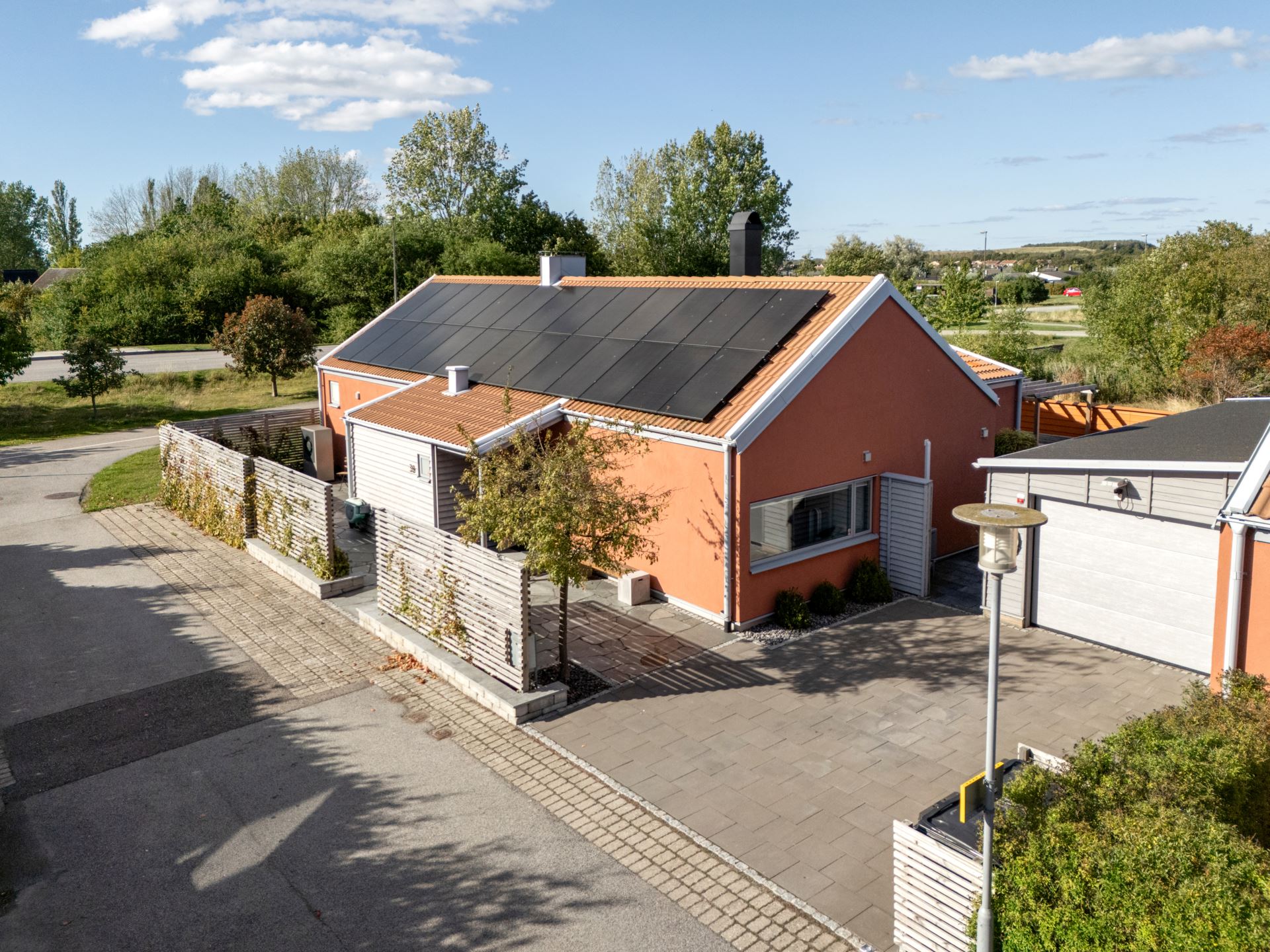 Utemiljön är väl genomtänkt och bjuder på många kvaliteter. På den stenbelagda uppfarten finns både garage och förråd samt gott om utrymme, och en elbilsladdare är installerad för bekväm och energieffektiv laddning. Taket är utrustat med solpaneler som ger ytterligare energieffektiva fördelar, och på baksidan väntar en privat oas med kaklad pool, trädäck, pergola och plats för både avkoppling och sociala stunder.