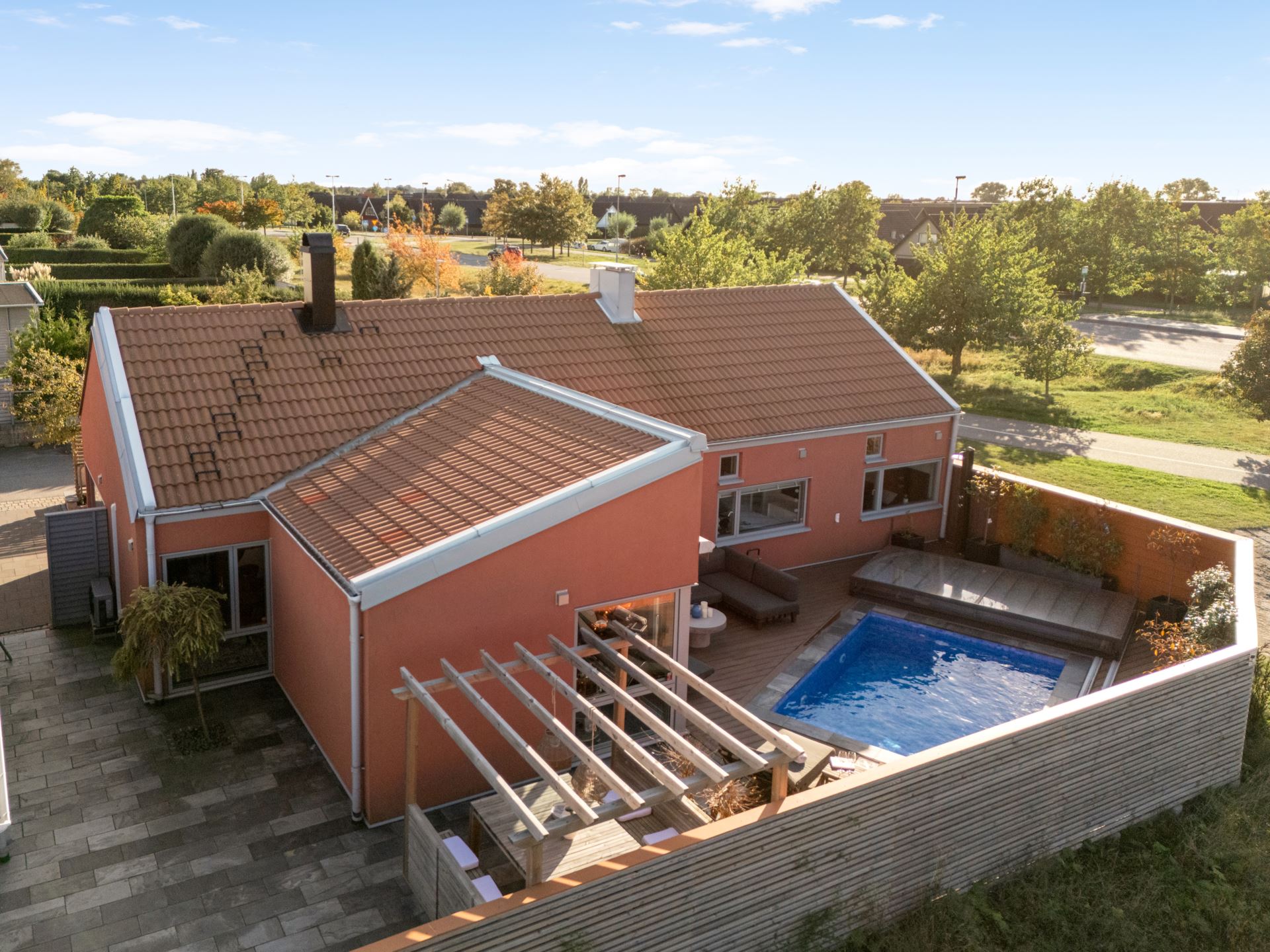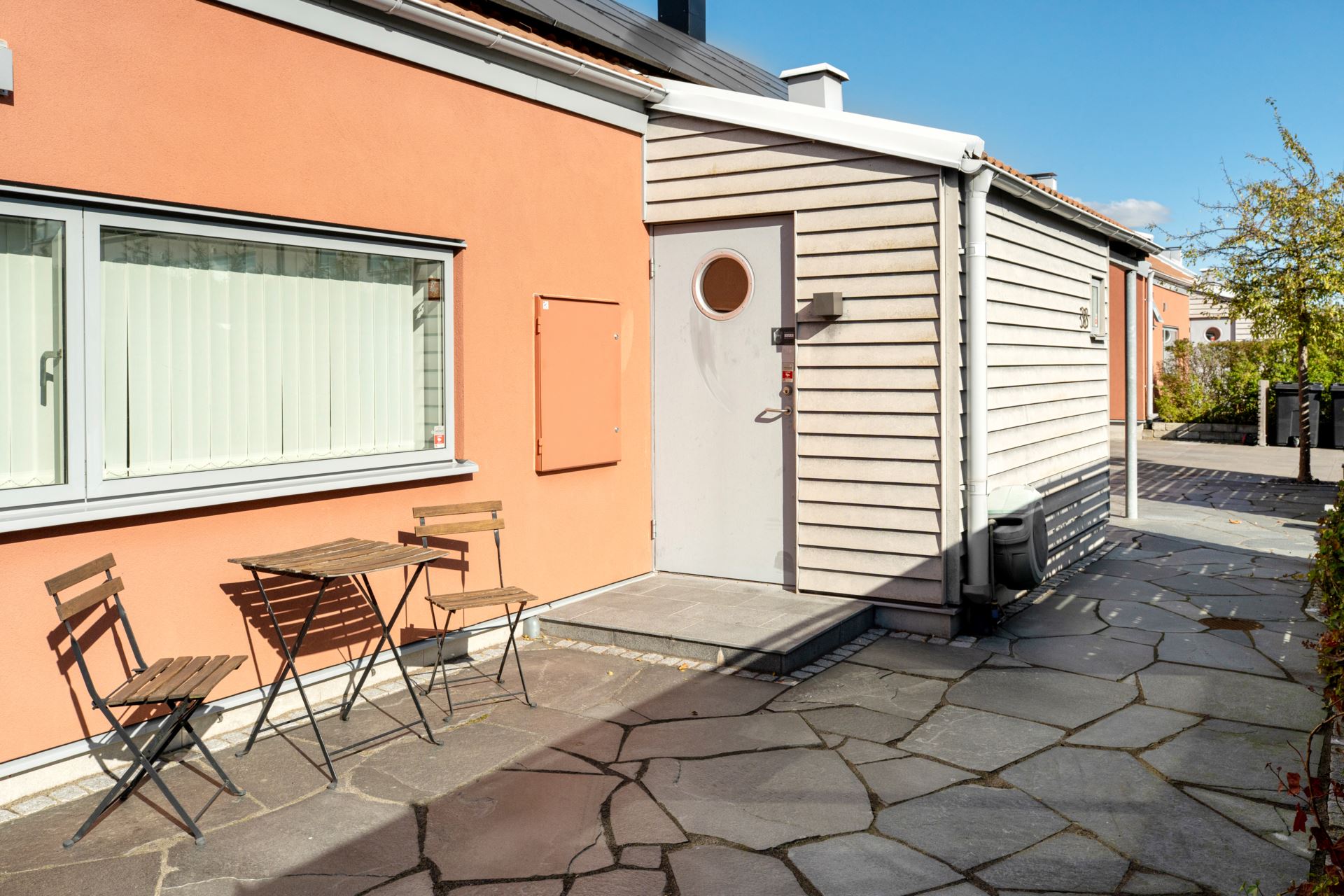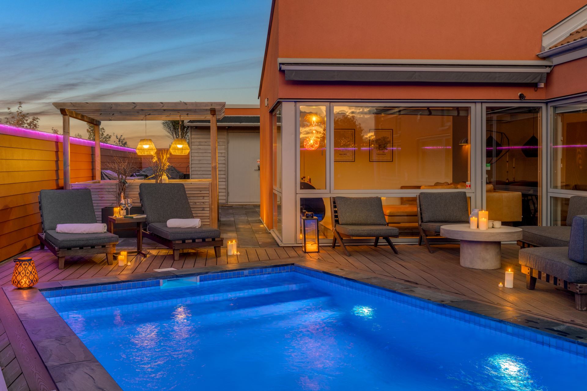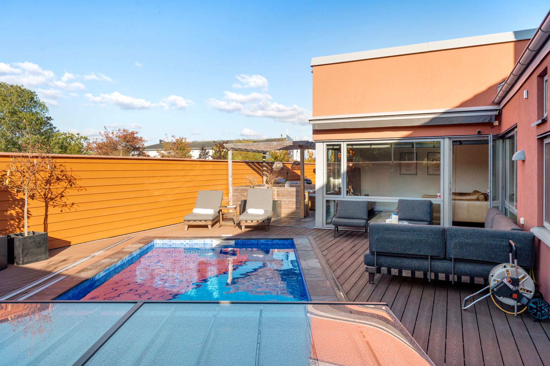 Utemiljön är väl genomtänkt och bjuder på många kvaliteter. På den stenbelagda uppfarten finns både garage och förråd samt gott om utrymme, och en elbilsladdare är installerad för bekväm och energieffektiv laddning. Taket är utrustat med solpaneler som ger ytterligare energieffektiva fördelar, och på baksidan väntar en privat oas med kaklad pool, trädäck, pergola och plats för både avkoppling och sociala stunder.