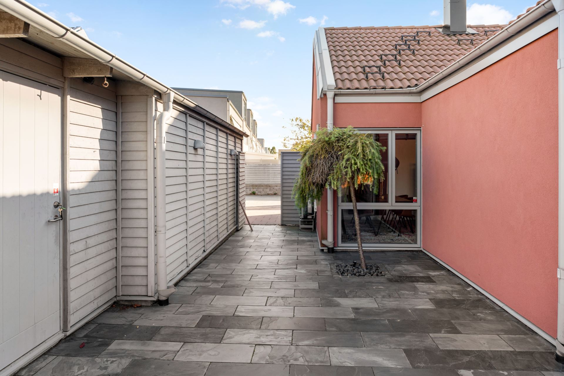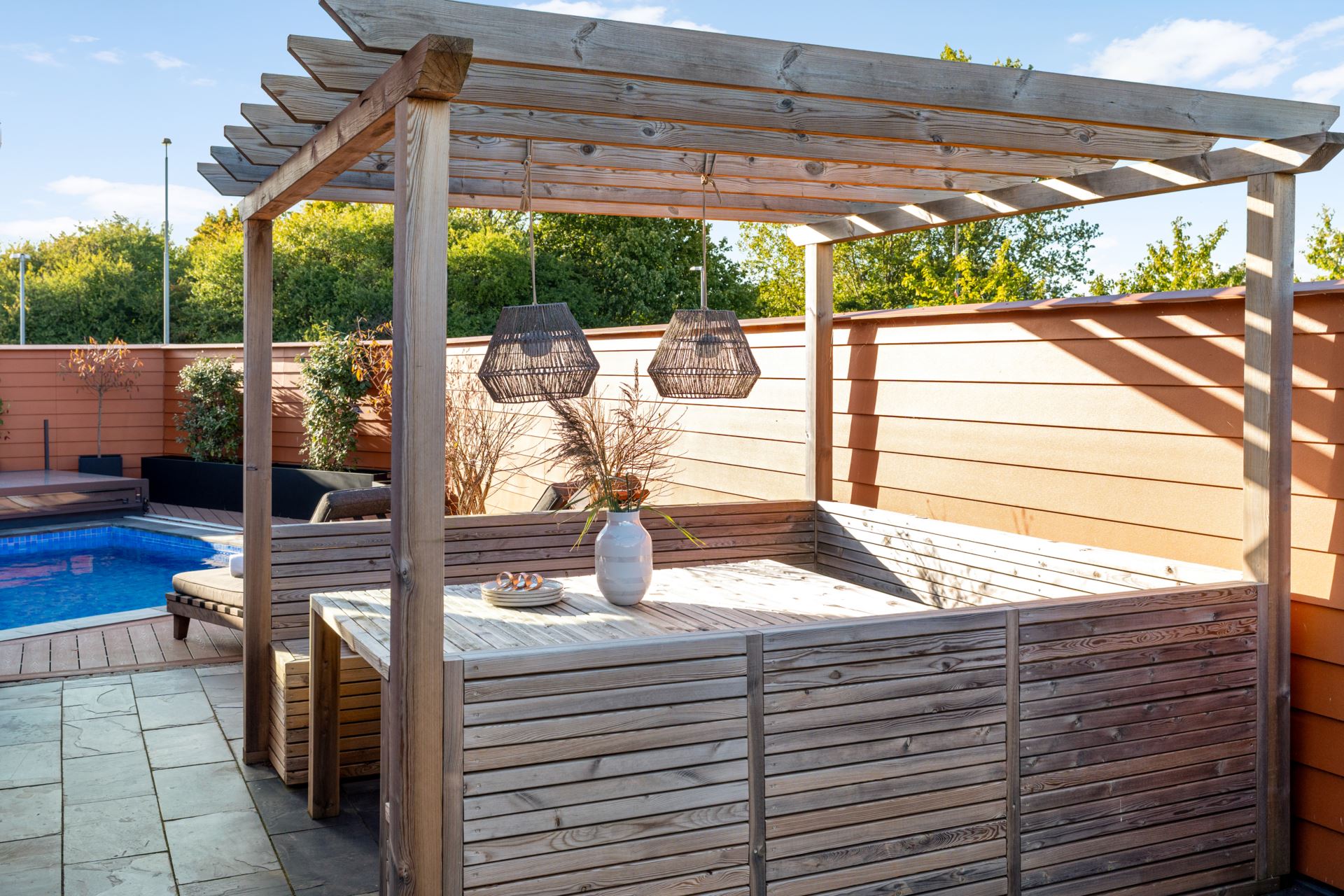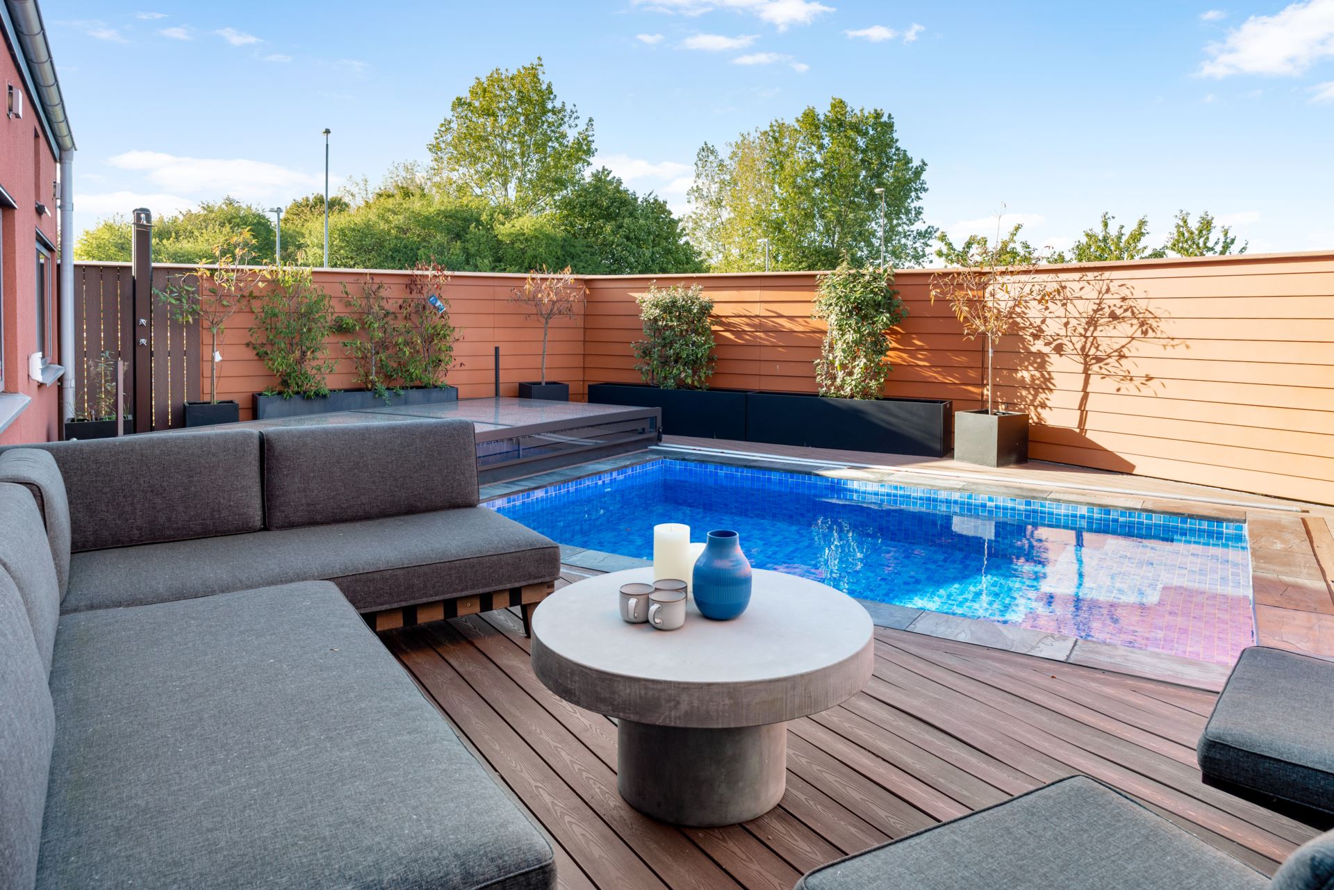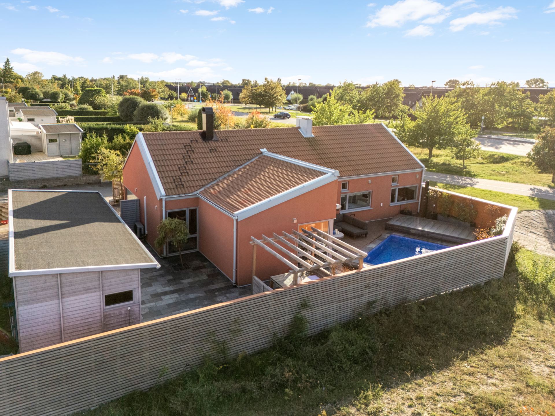 Utemiljön är väl genomtänkt och bjuder på många kvaliteter. På den stenbelagda uppfarten finns både garage och förråd samt gott om utrymme, och en elbilsladdare är installerad för bekväm och energieffektiv laddning. Taket är utrustat med solpaneler som ger ytterligare energieffektiva fördelar, och på baksidan väntar en privat oas med kaklad pool, trädäck, pergola och plats för både avkoppling och sociala stunder.