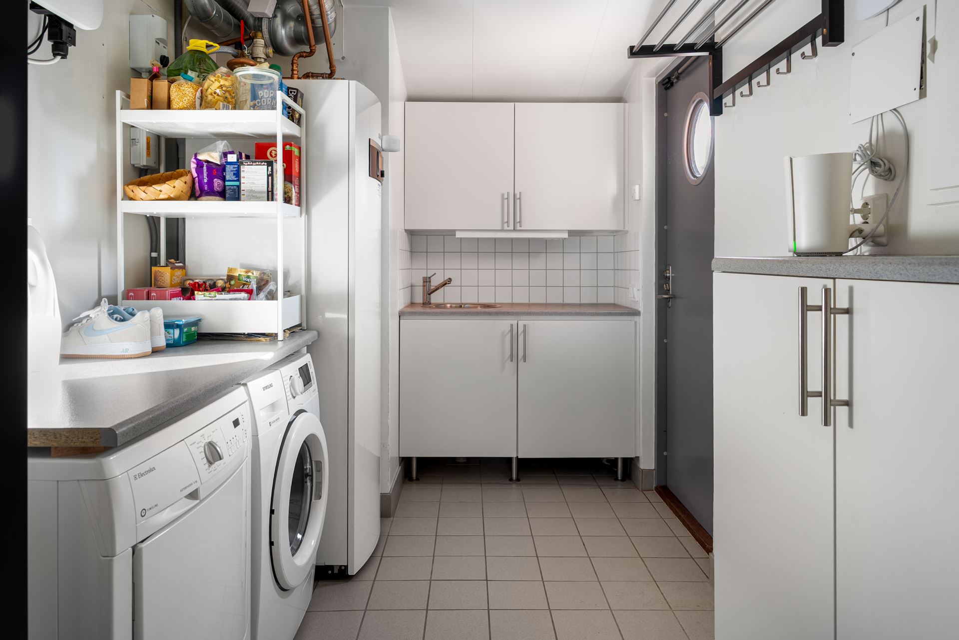 Beige klinker och vitmålade väggar. Här finns tvättmaskin, torktumlare, vask, värmepump och förvaringsskåp. Rummet har även en praktisk groventré.