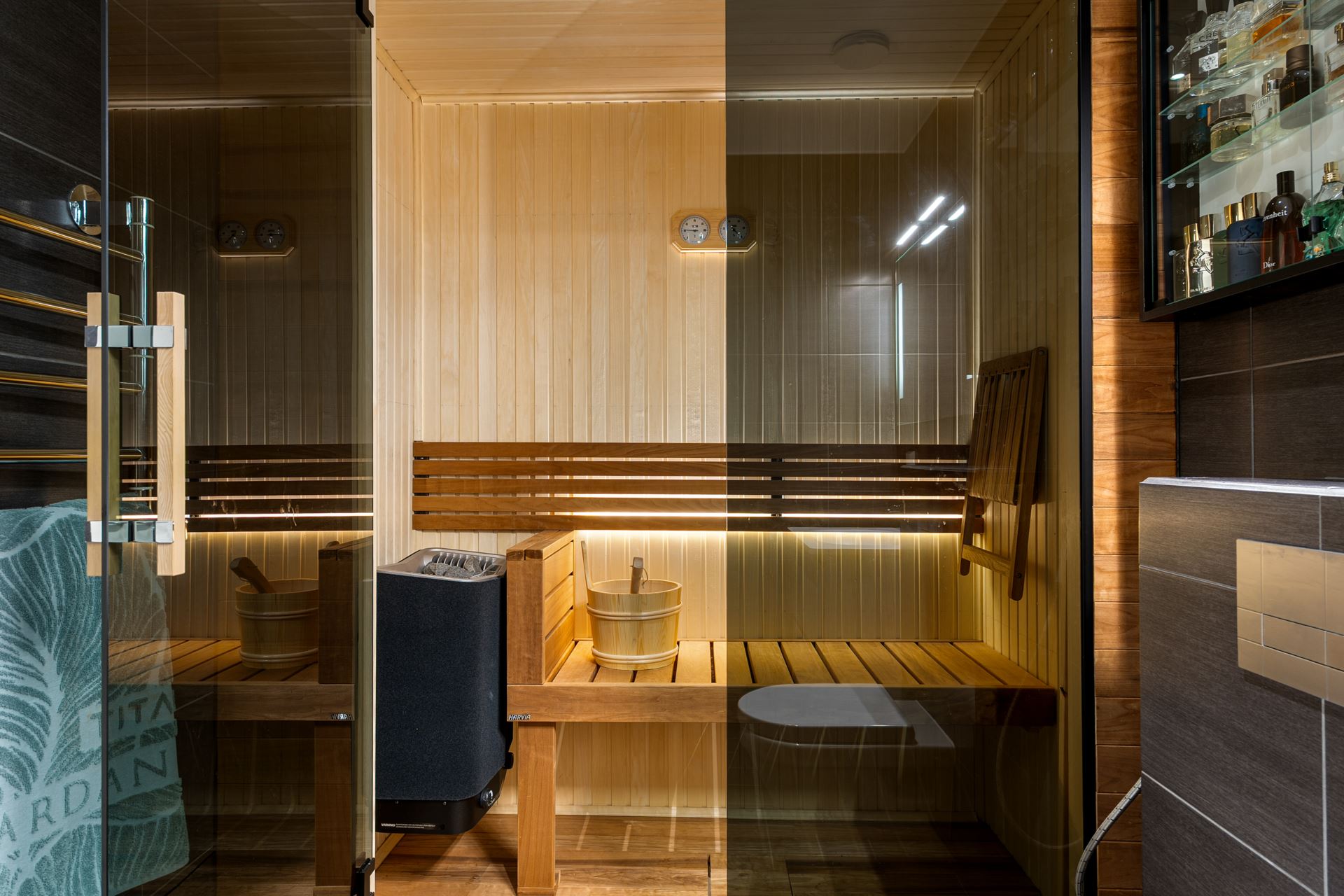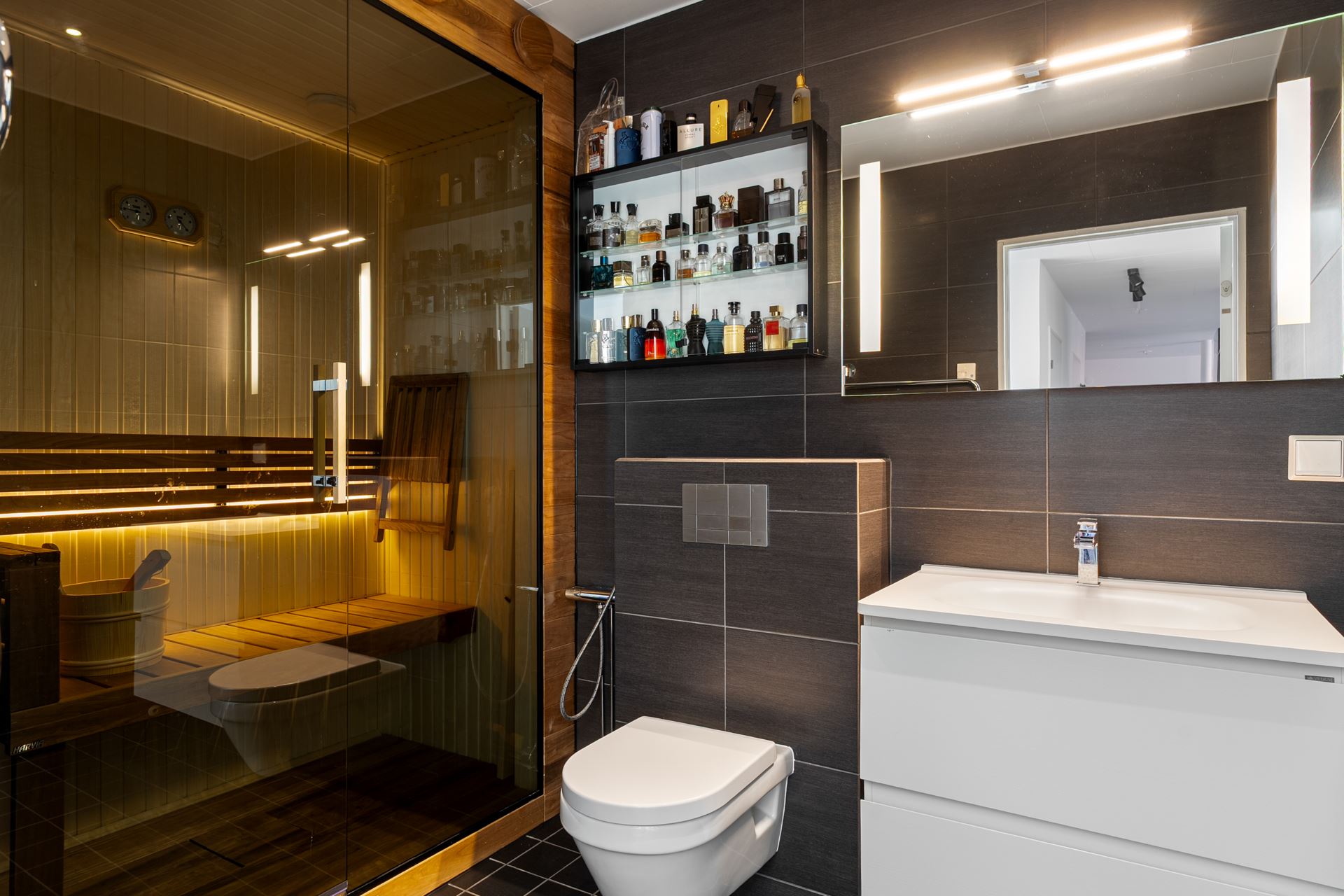 Helkaklat med mörk klinker och kakel. Här finns vägghängd wc, handfat med kommod, spegel med belysning samt en stilren bastu.