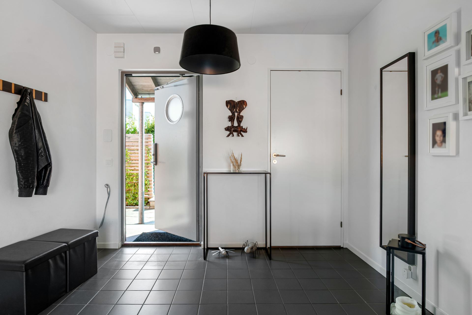 Mörk klinker och vitmålade väggar. Här finns plats för avhängning av ytterkläder och skor samt utrymme för ytterligare förvaringsmöbler.