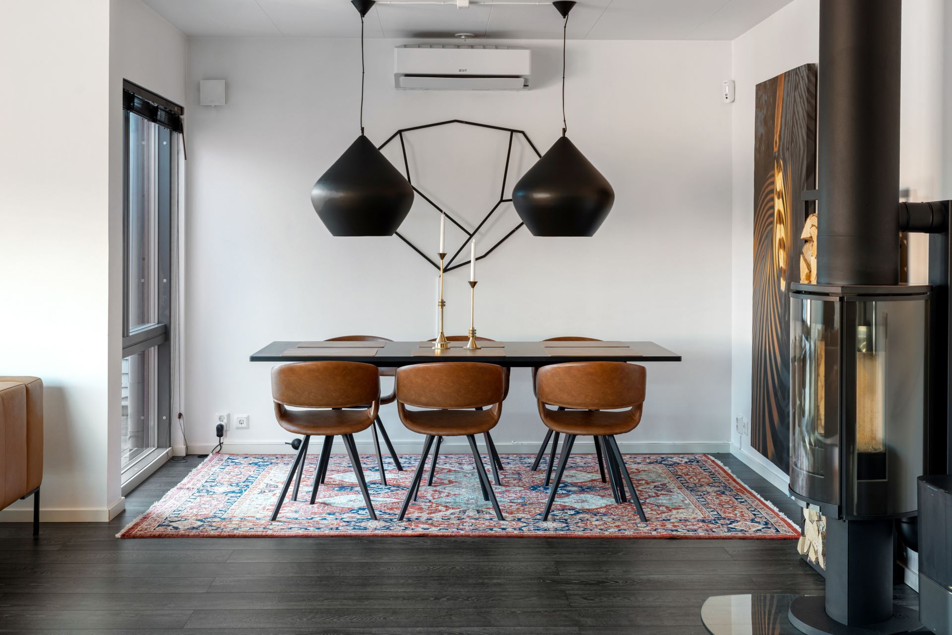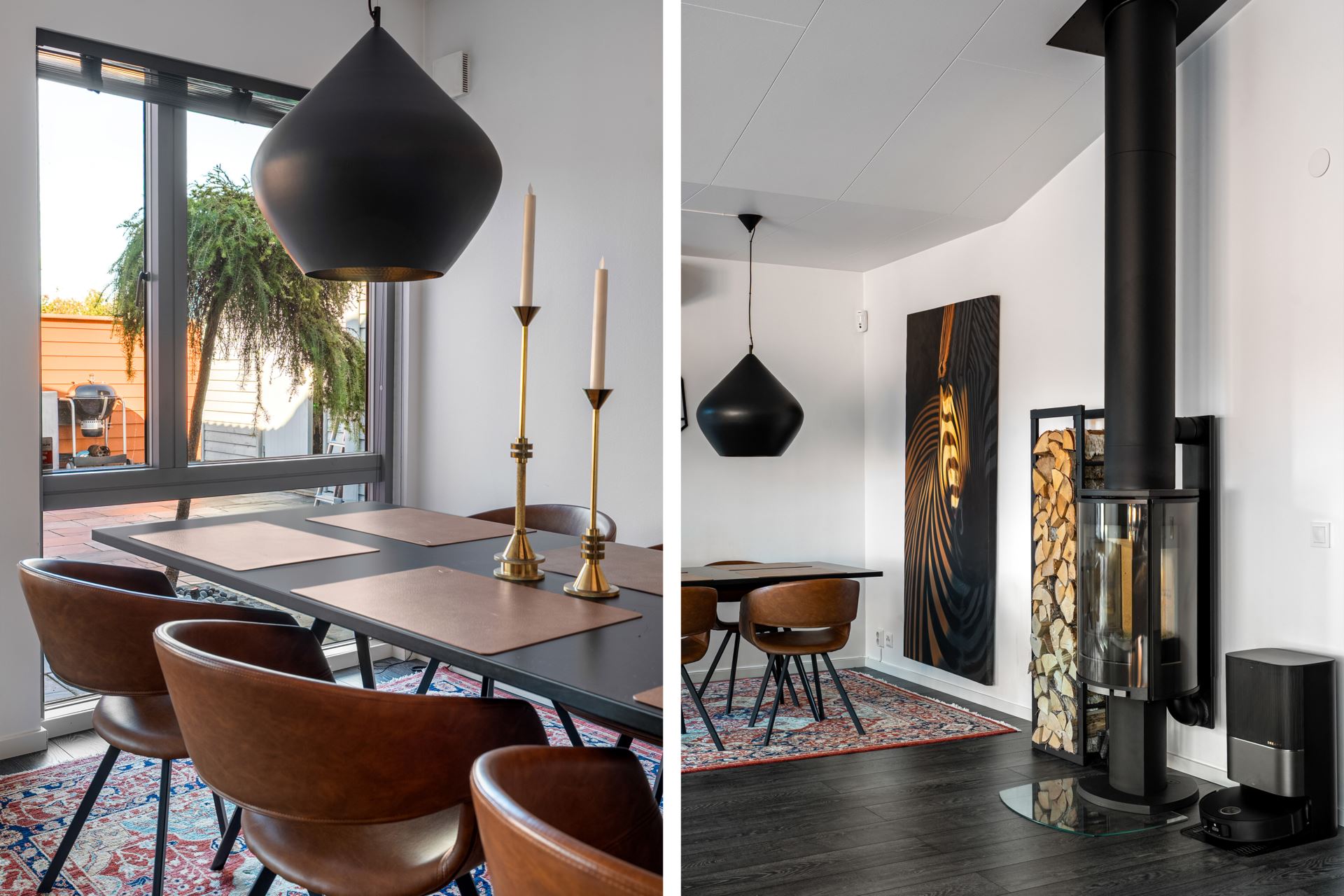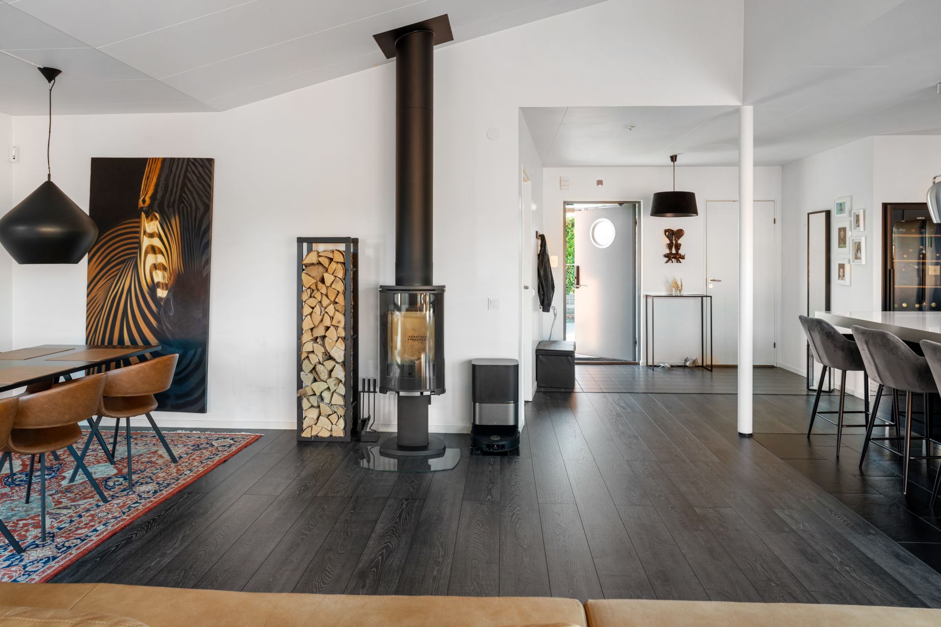 Parkettgolv och vitmålade väggar. Vardagsrummet rymmer en bekväm soffa, matbord och ytterligare möblemang. Den generösa takhöjden och de stora fönstren bidrar till en öppen och ljus atmosfär, medan en stilren braskamin tillför både värme och stämning i rummet.