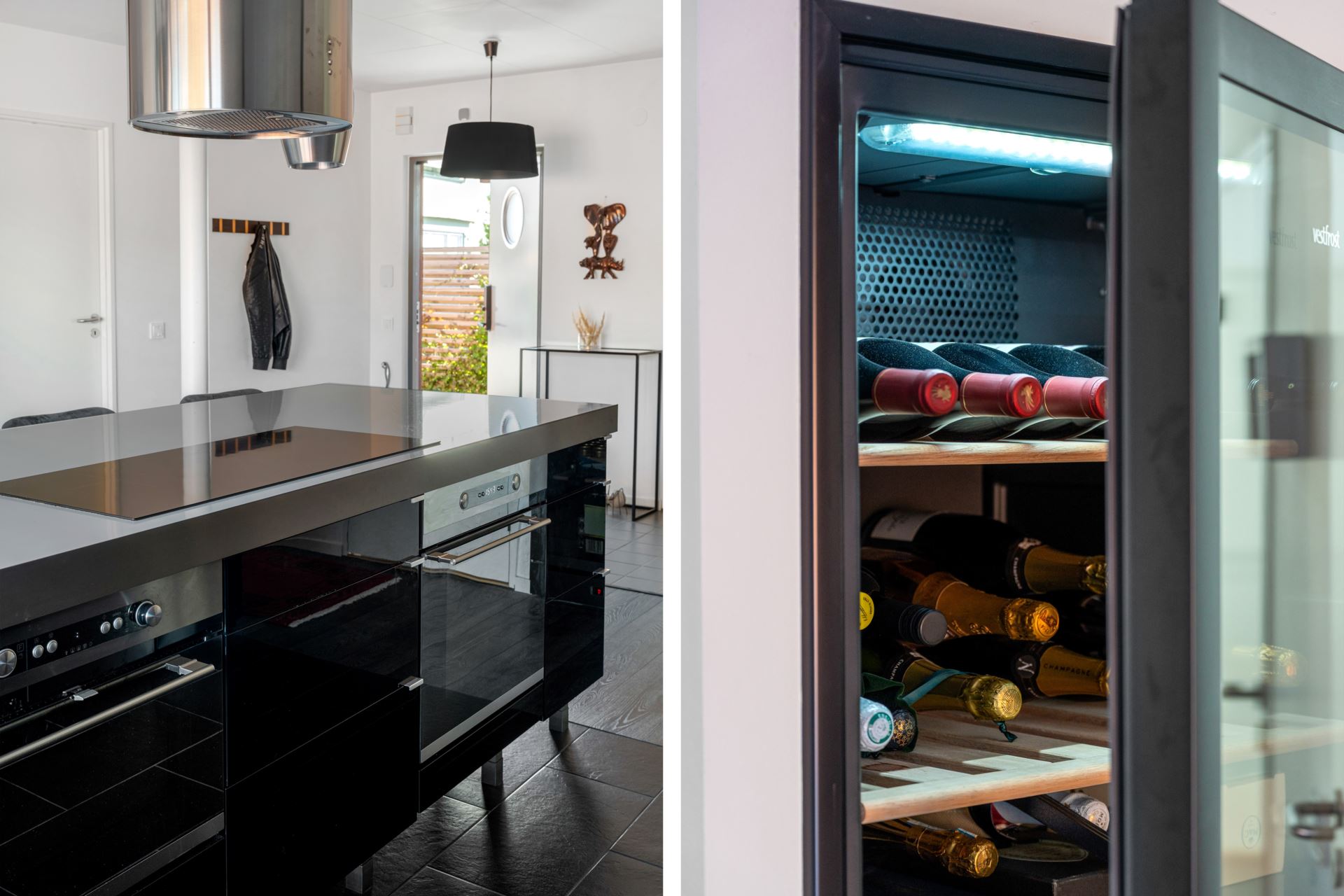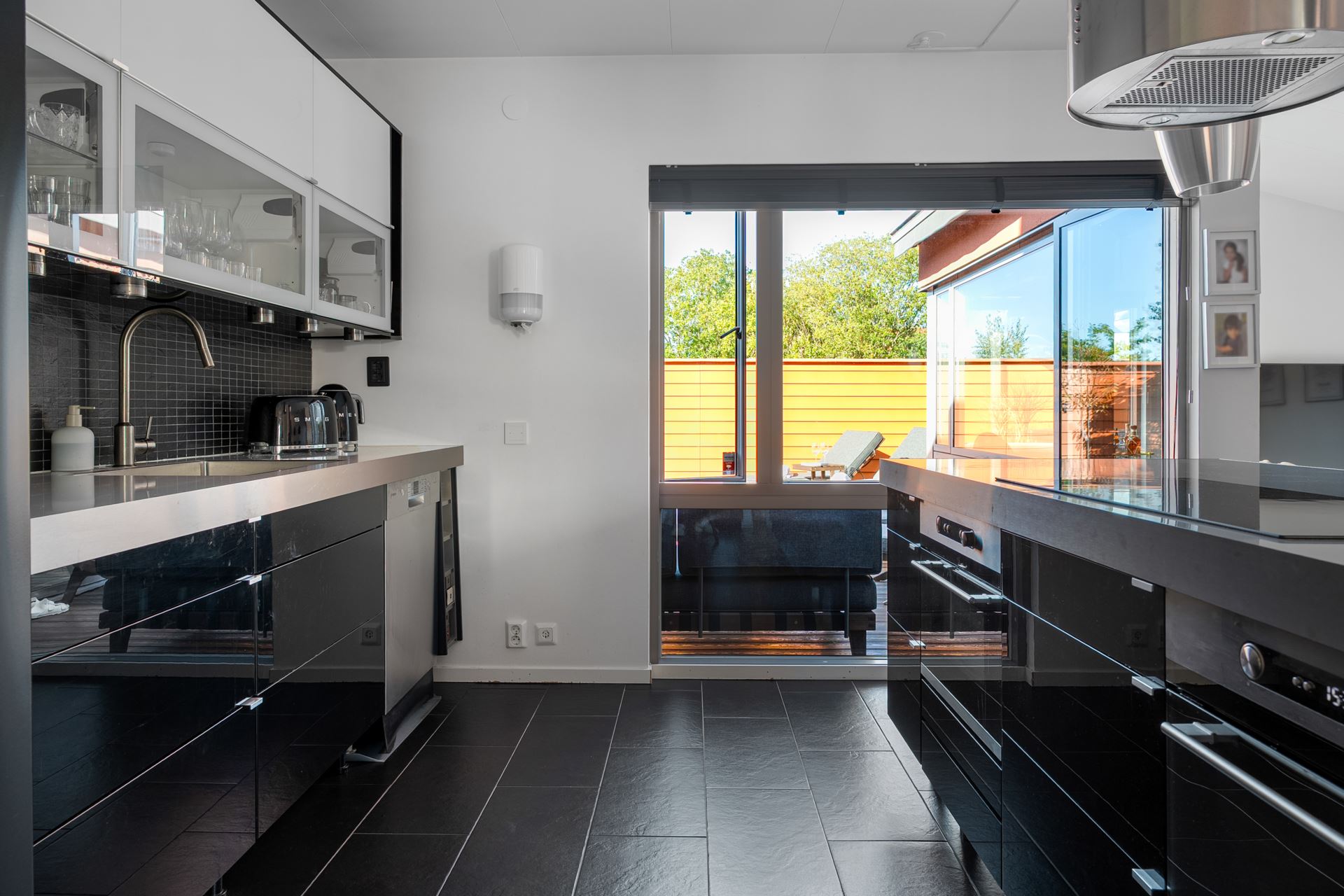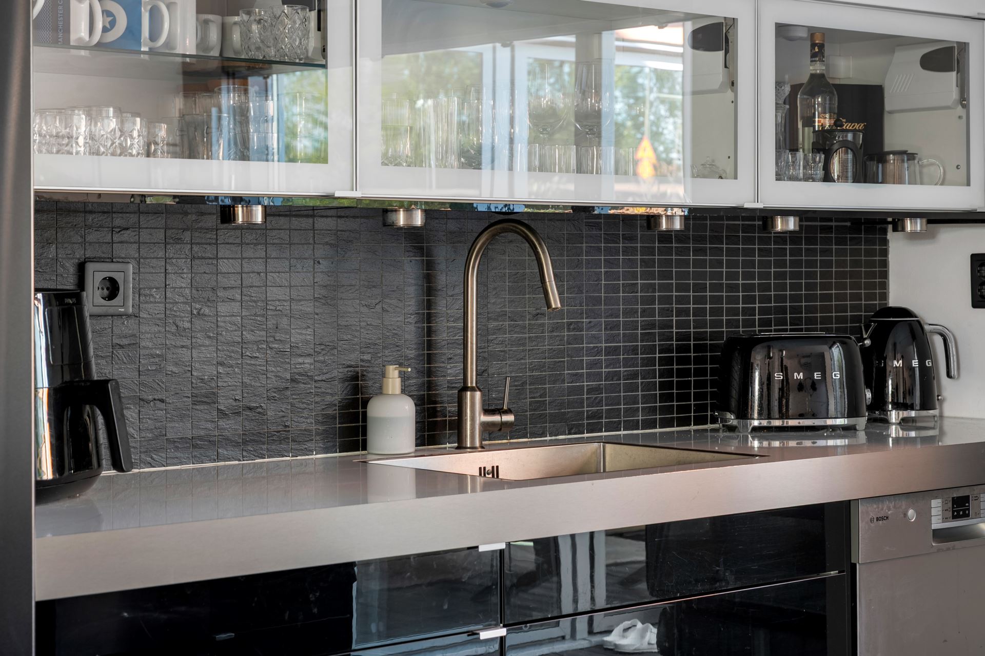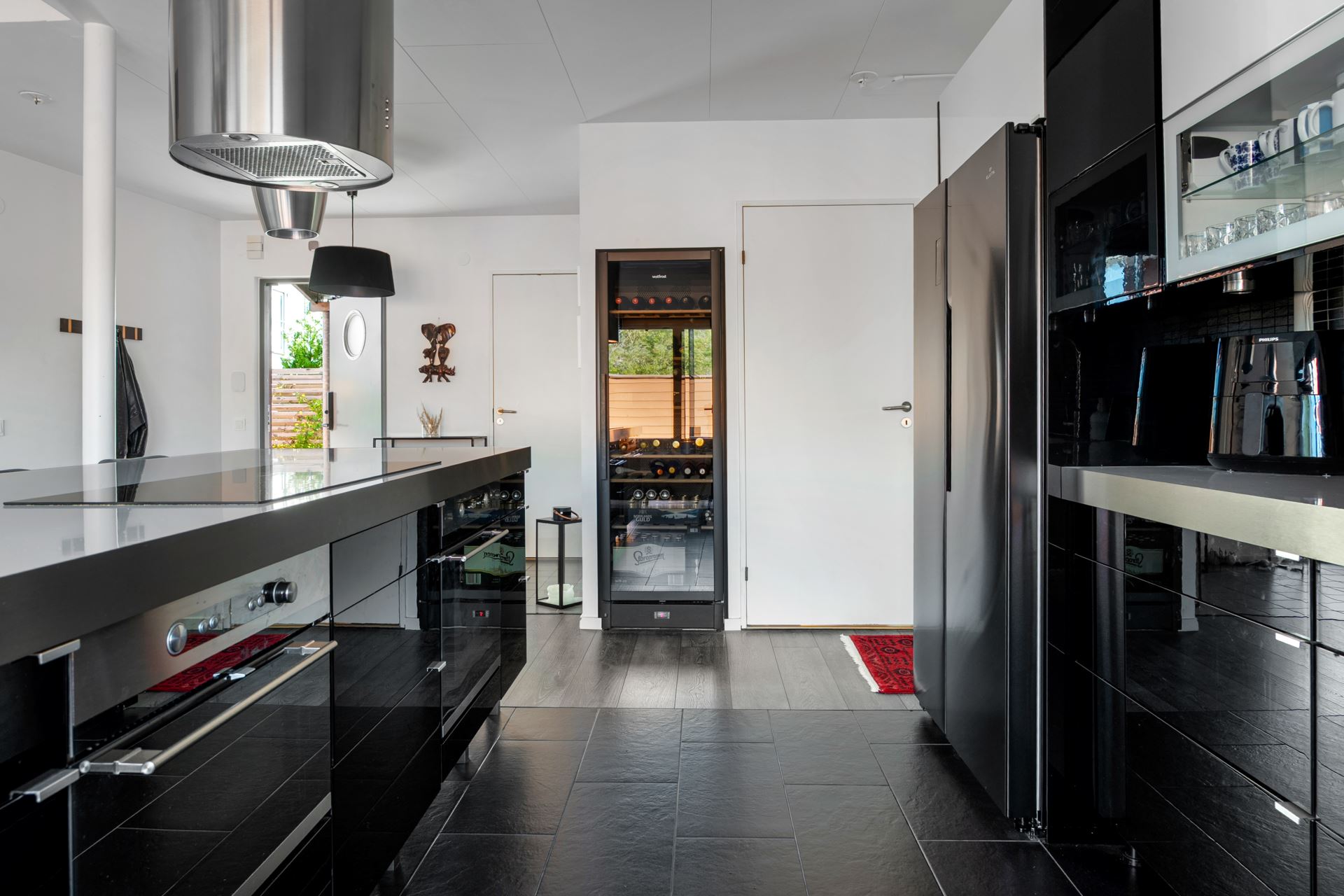 Mörk klinker och vitmålade väggar. Köket ligger i öppen planlösning med vardagsrummet, vilket skapar en luftig och social känsla. Förvaringen är generös bakom svarta, glansiga luckor i kombination med vitrinskåp och vita luckor som harmonierar fint med den ljusa bänkskivan och den mörka mosaiken ovanför. En köksö i samma utförande erbjuder extra arbetsyta, förvaring och plats för fyra barstolar. Den maskinella utrustningen består av kyl och frys i fullhöjd, diskmaskin, vinkyl, induktionshäll, fläkt, ugn och mikrovågsugn.