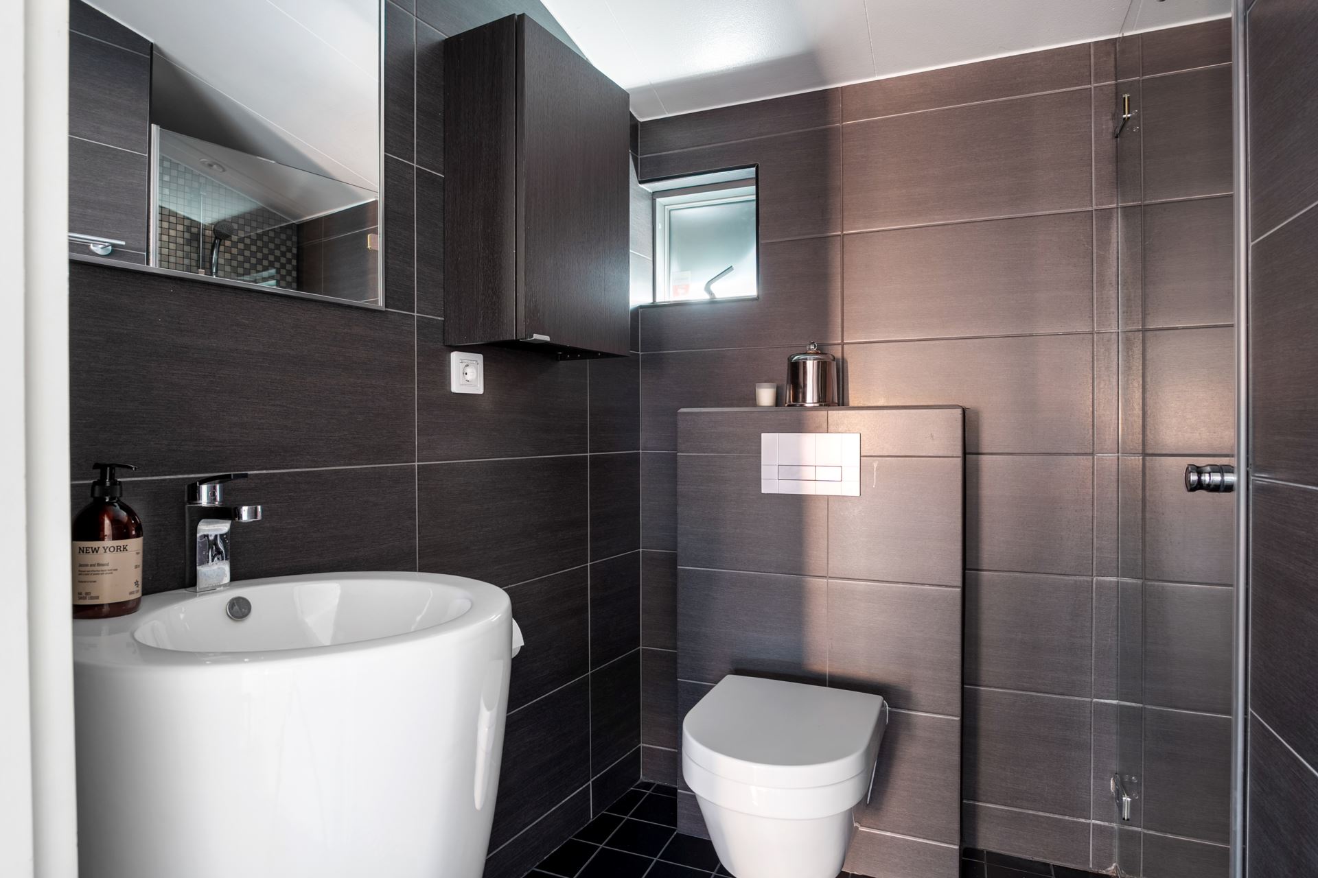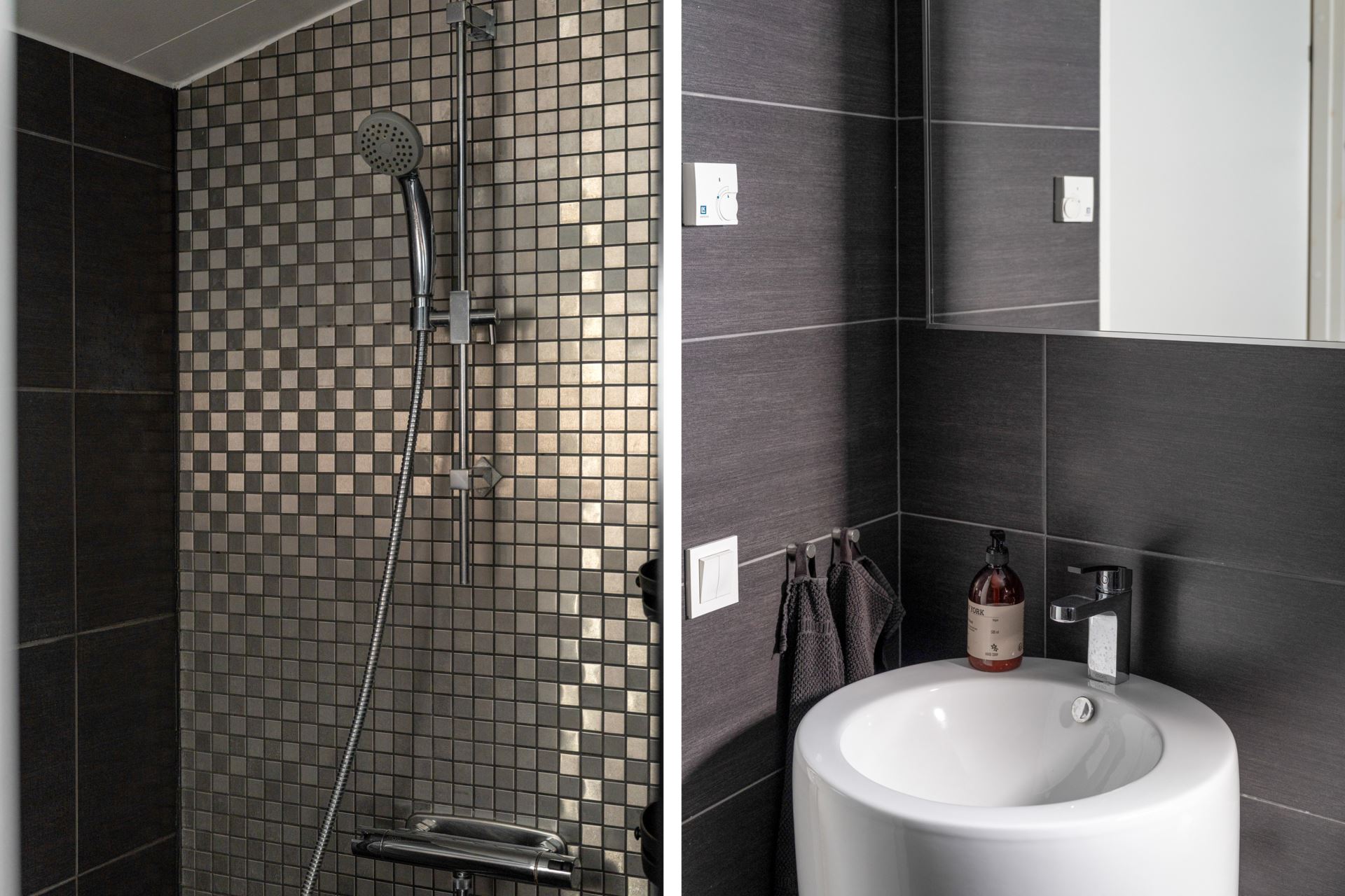 Helkaklat med mörk klinker, kakel och mosaik. Inrett med vägghängd wc, handfat, spegel, förvaringsskåp och en duschhörna med vikbara glasväggar.