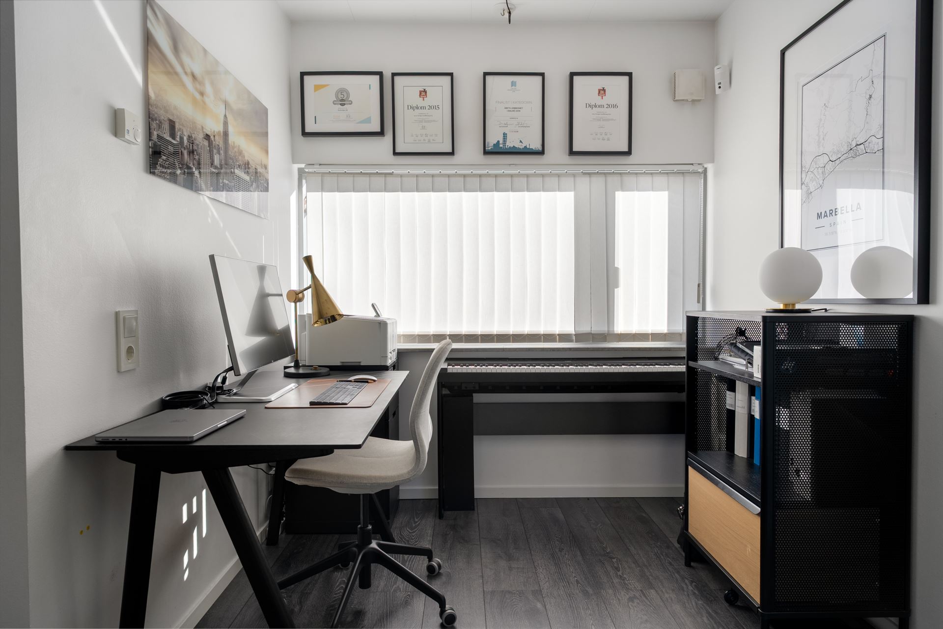 Parkettgolv och vitmålade väggar. En hörna som passar perfekt som kontor eller kan anpassas efter behov och önskemål.