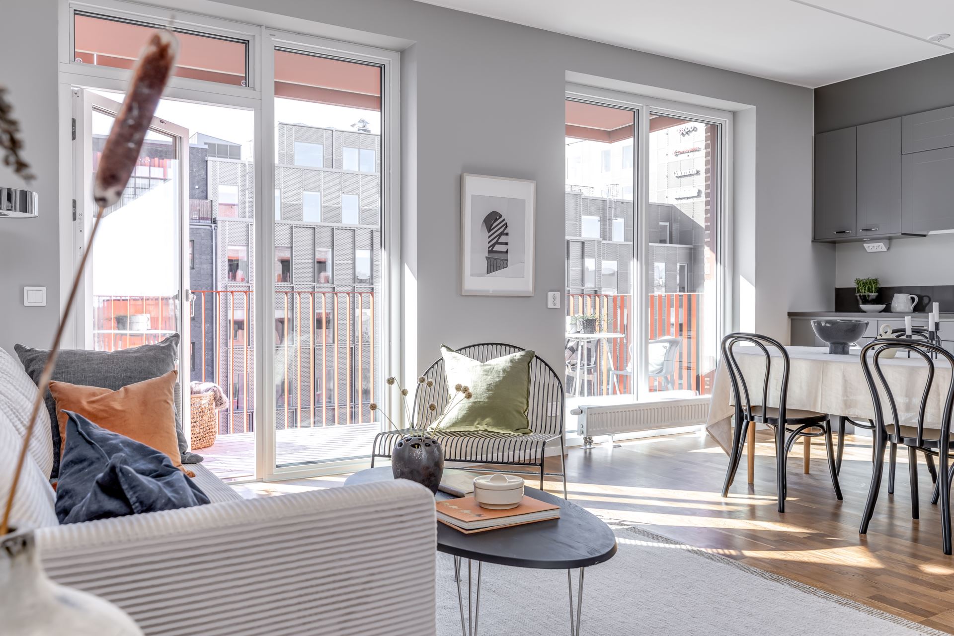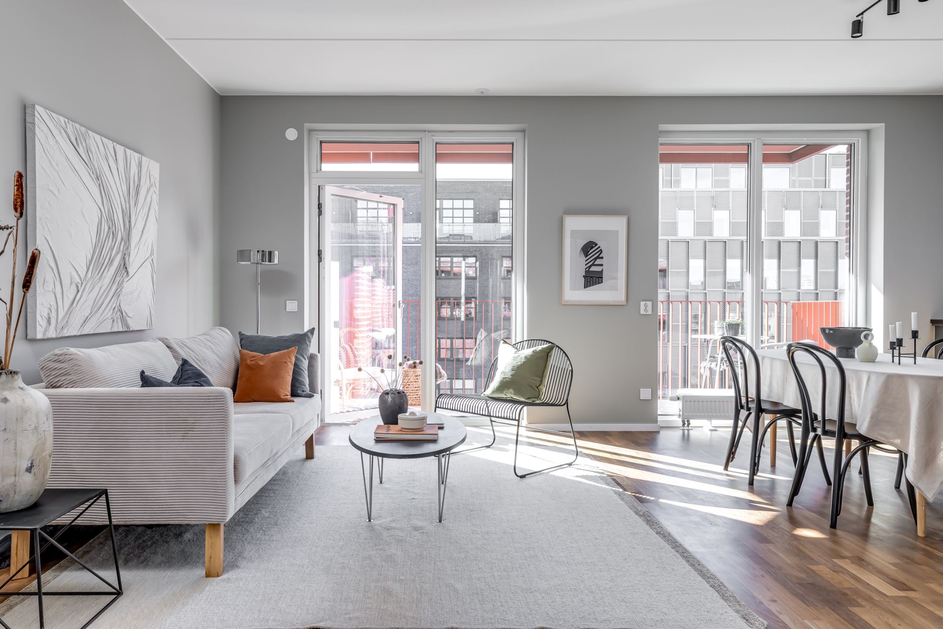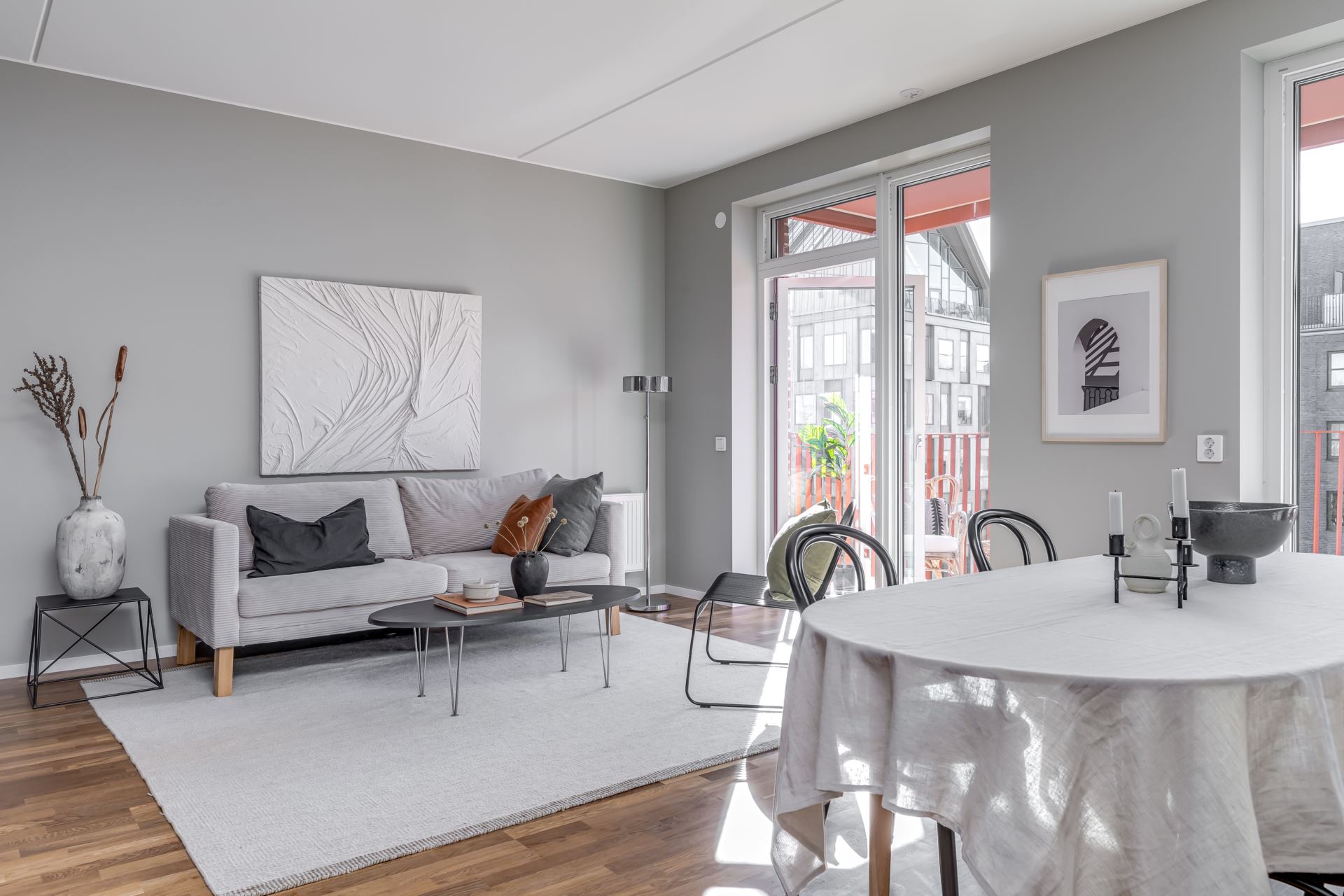 Ljust och luftigt vardagsrum i social och öppen planlösning mot köket. Väggar i snygg grå nyans och parkettgolv i mörk ek. Härifrån nås även lägenhetens andra balkong som ligger i rakt söderläge och bjuder på många härliga soltimmar.