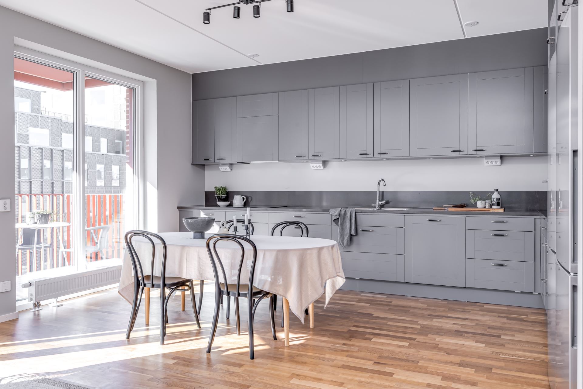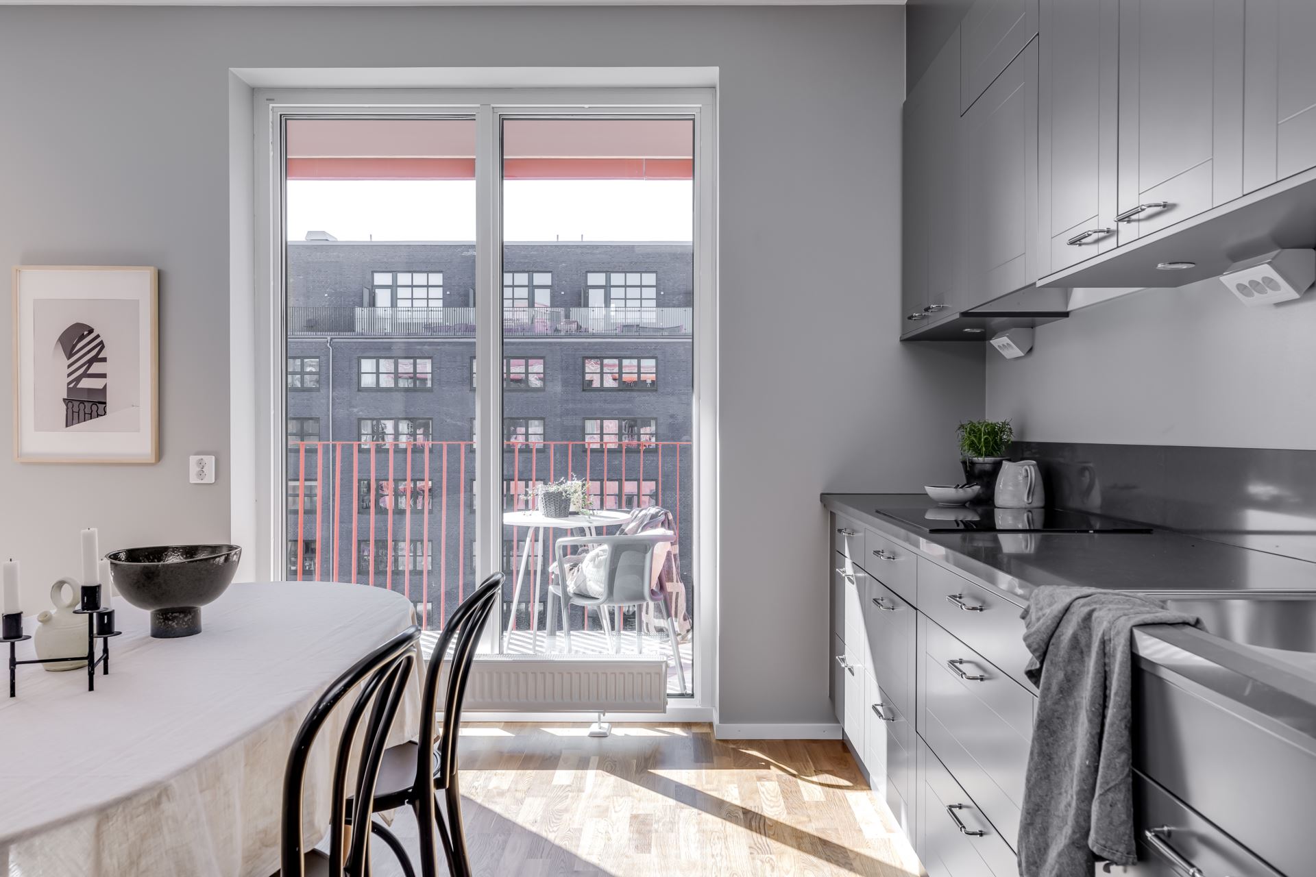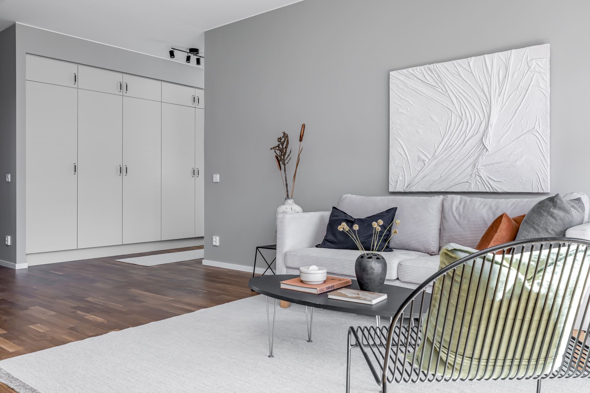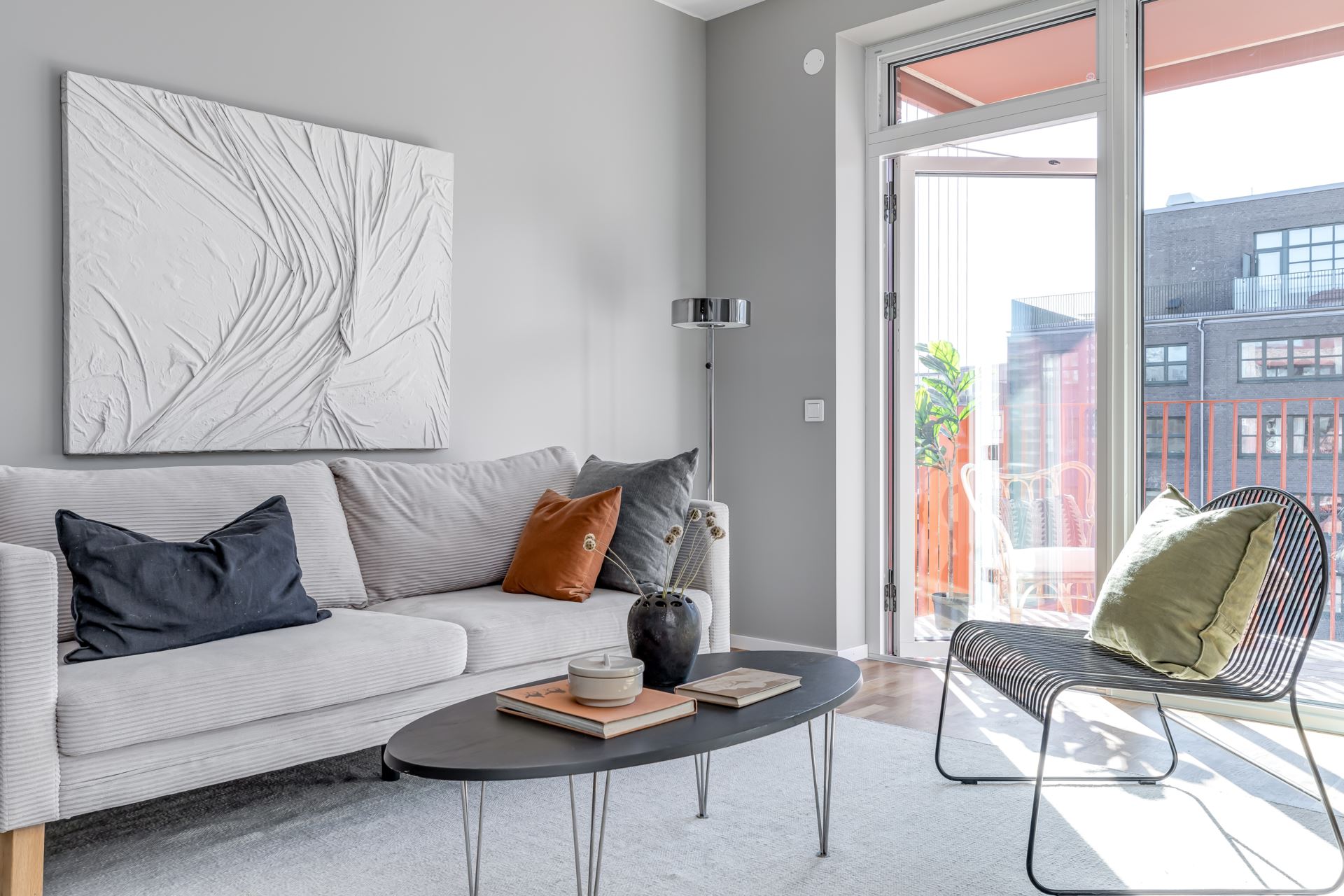 Ljust och luftigt vardagsrum i social och öppen planlösning mot köket. Väggar i snygg grå nyans och parkettgolv i mörk ek. Härifrån nås även lägenhetens andra balkong som ligger i rakt söderläge och bjuder på många härliga soltimmar.
