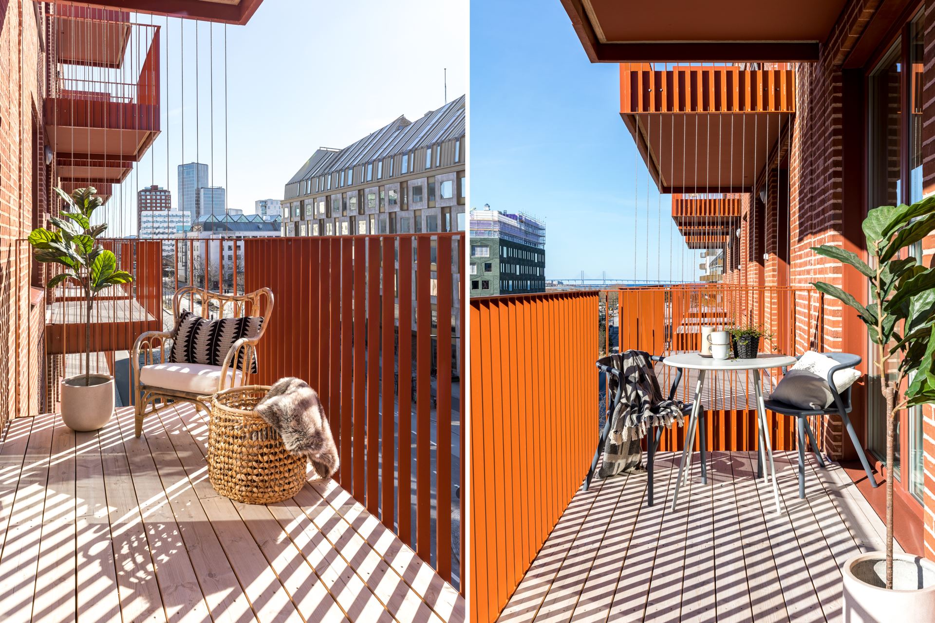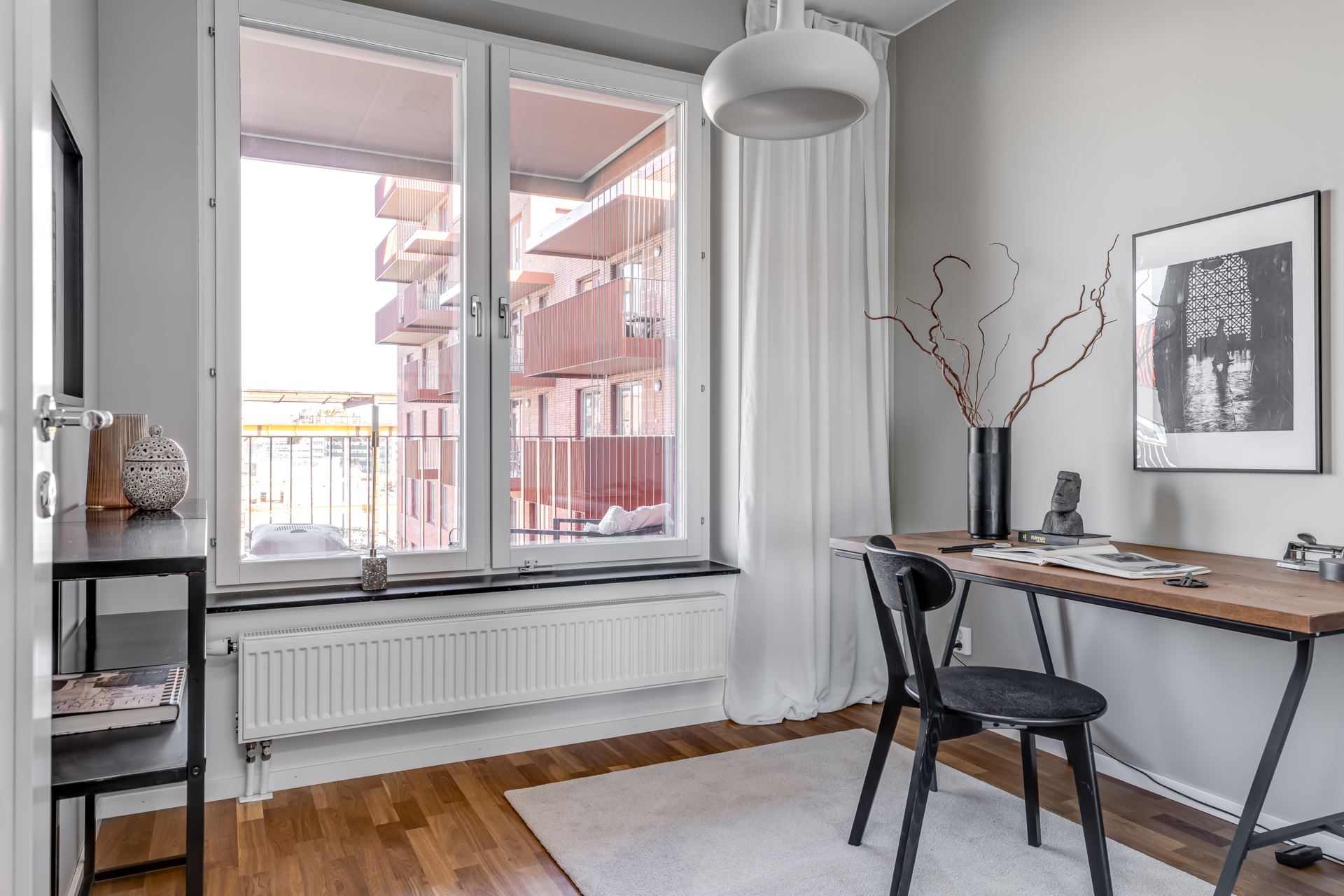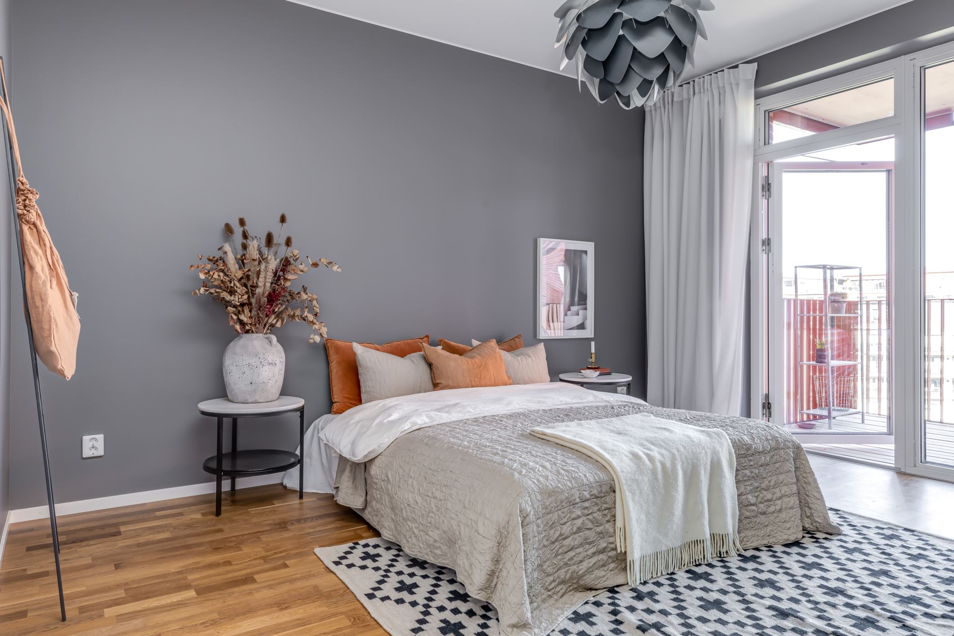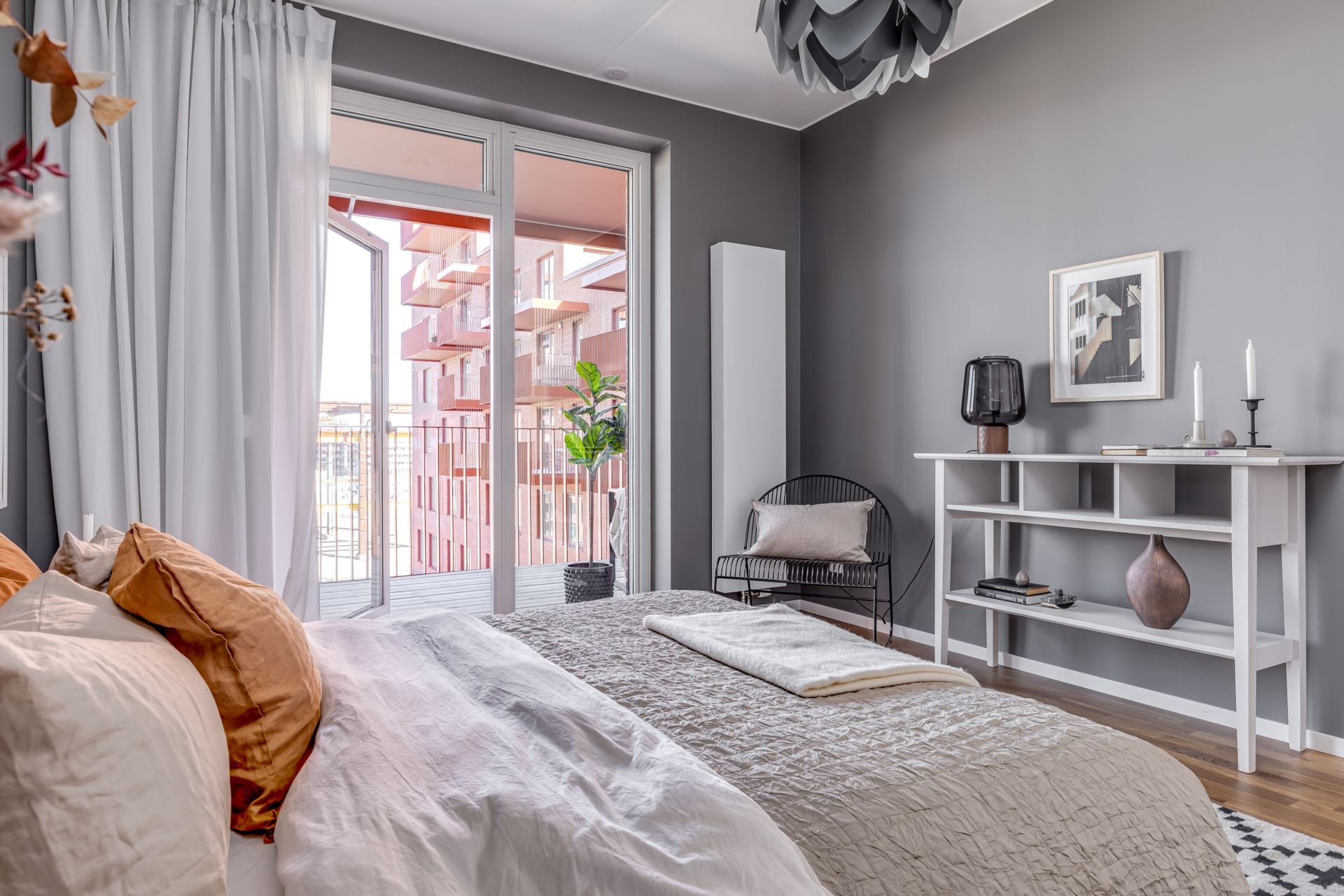 I detta större sovrum ryms med enkelhet både dubbelsäng och övrigt sovrumsmöblemang. Goda förvaringsmöjligheter ges i 3st garderober. Målade väggar och parkettgolv i mörk ek. Härifrån når ni även balkongen med vacker utsikt över kanalen och vidare bort mot Turning Torso. Här ute njuter ni av härlig kvällssol på sommaren.