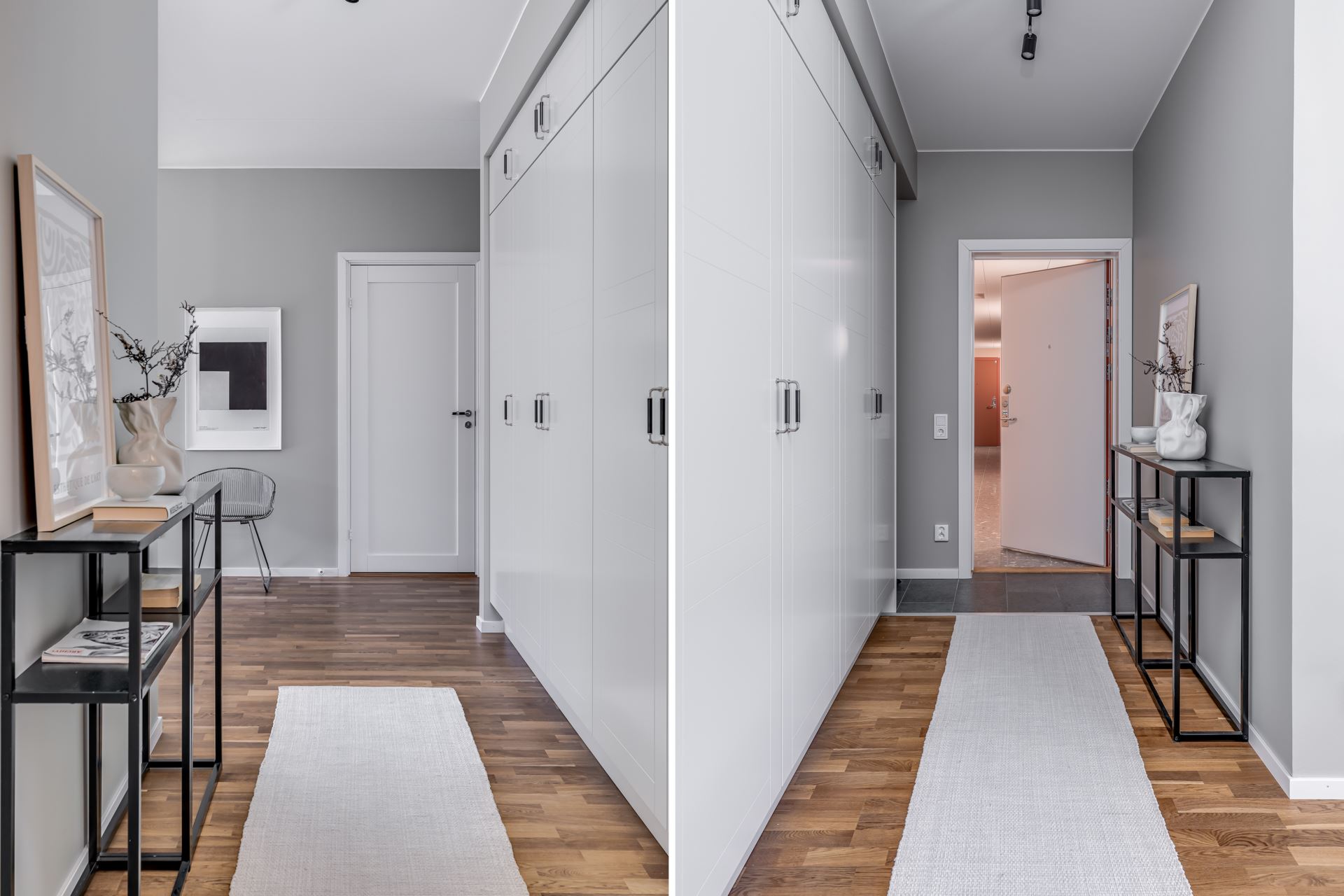 In genom säkerhetsdörren väntar en välkomnande hall med goda förvaringsmöjligheter i flertaleg garderober. Släta väggar i grå nyans möter klinker på golv som sedan övergår i parkettgolv av mörk ek.