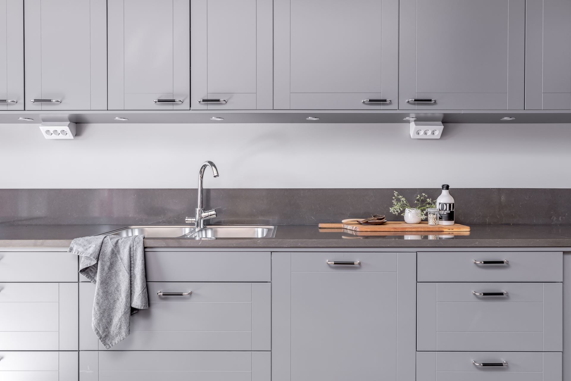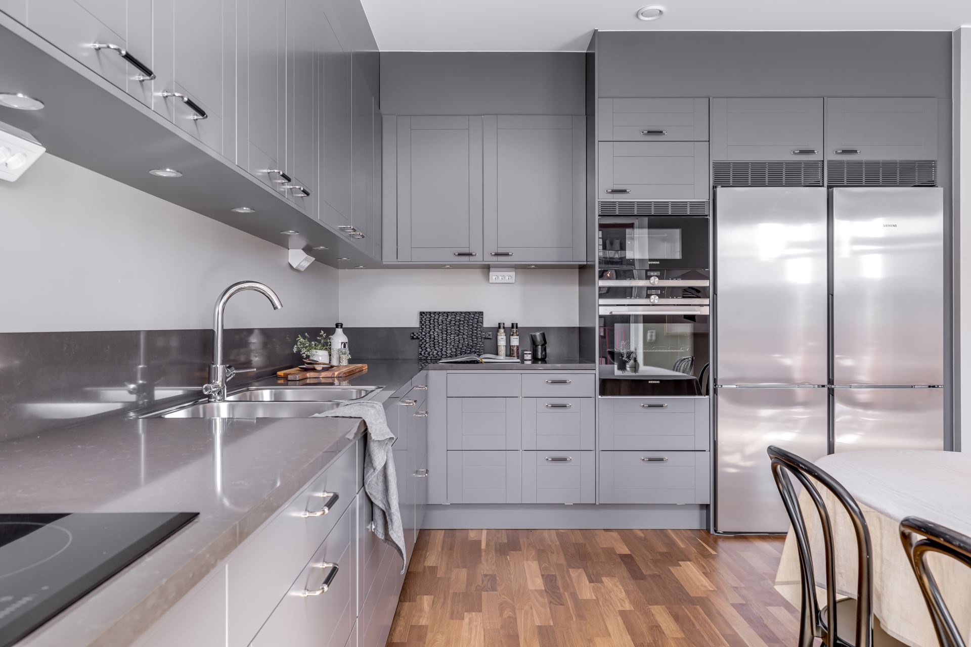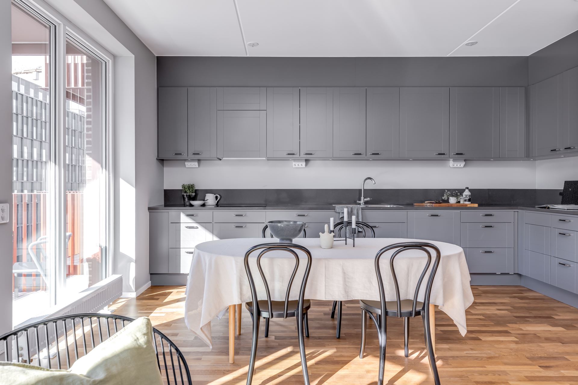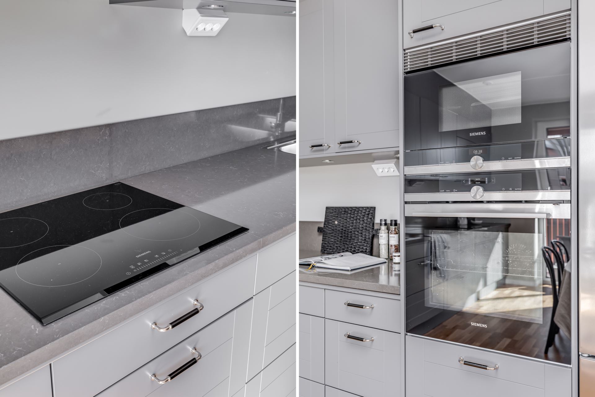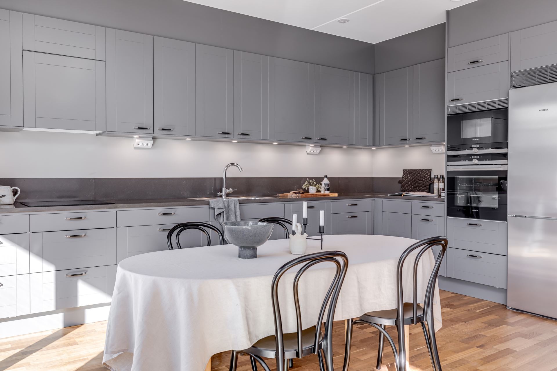 Välplanerat kök med goda arbetsytor och gott om förvaring i både över och underskåp bakom antracitgrå luckor med svarta/kromade beslag. Bänkskiva i kompositsten (Calypso) dimbar belysning (Plejd). Maskinell utrustning består av kyl/frys, inbyggnadsugn, induktionshäll, micro samt integrerad diskmaskin.