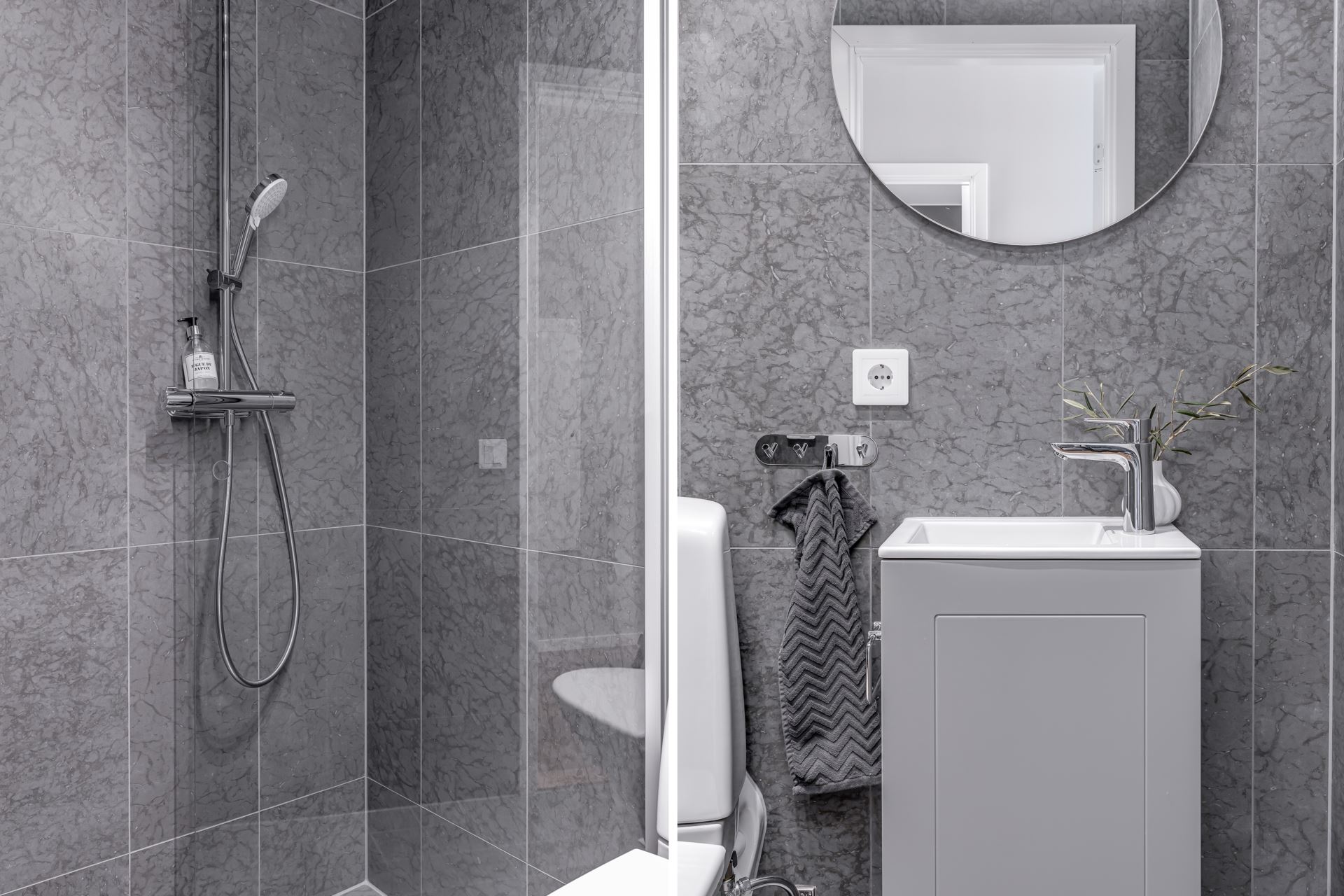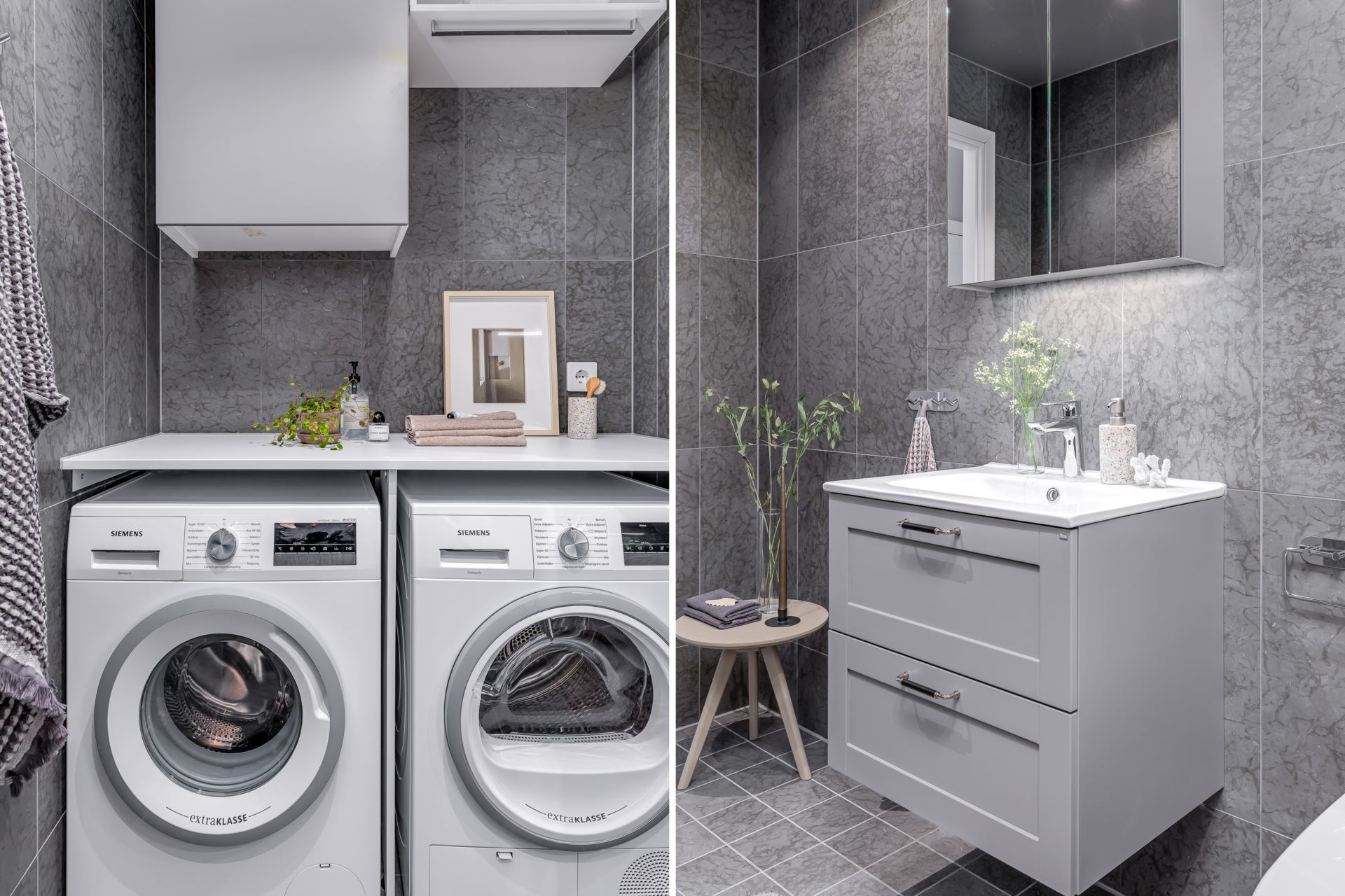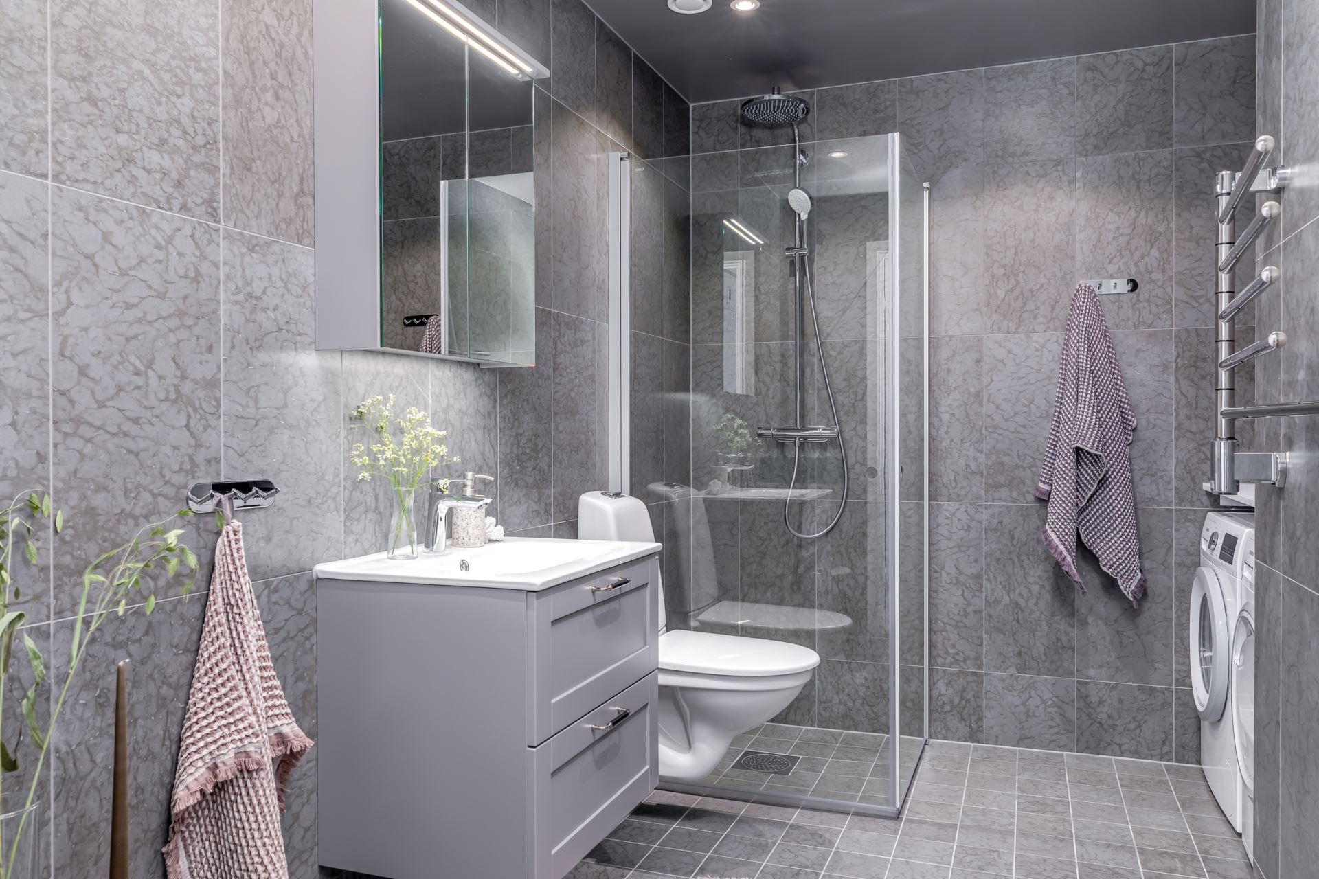 Stort helkaklat badrum med golv och väggar i snyggt Jämtlandsgrå granitkeramik. Rejäl duschhörna med dubbla vikbara duschväggar, vägghängd wc, tvättställ, kommod i snygg grå nyans, handukstork, spotlights i tak. Badrummet är även utrustad med tvättmaskin, torktumlare samt överhängande förvaringsskåp.