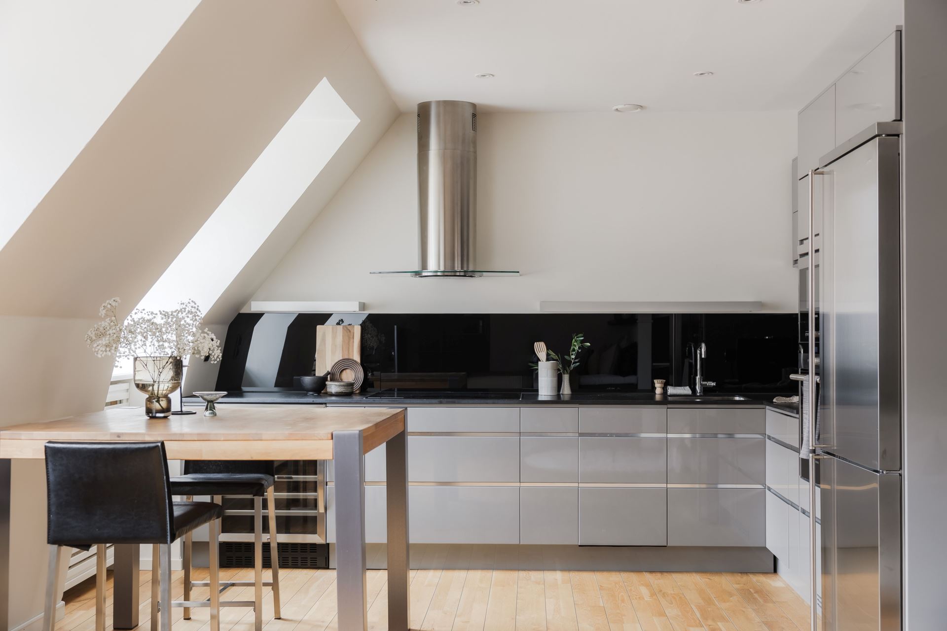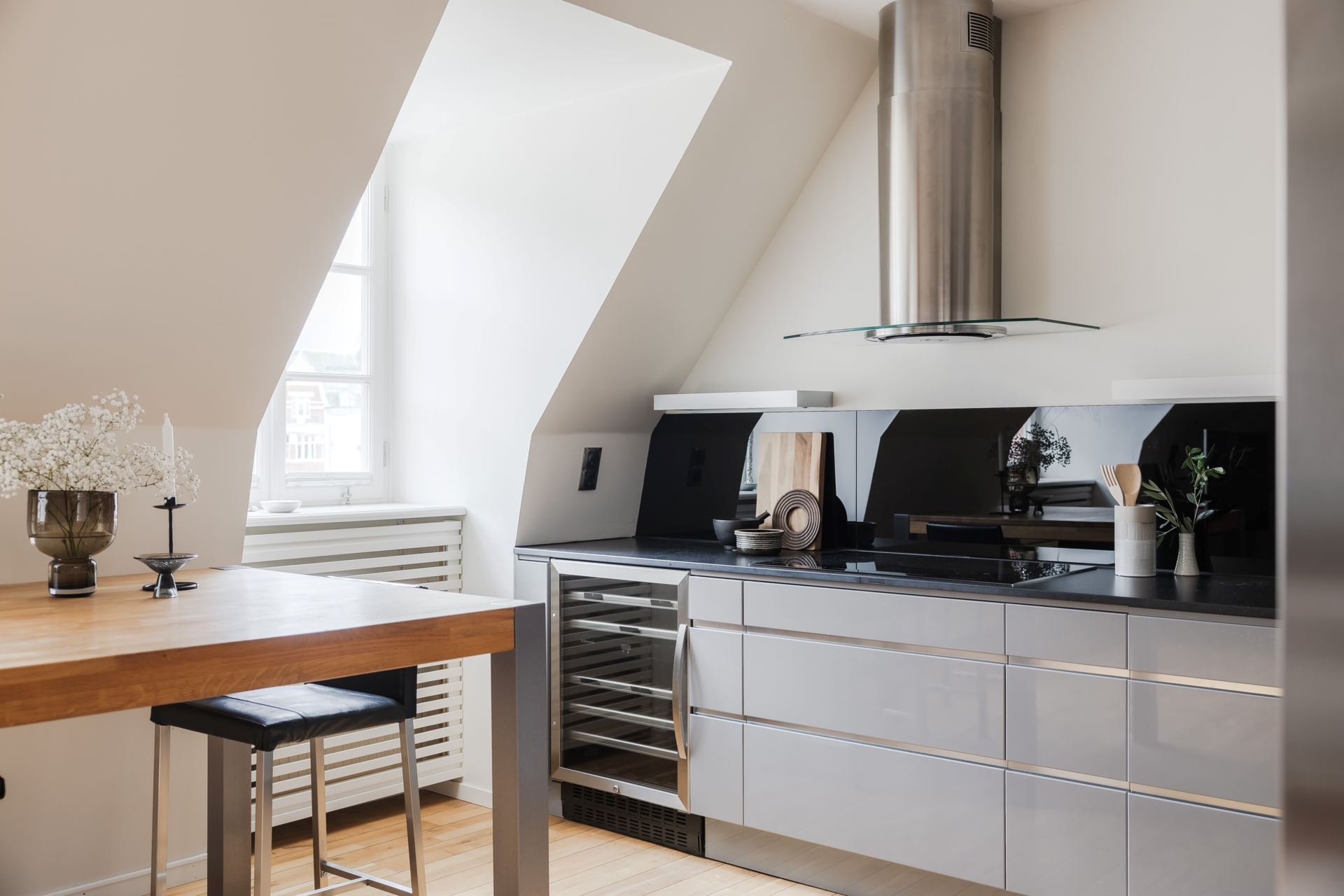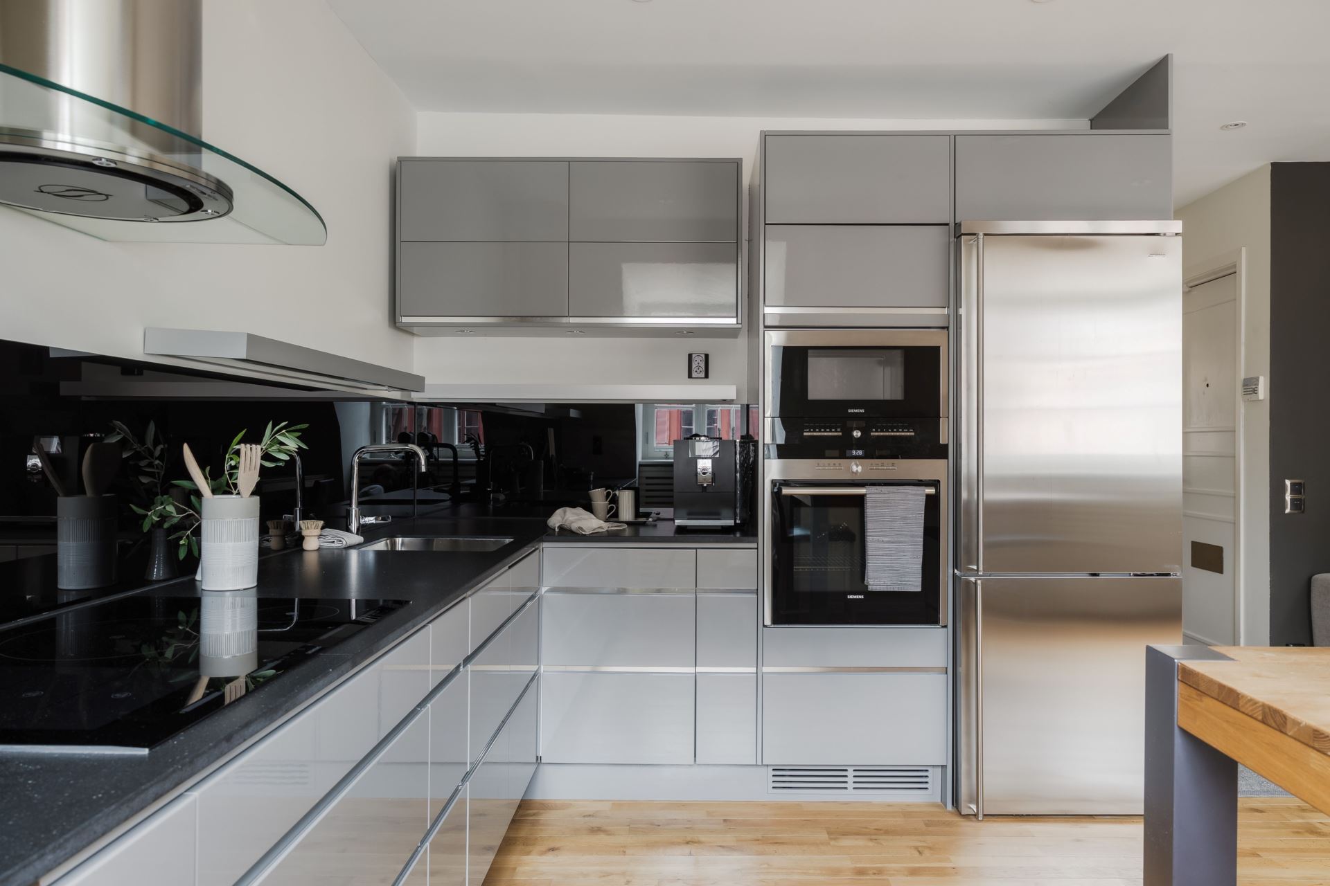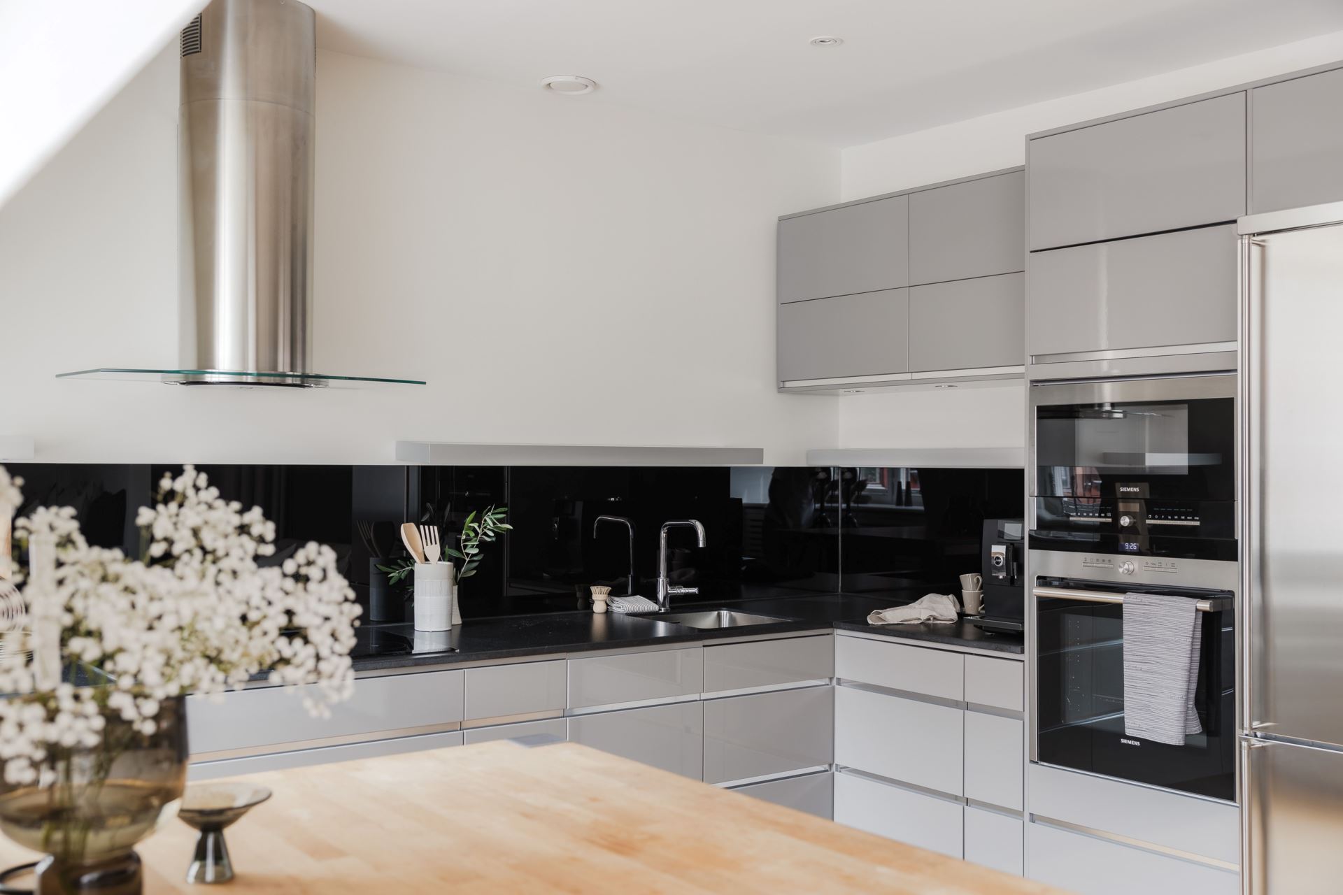 Ett stilrent och fullutrustat kök från välrenommerade Ballingslöv där kvalitet står i fokus. Köket är inrett med grå luckor och en exklusiv svart stenskiva som tillsammans med det matchande stänkskyddet i svart glas ger ett modernt och sofistikerat uttryck. Här finns alla bekvämligheter du kan önska: inbyggd ugn och micro, kyl och frys, vinkyl, induktionshäll, vask och fläkt. Köket erbjuder gott om både arbetsyta och förvaring, vilket gör matlagningen enkel och inspirerande. Intill köket finns en naturlig matplats med plats för 4–6 personer, perfekt för både vardagens måltider och middagar i gott sällskap. Här möts funktionalitet och social atmosfär på bästa sätt.