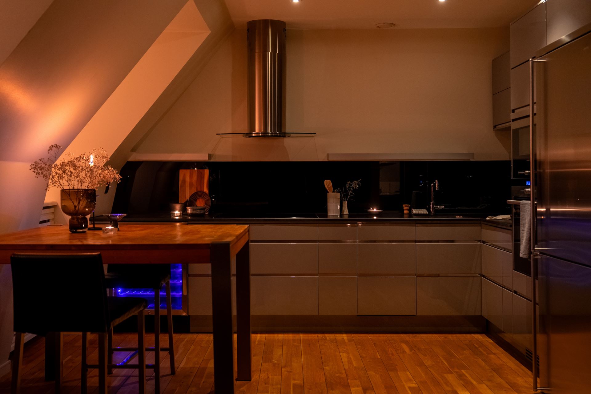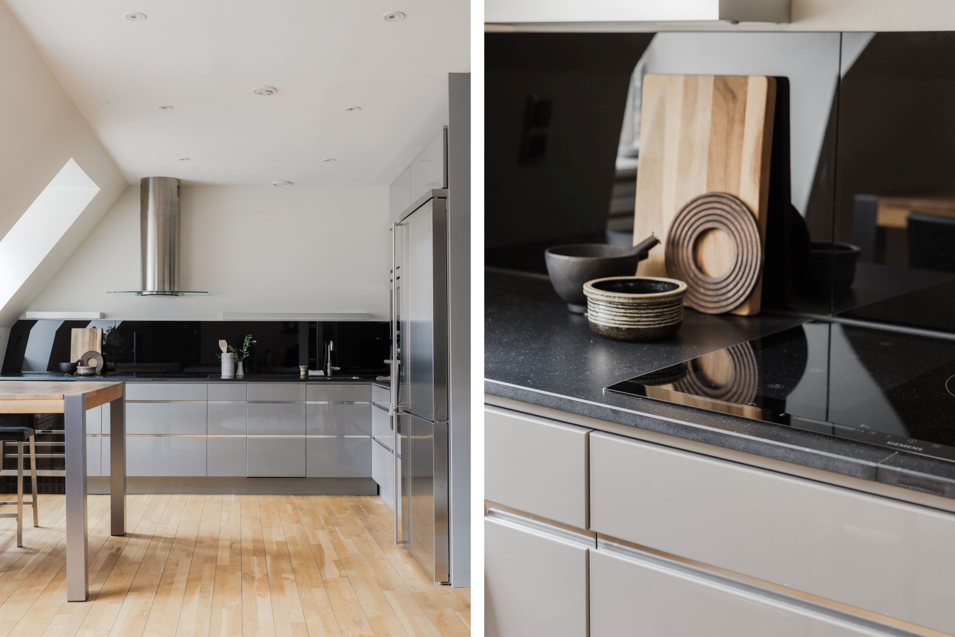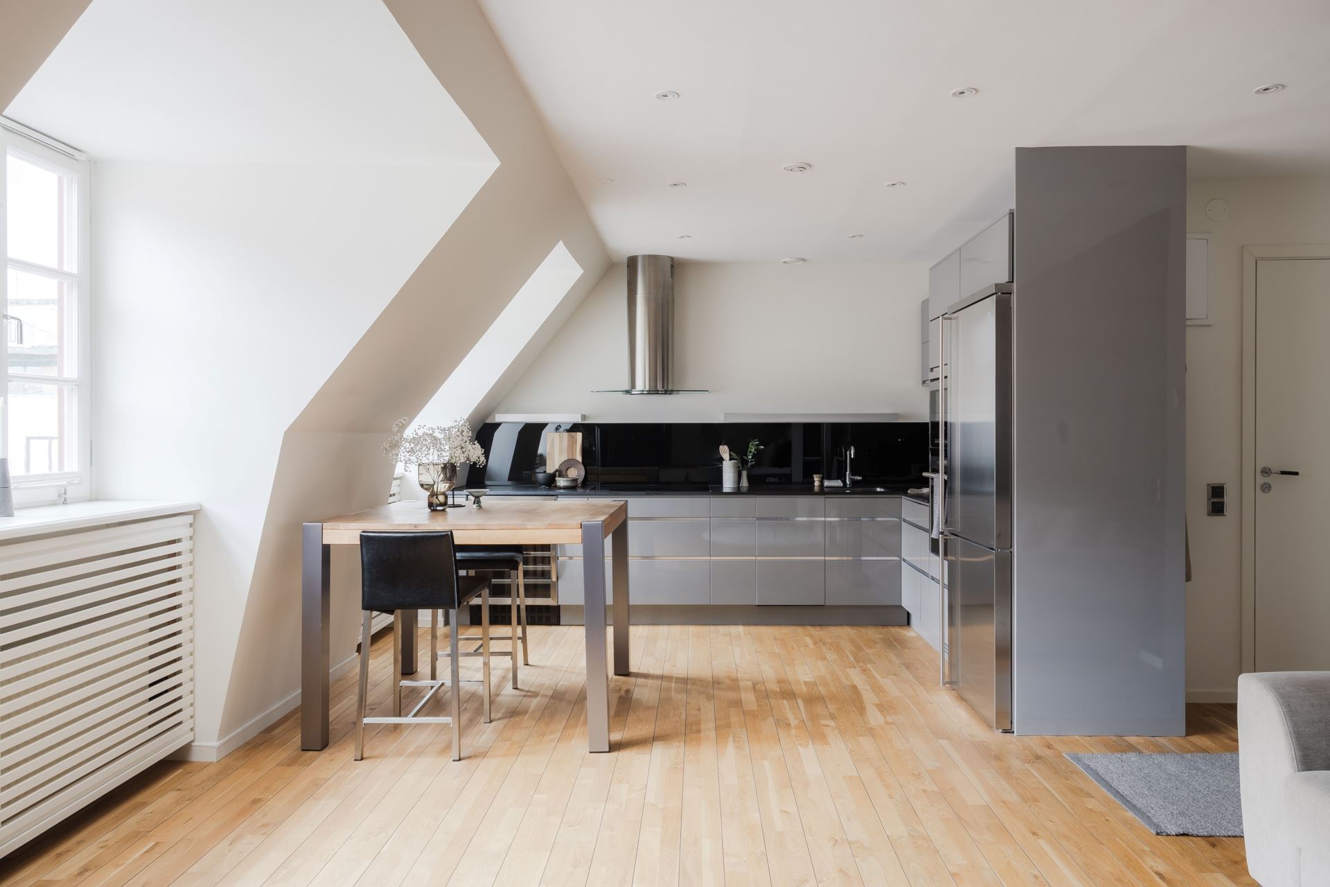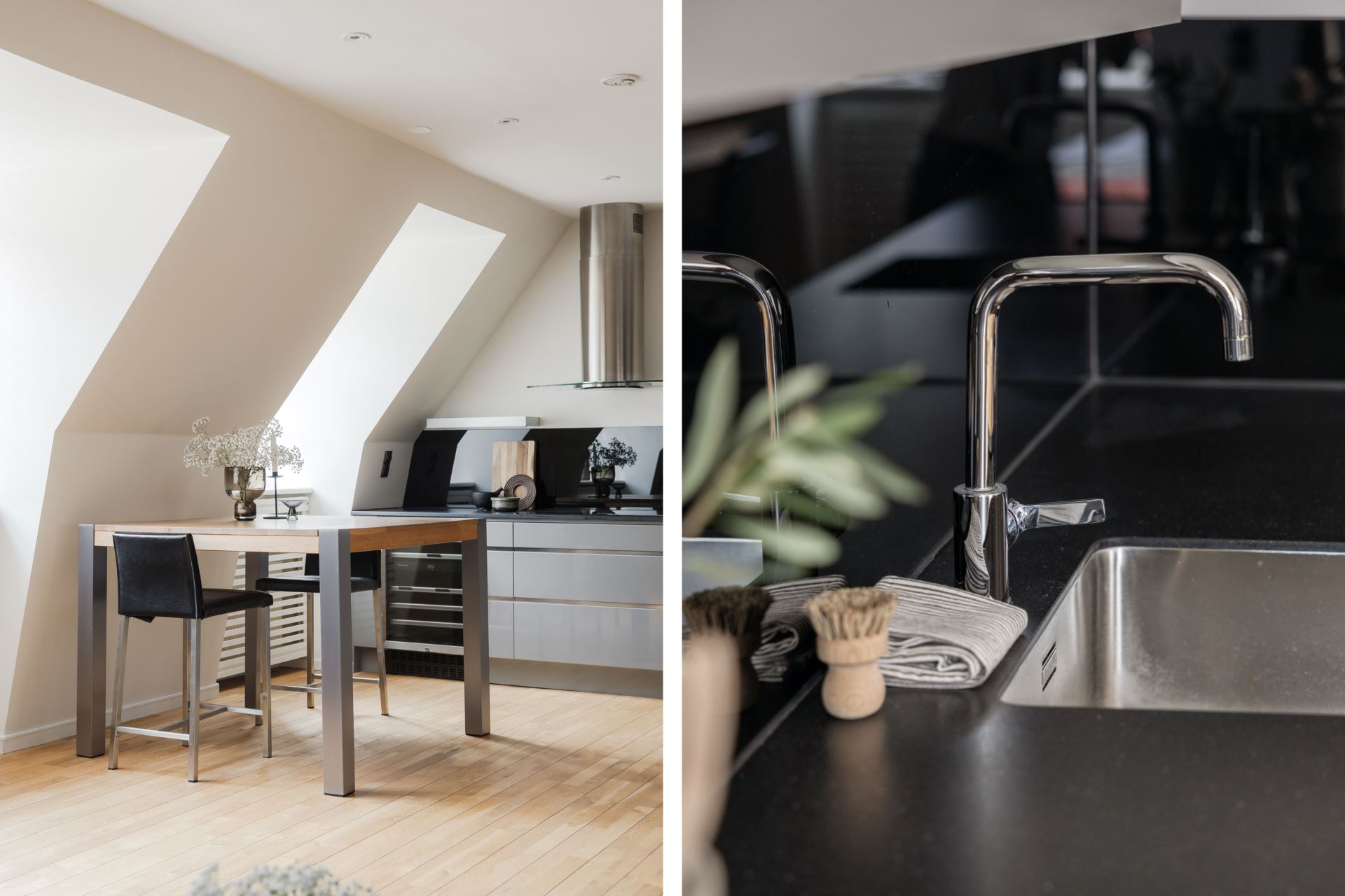 Ett stilrent och fullutrustat kök från välrenommerade Ballingslöv där kvalitet står i fokus. Köket är inrett med grå luckor och en exklusiv svart stenskiva som tillsammans med det matchande stänkskyddet i svart glas ger ett modernt och sofistikerat uttryck. Här finns alla bekvämligheter du kan önska: inbyggd ugn och micro, kyl och frys, vinkyl, induktionshäll, vask och fläkt. Köket erbjuder gott om både arbetsyta och förvaring, vilket gör matlagningen enkel och inspirerande. Intill köket finns en naturlig matplats med plats för 4–6 personer, perfekt för både vardagens måltider och middagar i gott sällskap. Här möts funktionalitet och social atmosfär på bästa sätt.