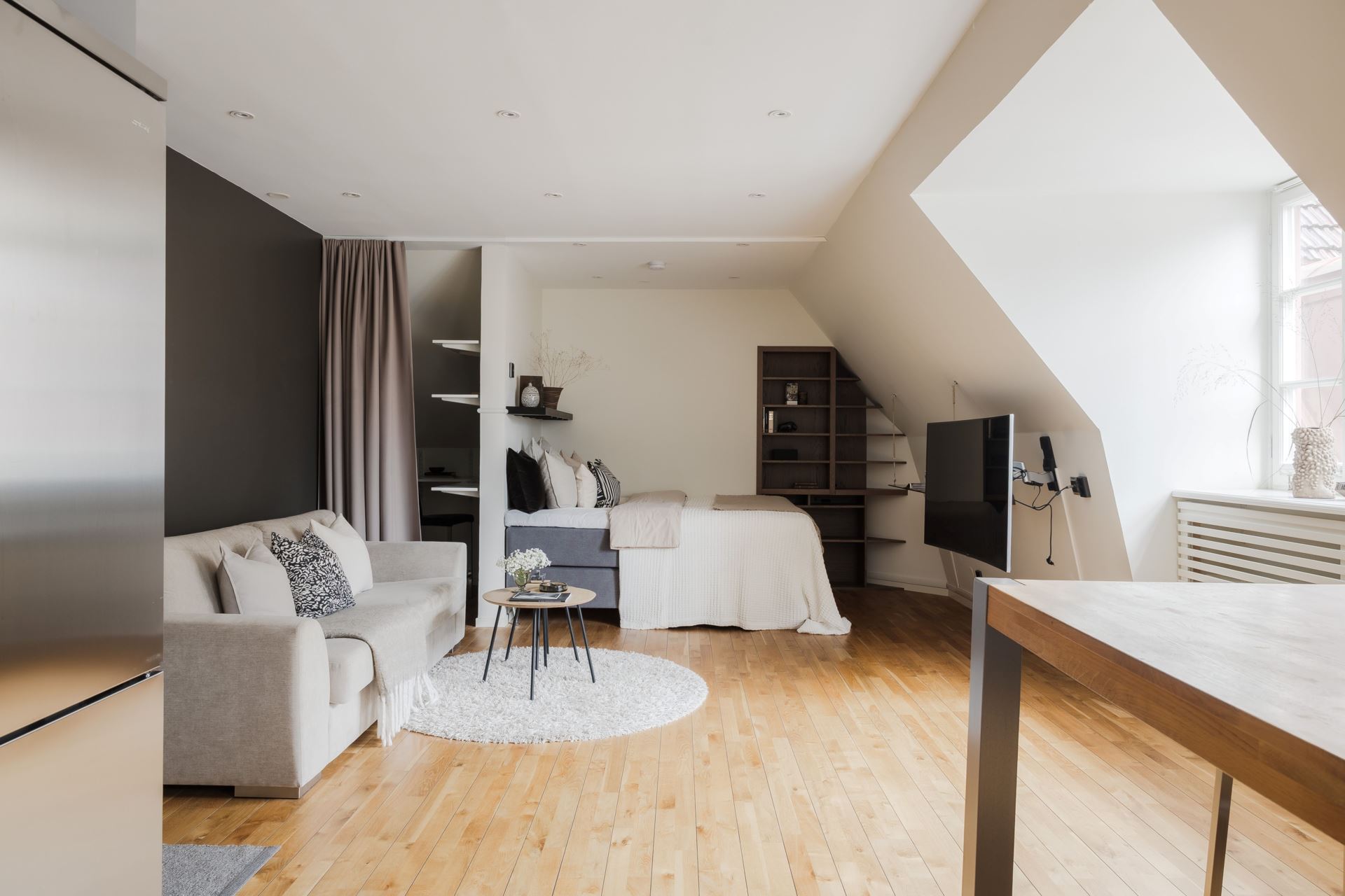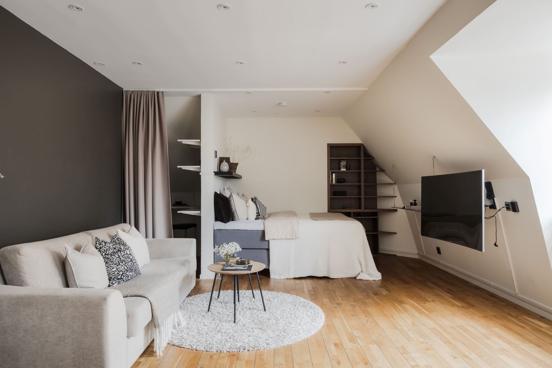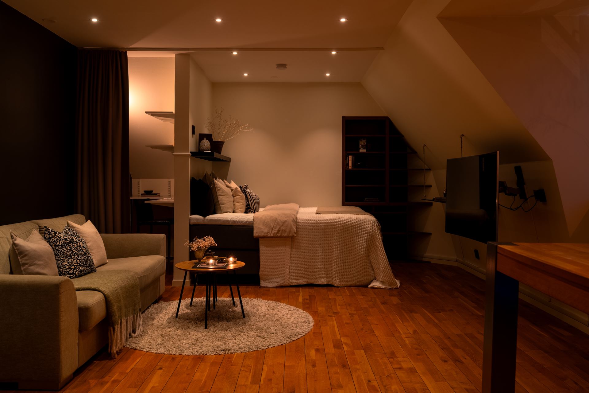 Intill de sociala ytorna finner vi en smart placerad sovalkov, en rofylld vrå som blir ditt eget lilla krypin. Här ryms enkelt en större säng och med möjlighet till smart förvaring maximeras ytan på bästa sätt. För den som önskar finns även plats för en arbetsplats intill, vilket gör detta till en flexibel och funktionell del av hemmet.