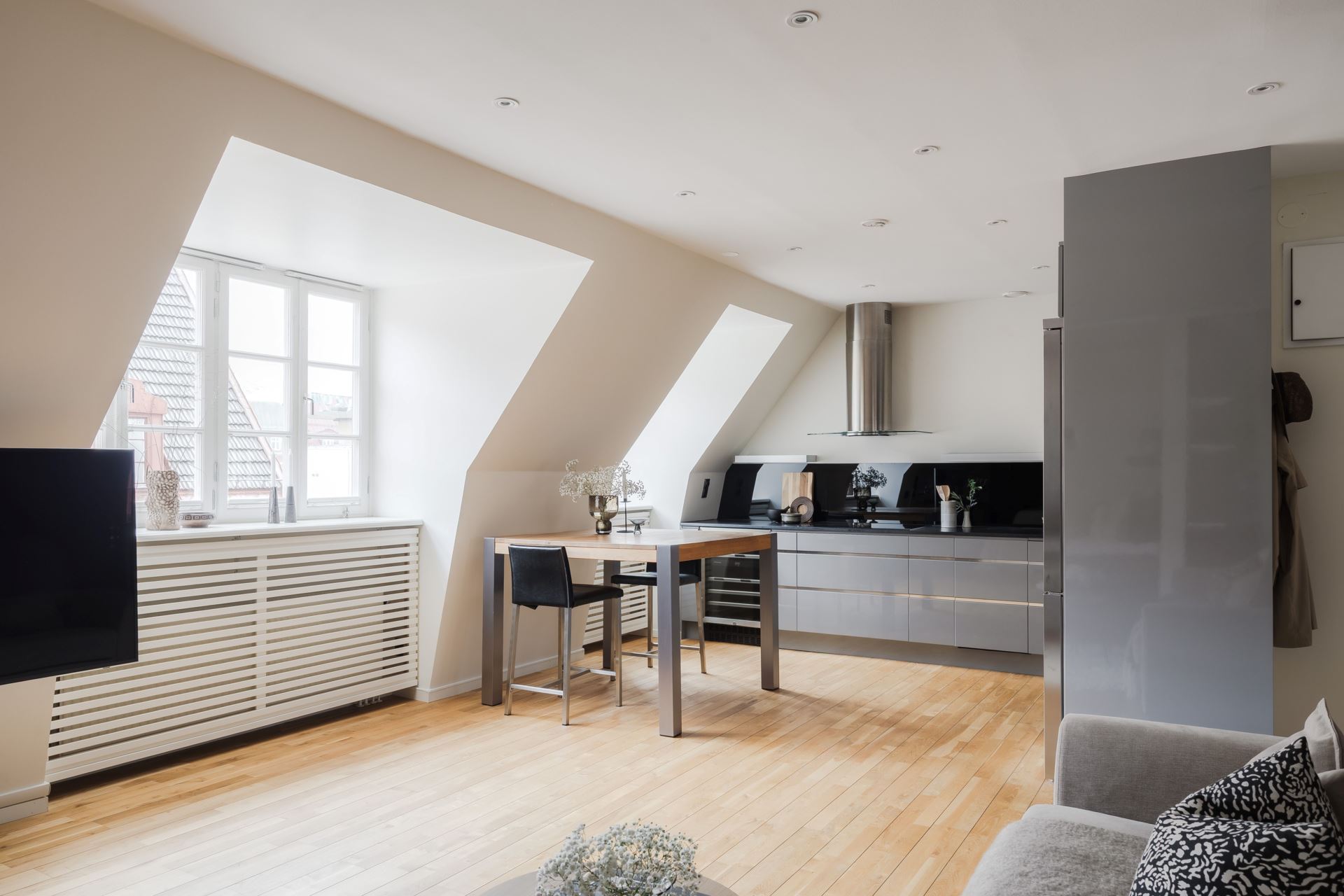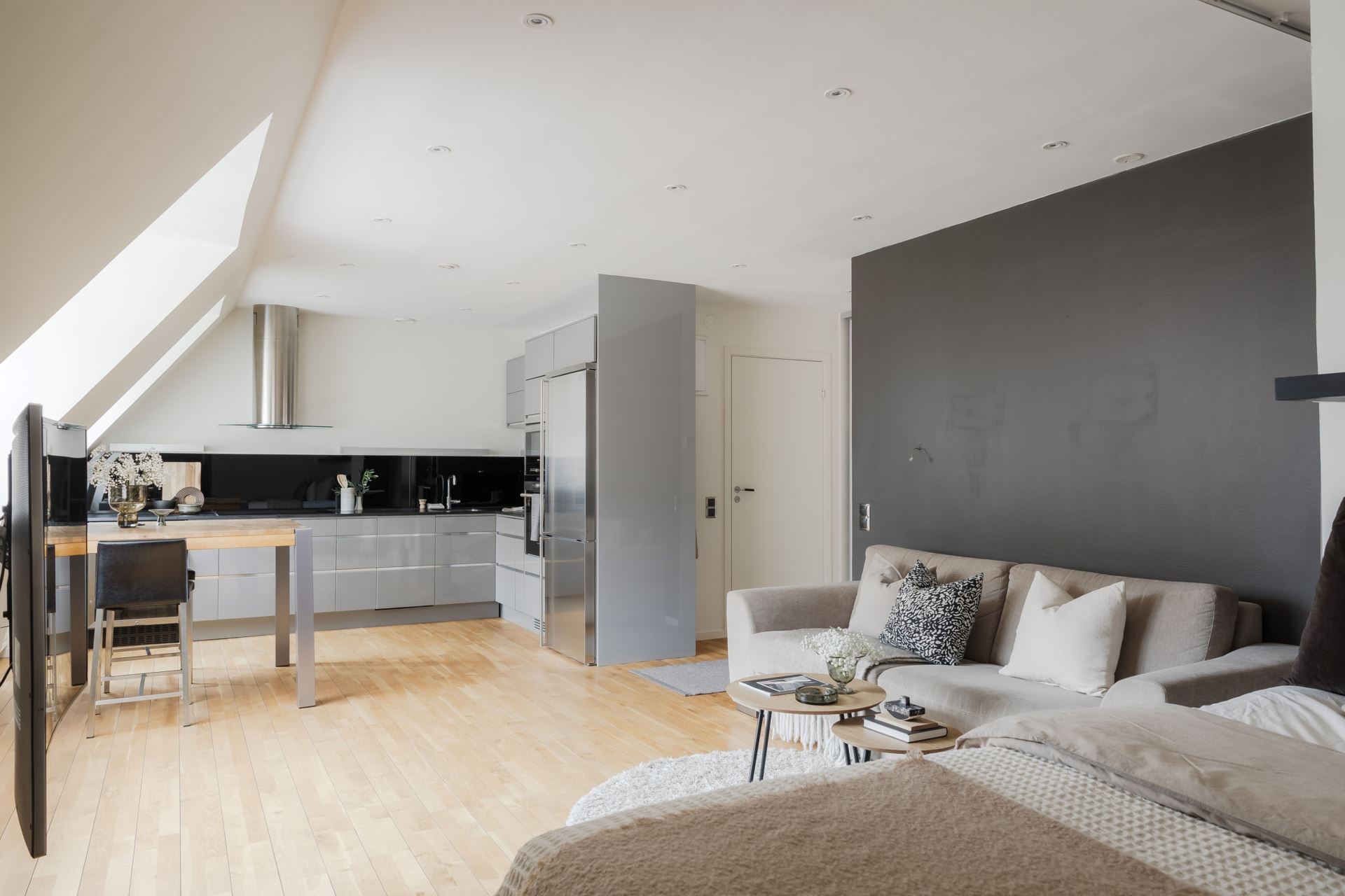 Från hallen öppnar bostaden upp sig i en luftig öppen planlösning där vardagsrum och kök möts på ett naturligt sätt. Rummet är väl tilltaget och erbjuder gott om plats för både soffgrupp och sociala middagar. Här skapas den perfekta miljön för trevliga kvällar med familj och vänner, där ljuset från de stora fönstren förstärker känslan av rymd och trivsel.