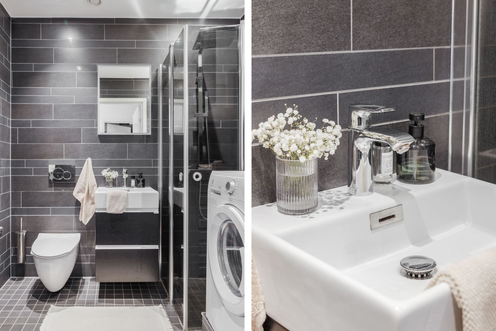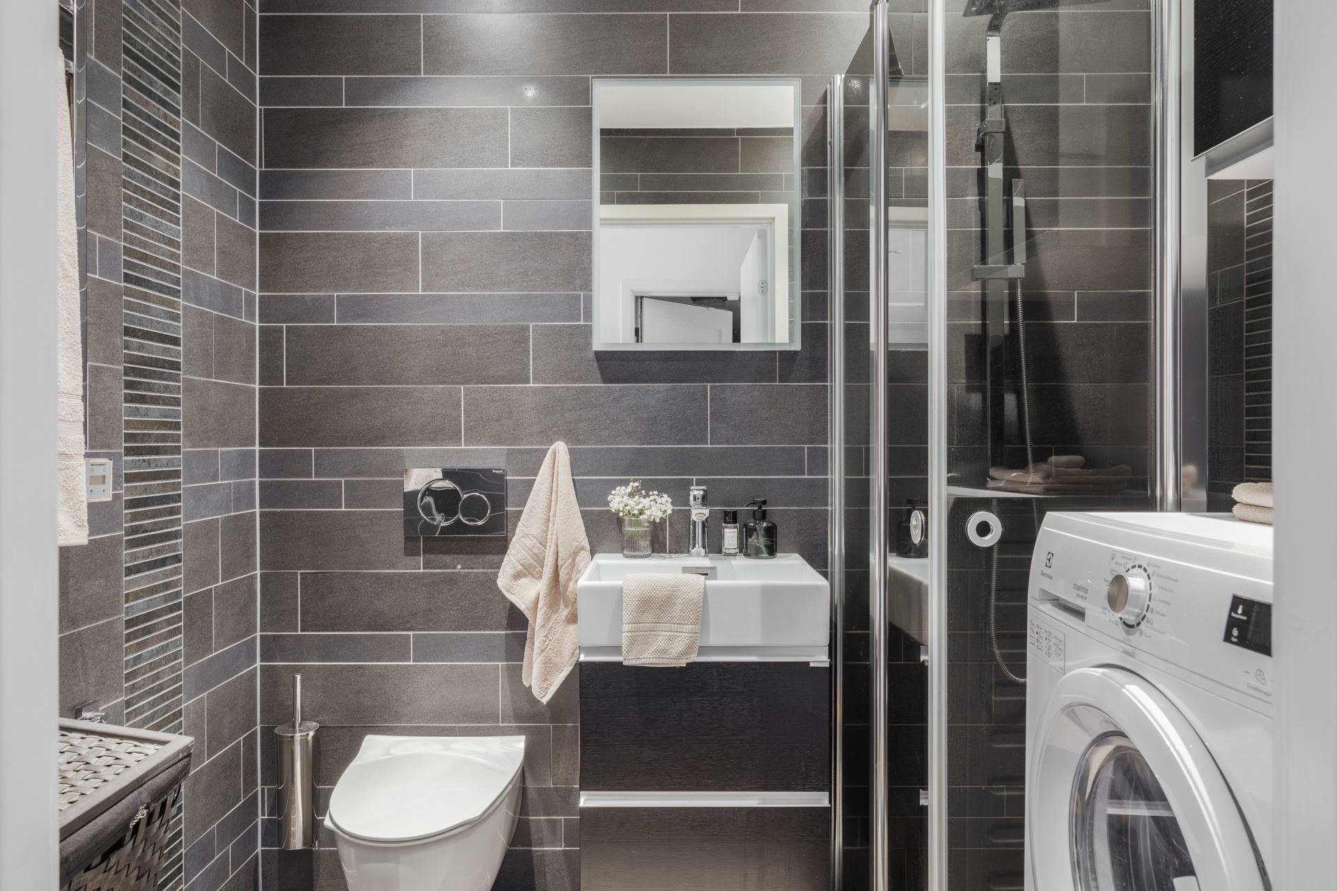 Ett stilrent och helkaklat badrum i modern design där grått kakel och klinker skapar en tidlös känsla. Spotlights i taket ger ett behagligt ljus och framhäver detaljerna i rummet. Här finns en rymlig duschhörna med glasväggar, vägghängd wc samt en stilfull kommod med vask och spegelskåp som erbjuder smart förvaring. Badrummet är dessutom utrustat med en kombinerad tvätt- och torktumlare, med praktisk arbetsyta och extra förvaringsmöjligheter ovanför. Ett badrum som kombinerar funktion, komfort och stil på bästa sätt.