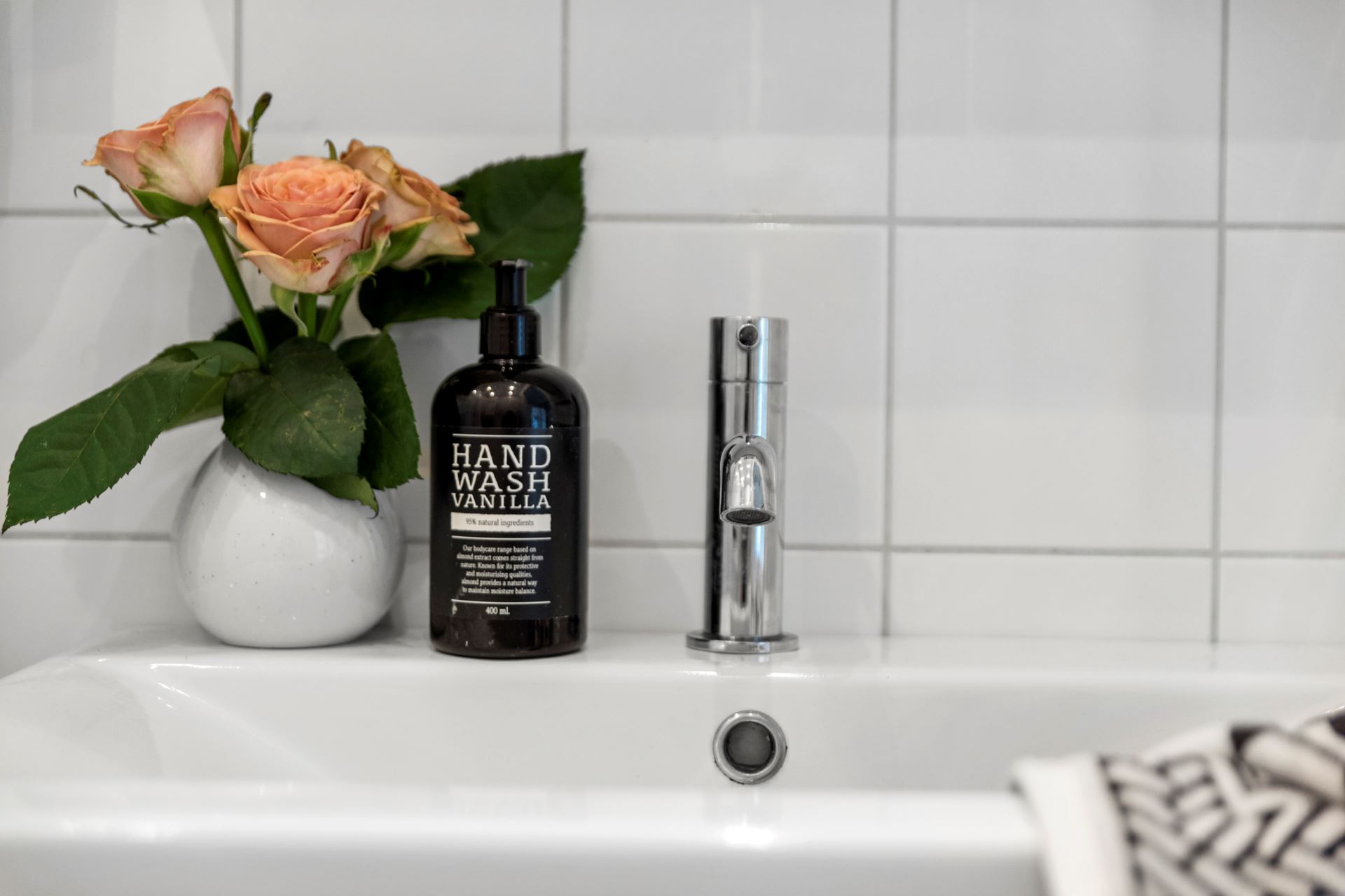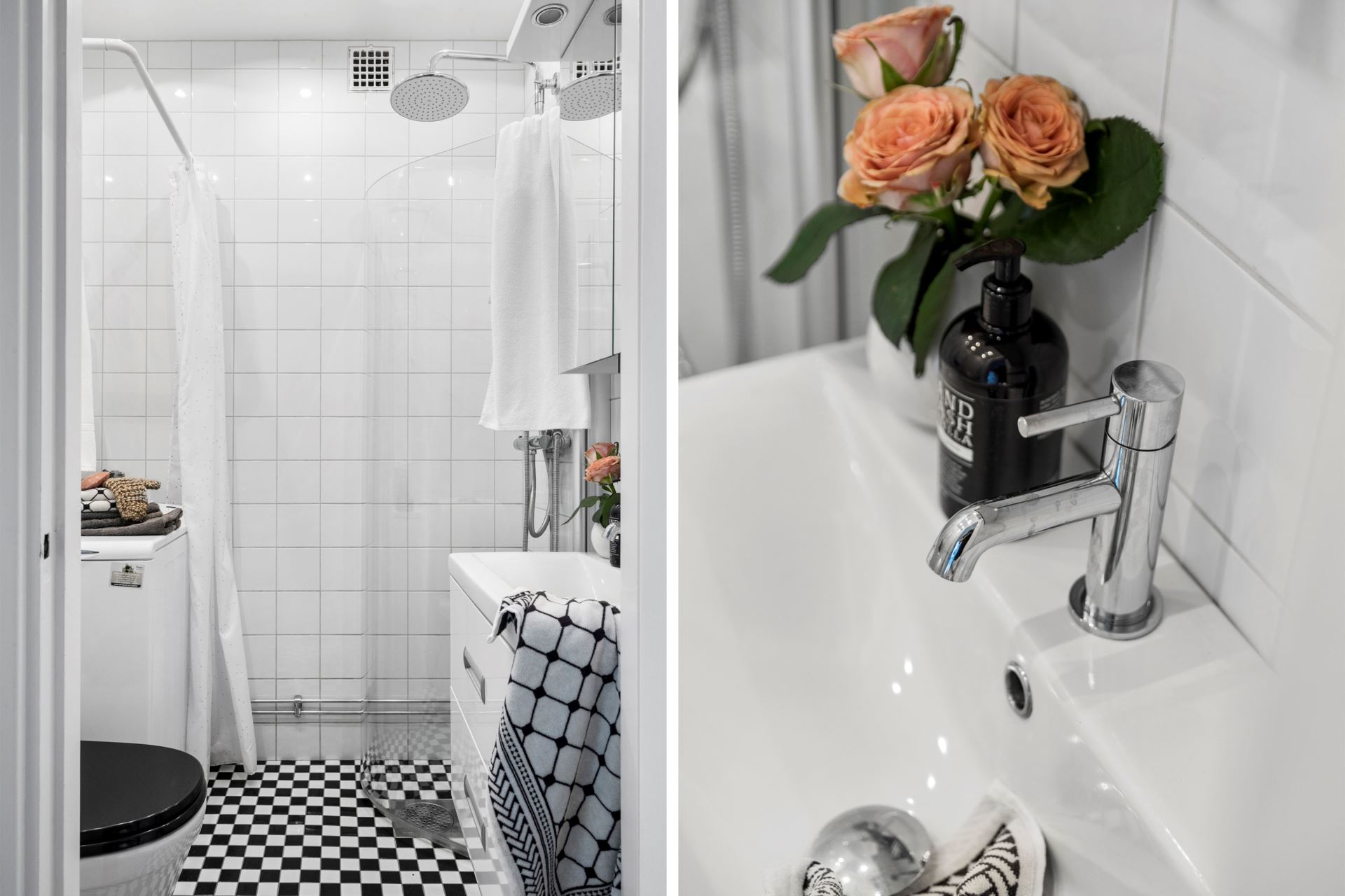 I anslutning till hallen ligger bostadens helkaklade badrum med klinkergolv i svart och vitt, vitkaklade väggar samt infällda takspotlights. Välutrustat med dusch med vikdörr i glas, handdukstork, handfat med vit kommod, badrumsskåp med spegeldörrar och wc samt tvättmaskin.