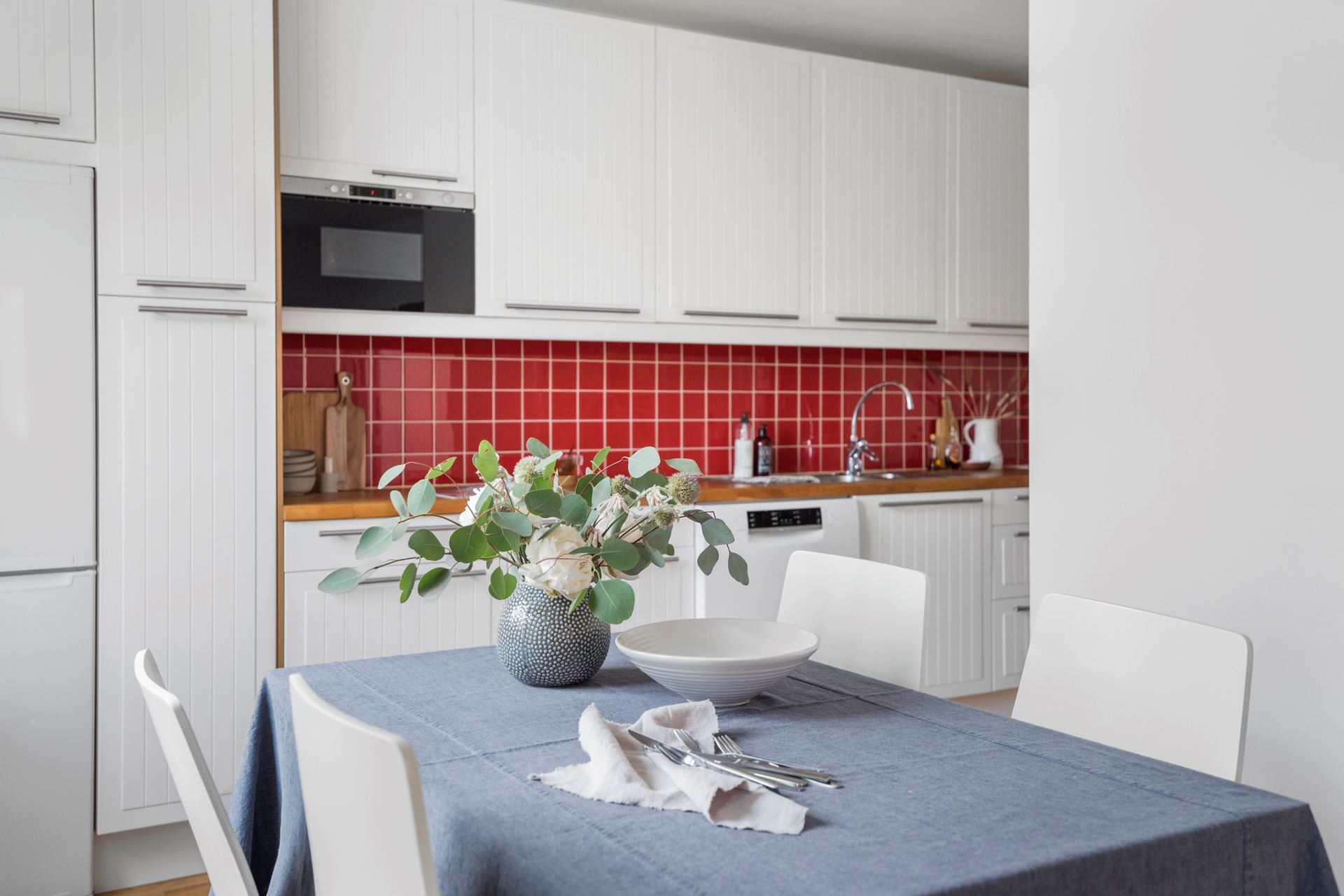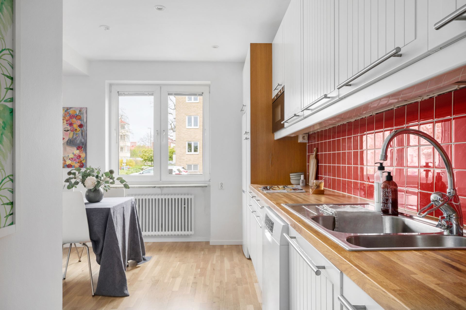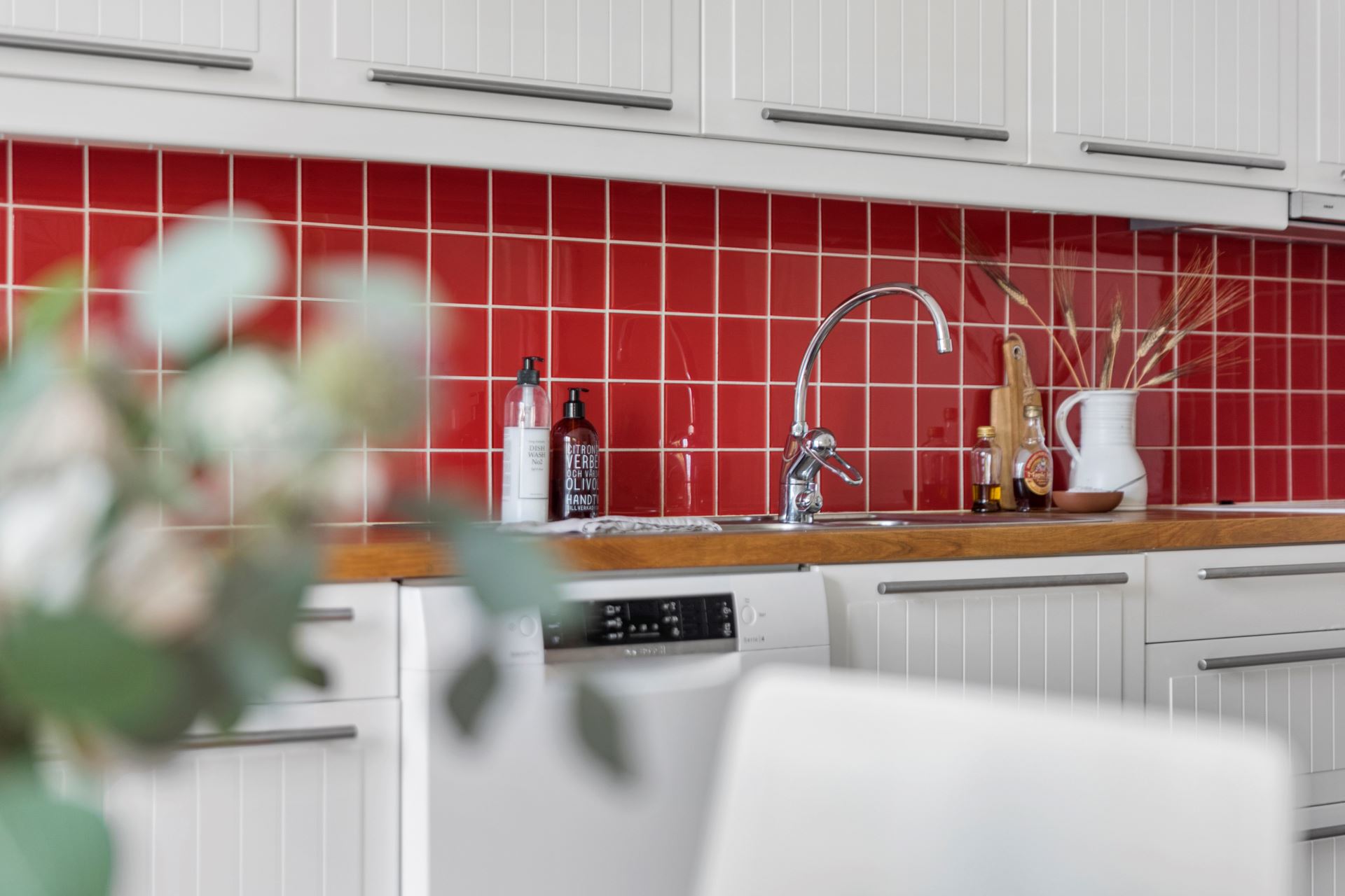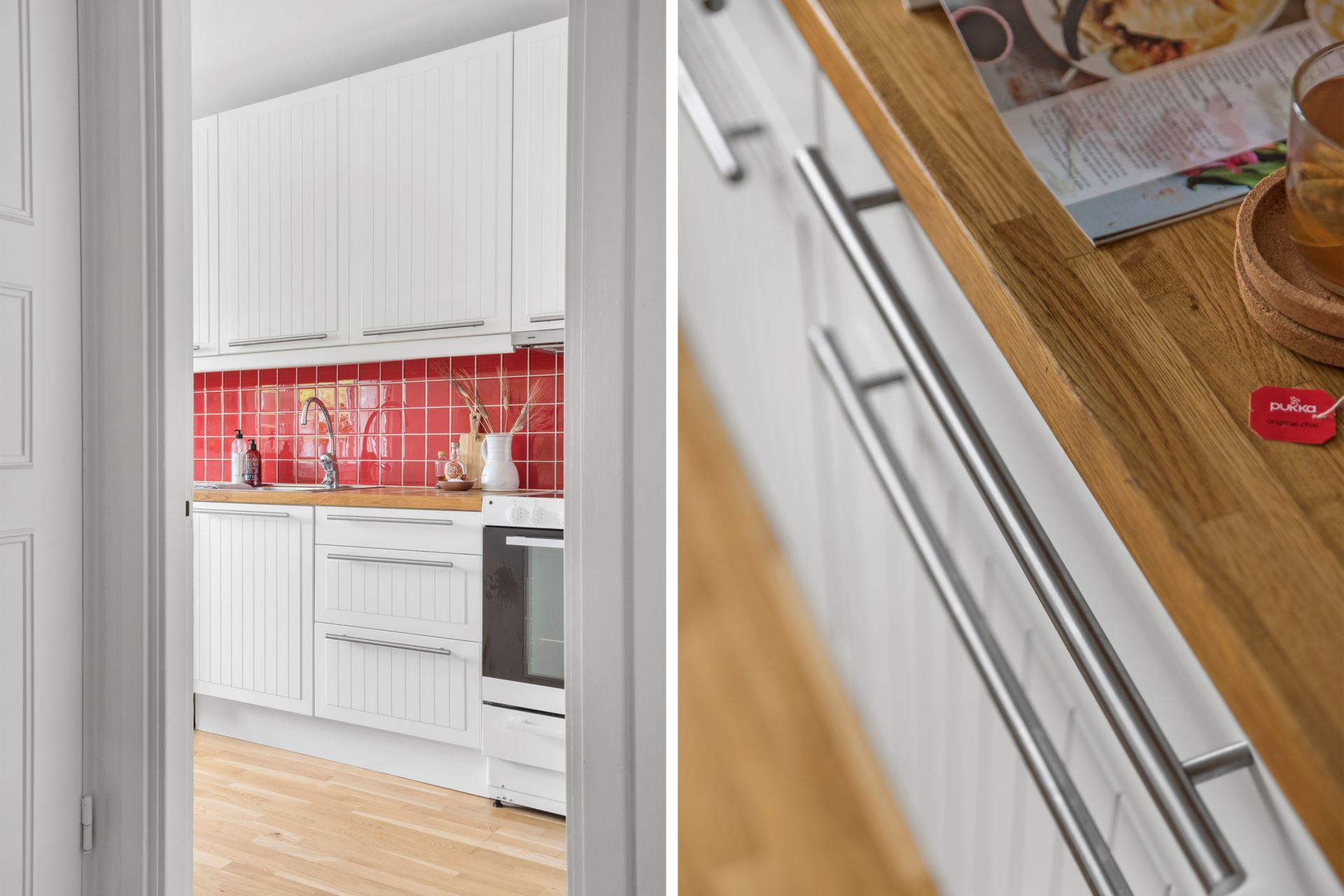 Köket som vi når både via hall och vardagsrum bjuder in med förvaring bakom släta luckor i vitt som lackerats om 2018 och arbetsytor i trä med rött kakel som stänkskydd ovanför. Maskinparken består av kyl och frys, spishäll, ugn, mikrovågsugn, diskmaskin samt fläkt.