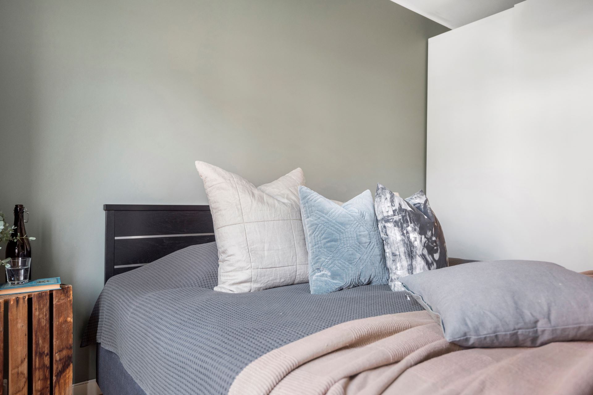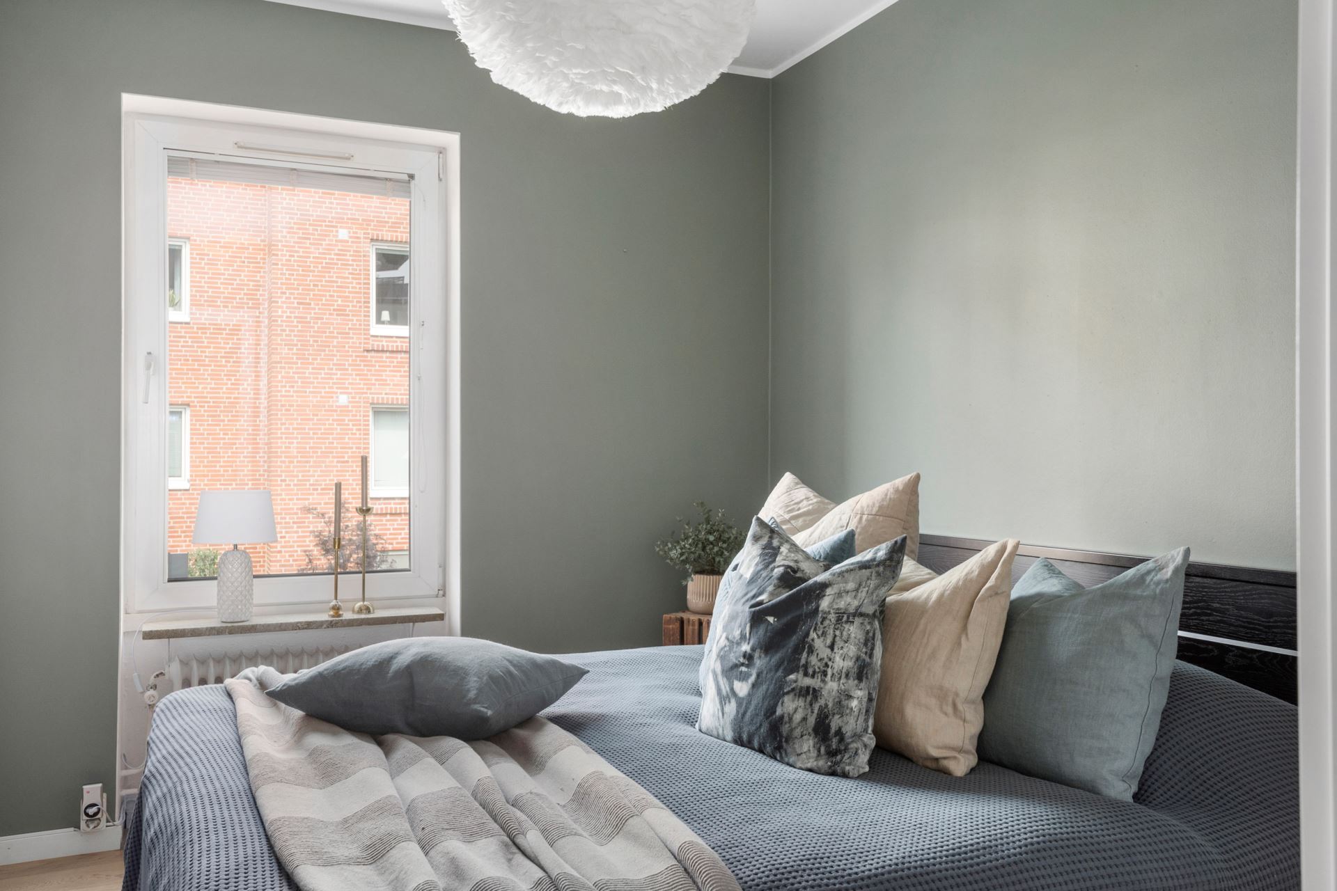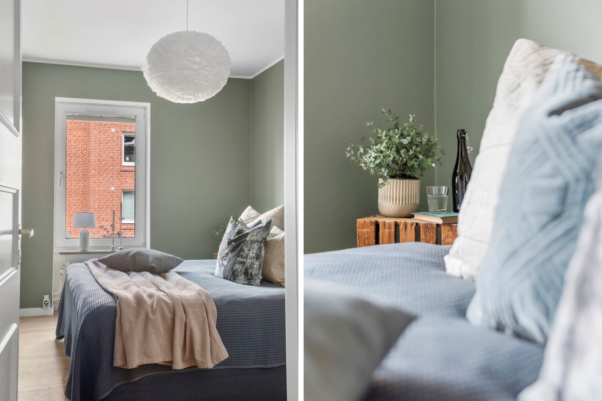 Sovrummets mysiga kvadrat inrymmer med lätthet dubbelsäng och tillhörande möblemang. Enhetligt vitmålade väggar (2019) möter snyggt laminatgolv och det generösa fönsterpartiet bidrar till ett härligt ljusinsläpp. Praktisk förvaring finns i garderob.