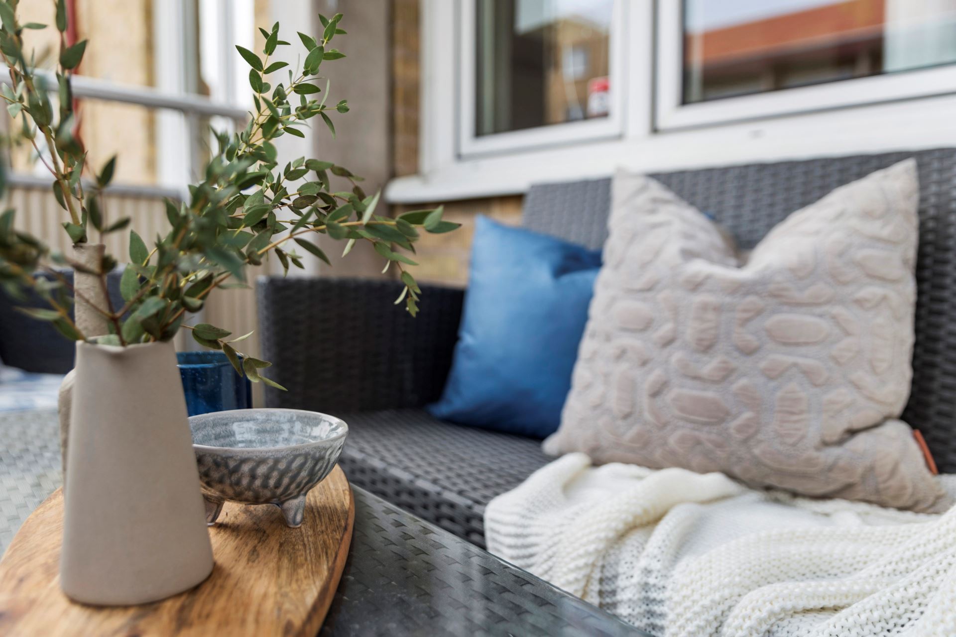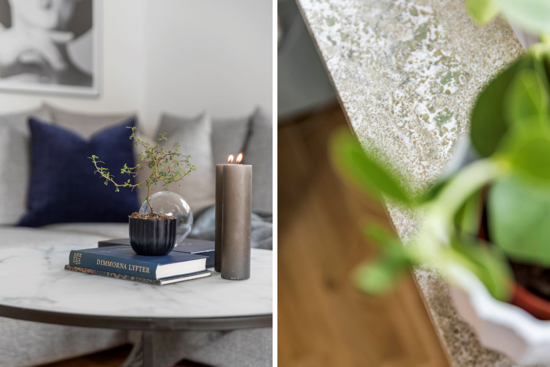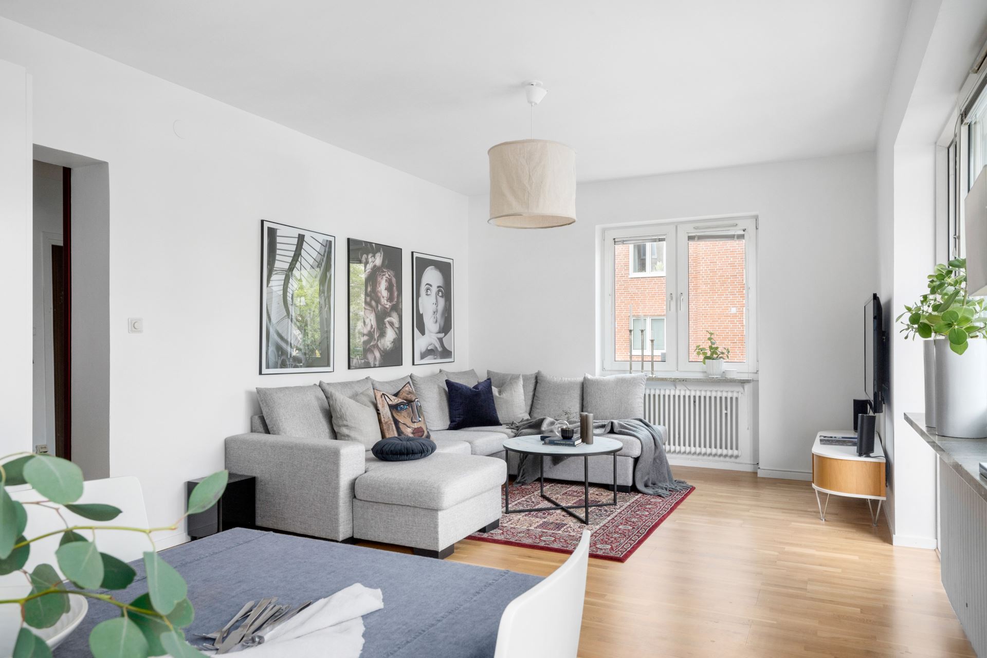 Vidare in väntar fantastiska vardagsrumsytor där ljuset strömmar in från ett generöst fönsterparti som även förser oss med utgång till den rymliga balkongen i fritt läge. Utöver det stora fönsterpartiet är de sociala ytorna smyckade med vacker ekparkett (2017) som ackompanjeras av vitmålade väggar. Rummets generositet möjliggör möblering med såväl soffgrupp som ett större middagsbord.