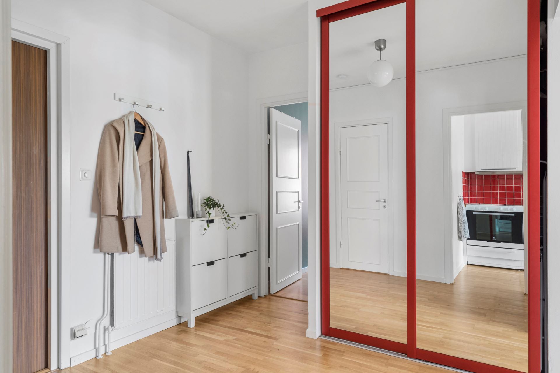 På första parkett inviterar en stilren hallmiljö med ekparkett (2017) som möter vitmålade väggar. Praktisk förvaring och plats för avhängning av ytterkläder och skor finns i inbyggd garderob samt garderob med spegelskjutdörrar.