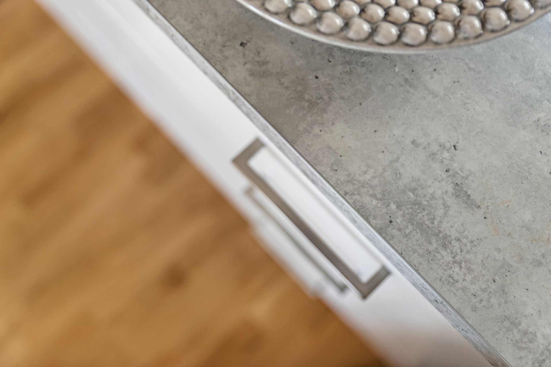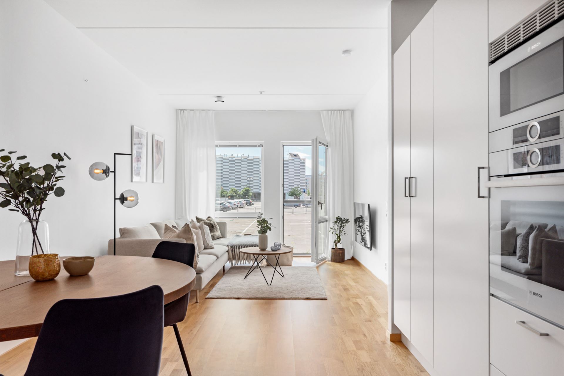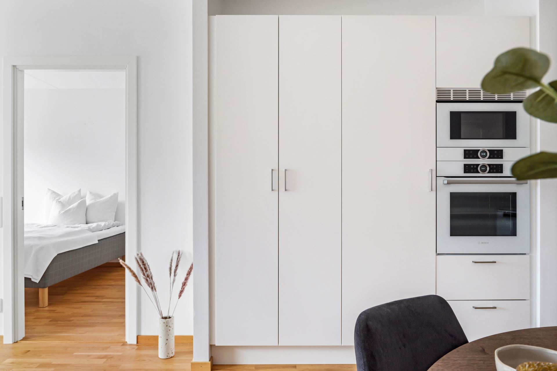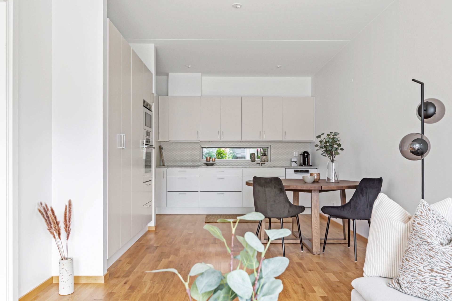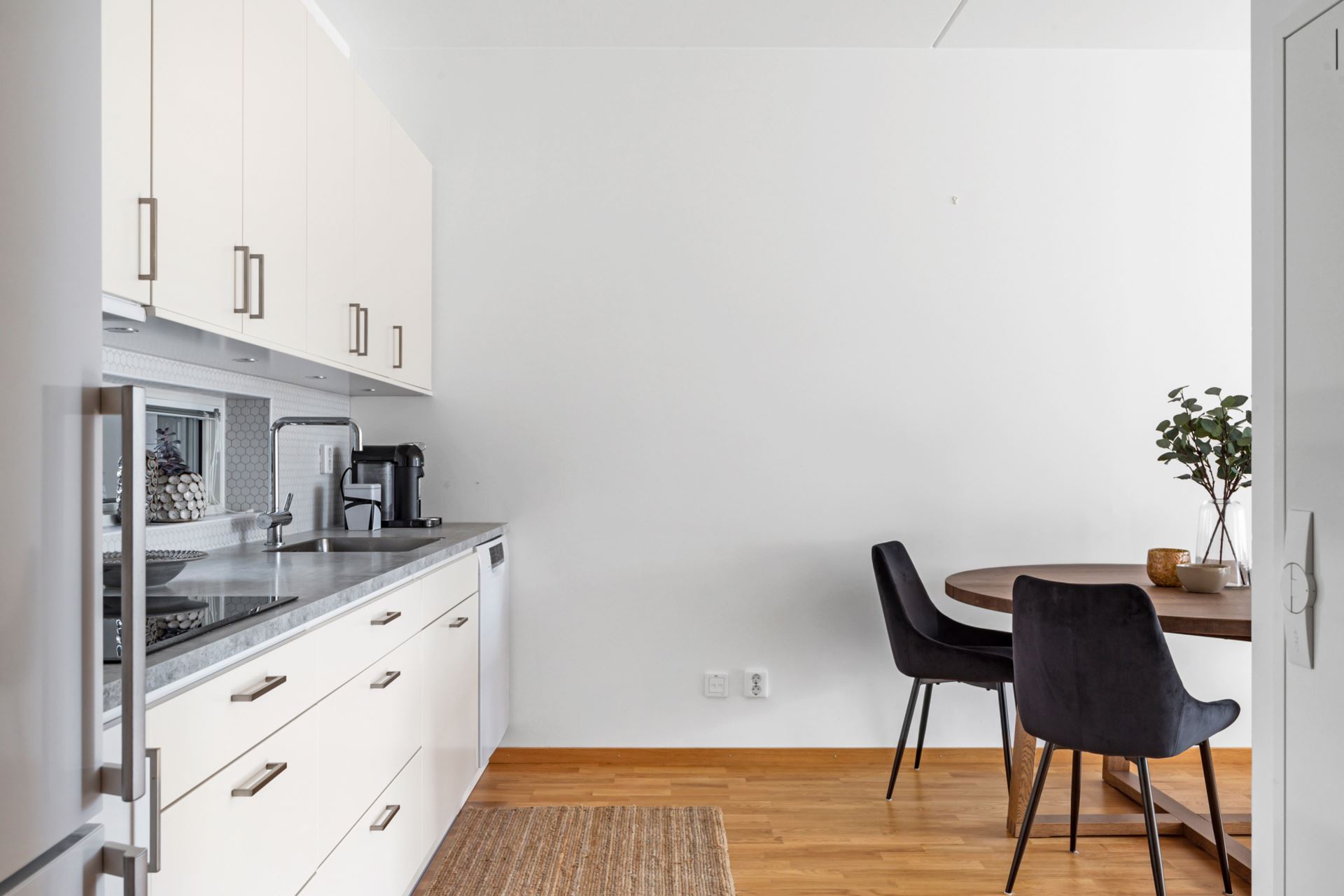 Näst på tur finner vi vida allrumskvadrat i öppen planlösning med det eleganta köket i stilsäkert utförande. Strålande ljus ifrån stora fönsterpartier samt helglasad balkongdörr förstärker det luftiga intrycket, och här inryms med lätthet såväl soffgrupp och ett par sköna fåtöljer som middagsbord. Under våra fötter vilar parkett i trestavig ek i samspel med vita väggar.