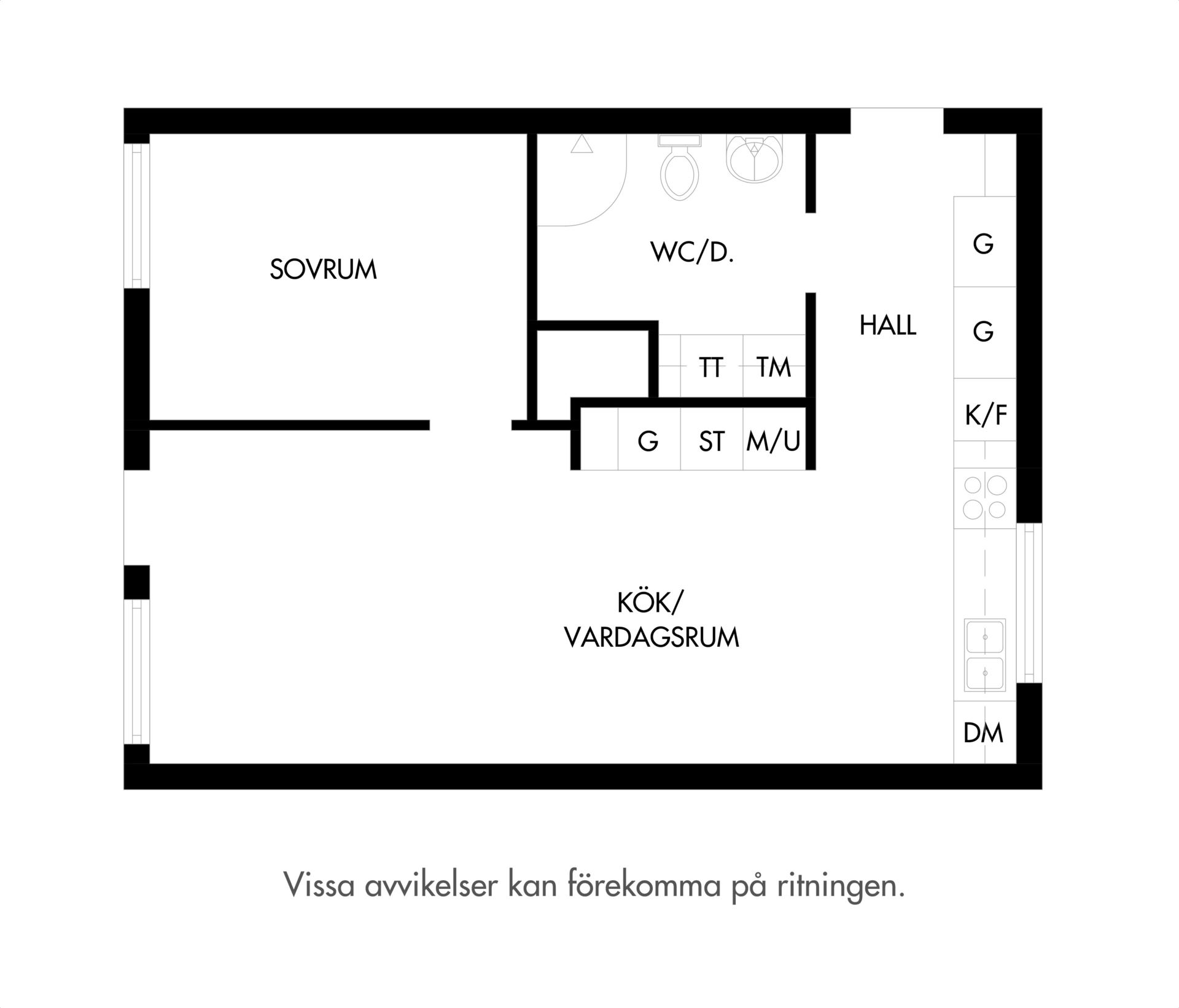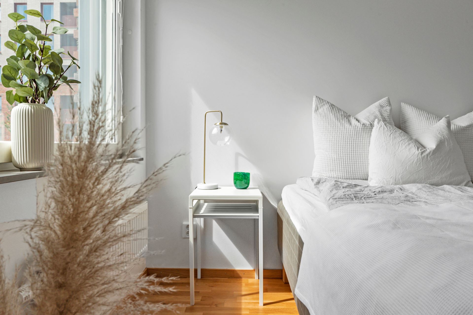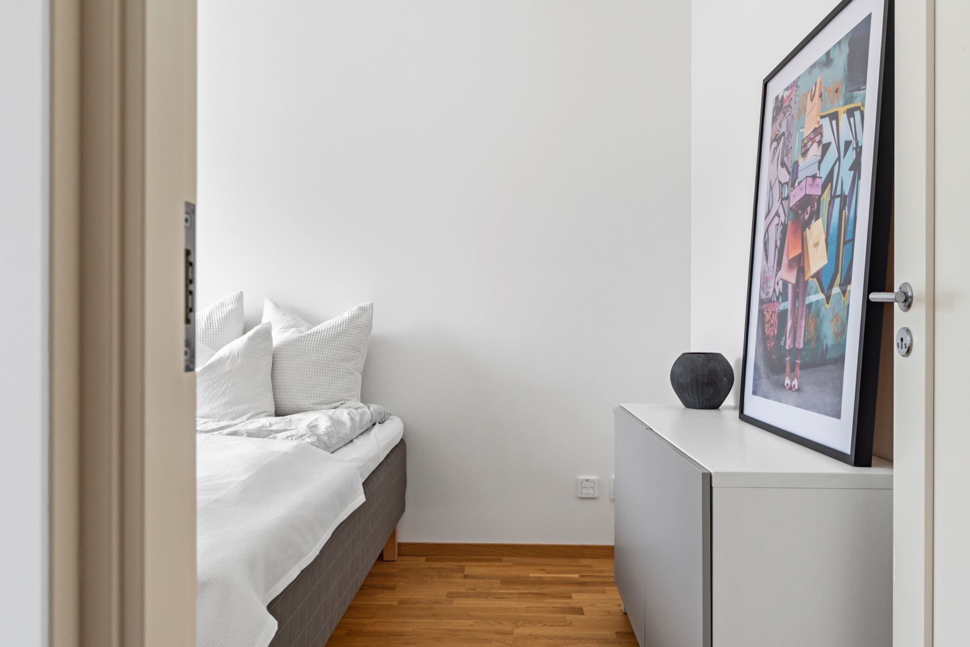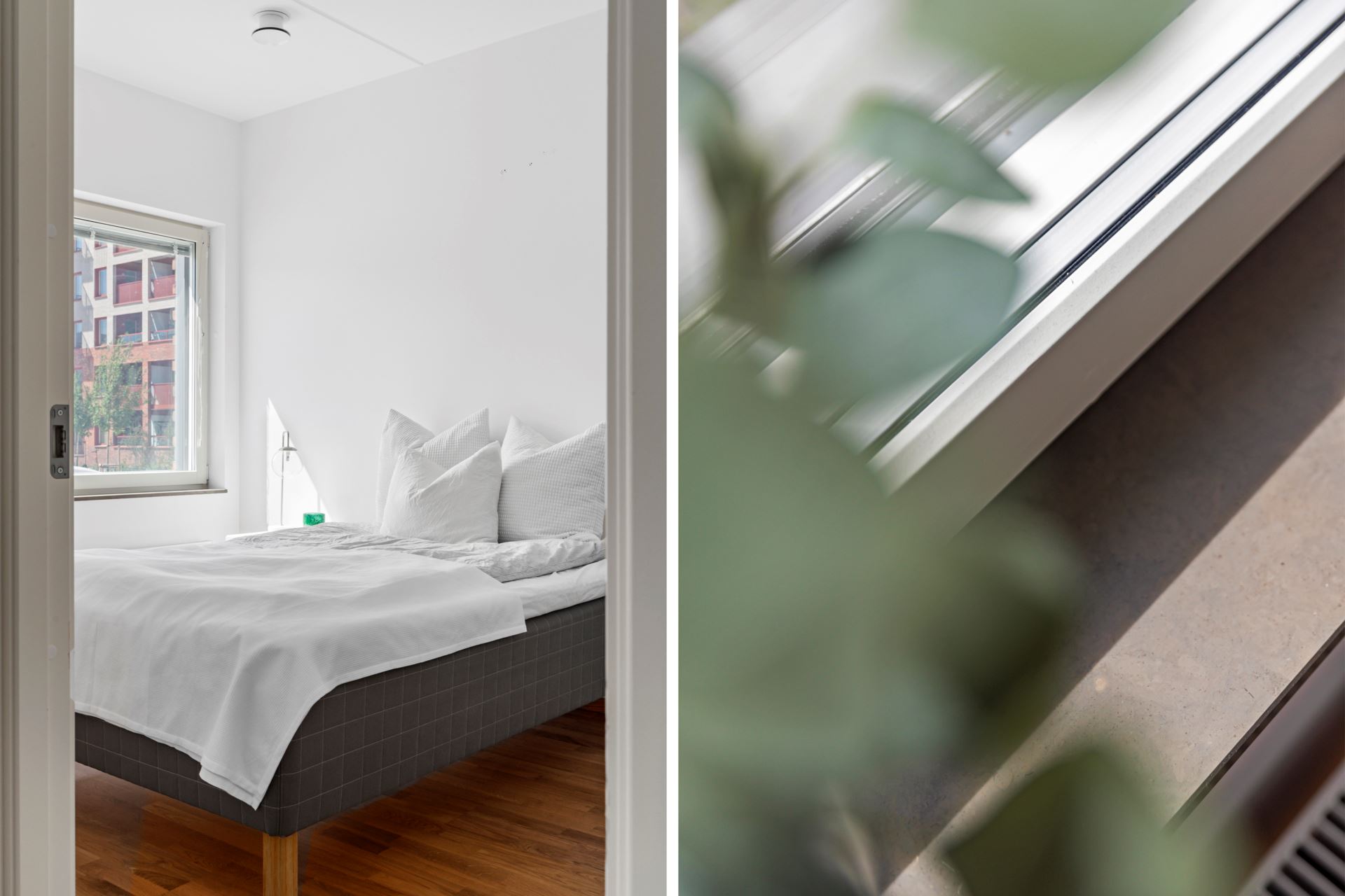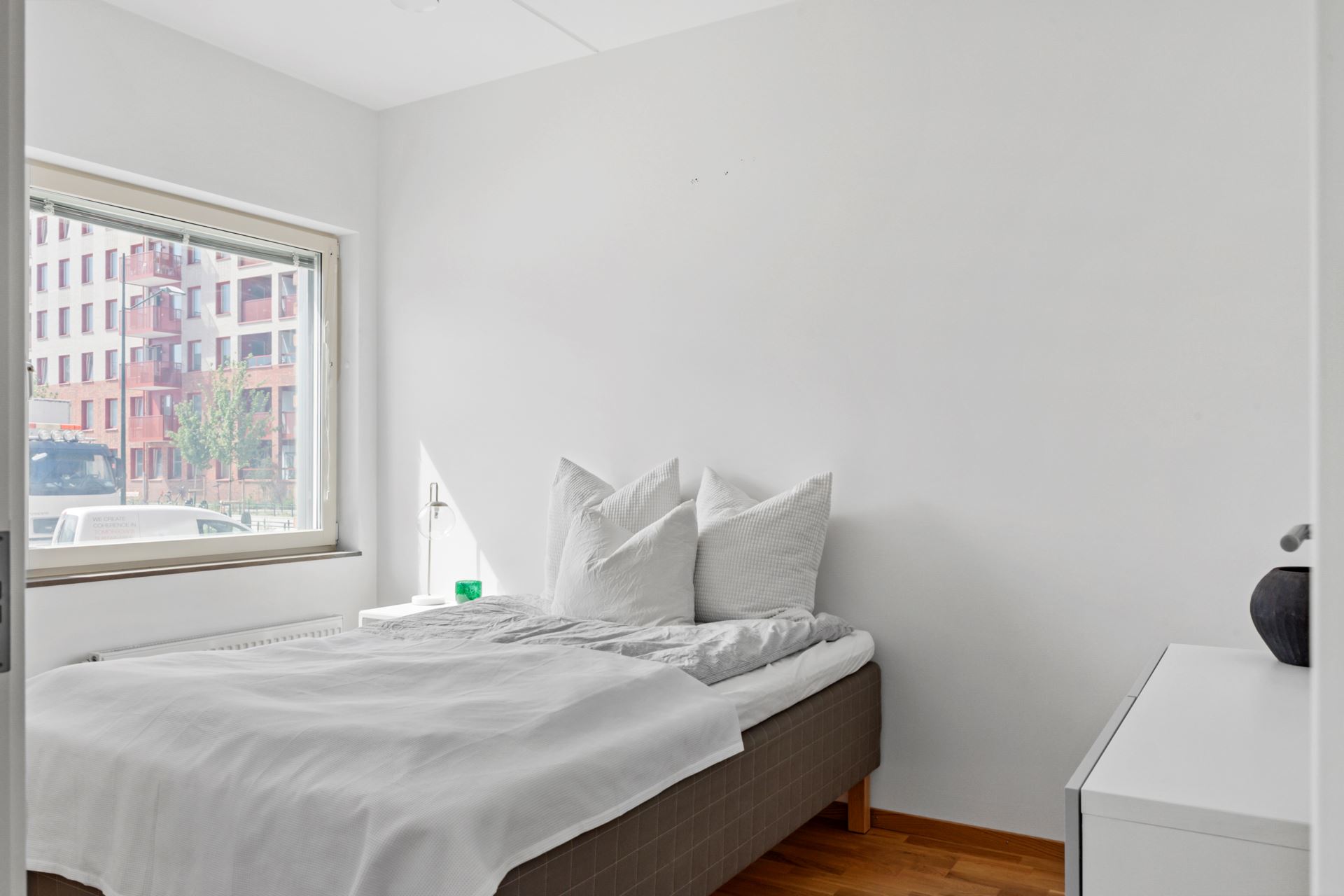 Bostadens sovrum kan enkelt möbleras med både dubbelsäng och tillhörande möblemang. Parkett i trestavig ek pryder golvet och väggarna är i klassiskt vitt.