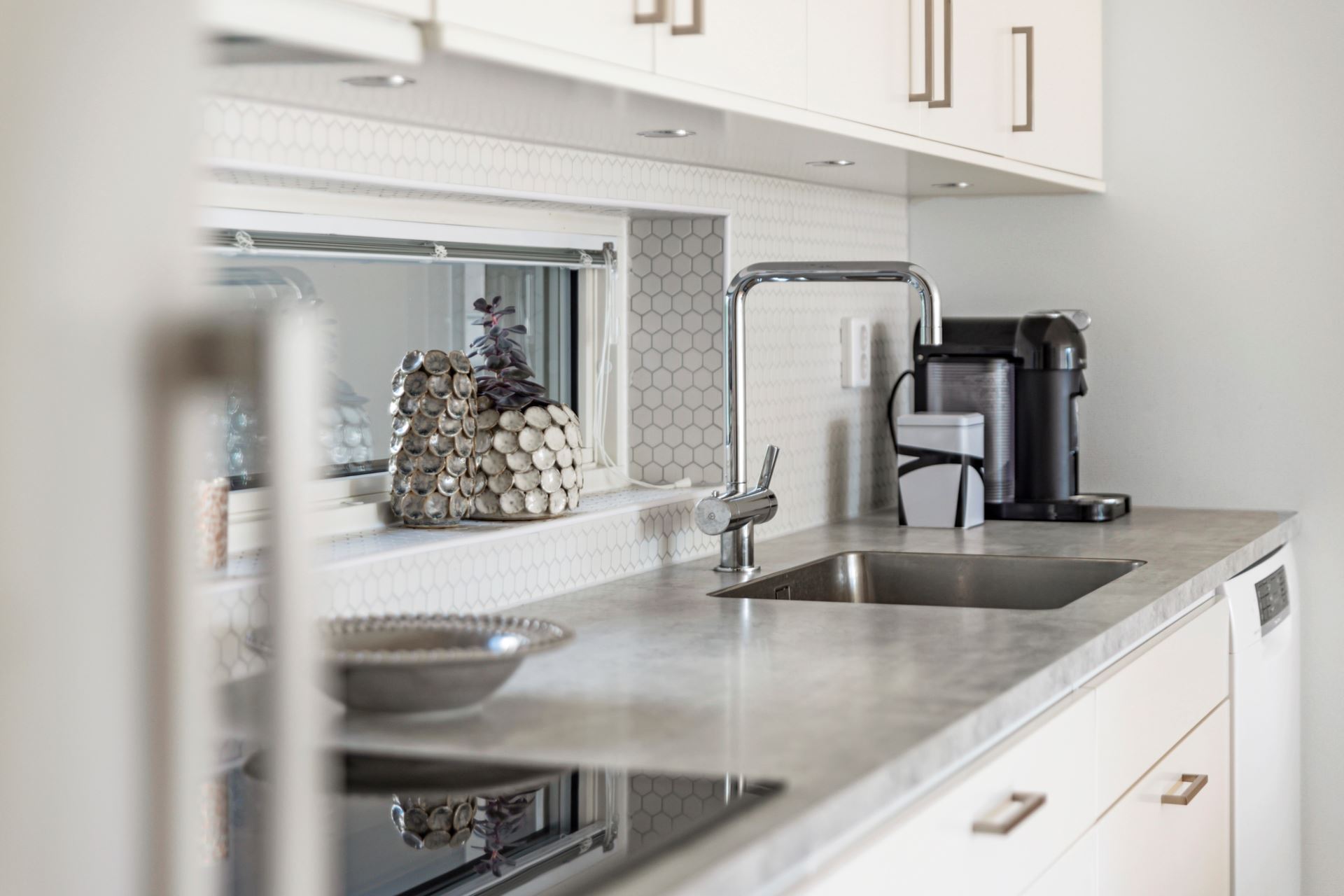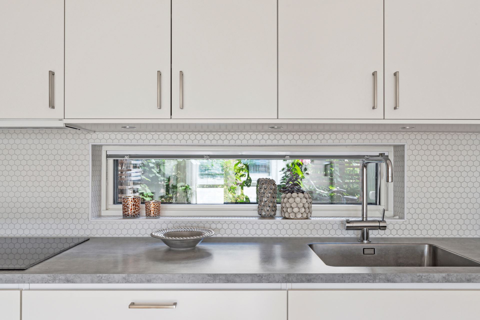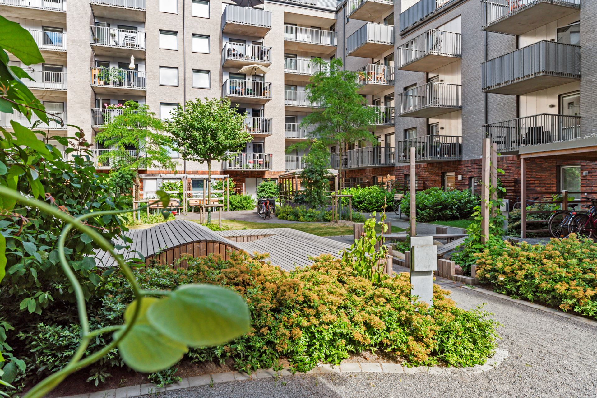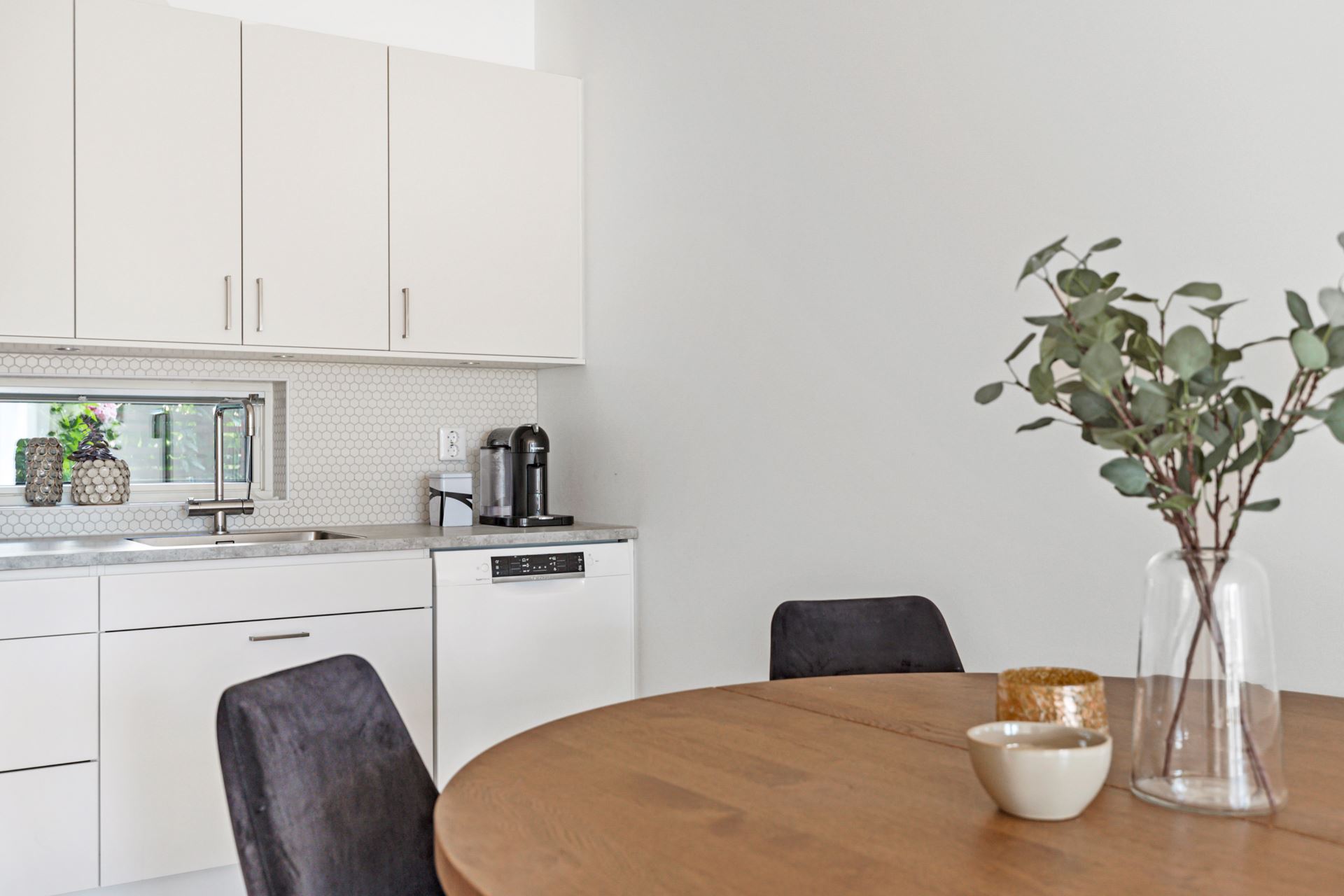 Vidare in inviterar ett smakfullt kök från Vedum med förvaring bakom släta luckor i off-white. Detta ackompanjeras av tilltagna arbetsytor med laminatskiva i betongimitation och ett vitt kakel ovan som stänkskydd. Ett ljusbringande fönster finns även att tillgå ovan vasken och förser oss med en grönskande vy mot den välskötta innergården. Den maskinella utrustningen består av integrerad kyl och frys i fullhöjd, diskmaskin i vitt från Bosch, inbyggd mikrovågsugn i vitt från Bosch, inbyggd ugn i vitt från Bosch, spishäll och integrerad fläkt.
