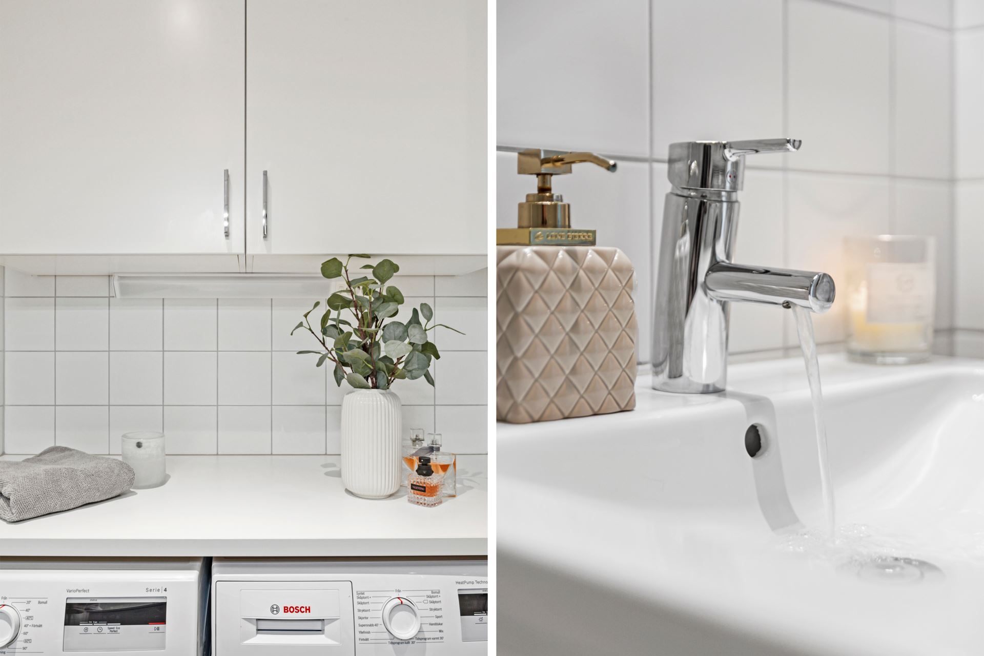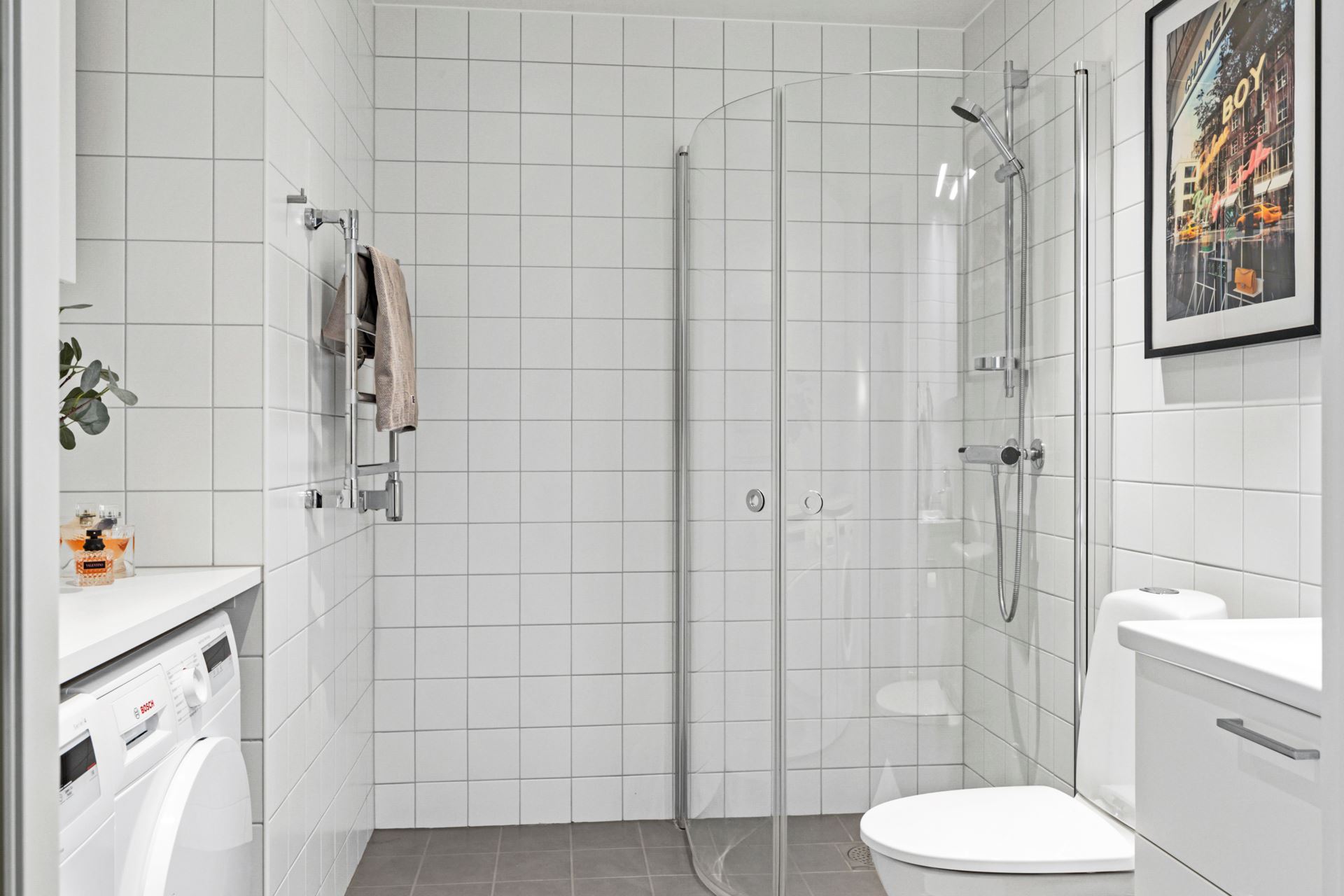 Från hallen når vi en helkaklad badrumsmiljö, där grå klinker harmonierar med vitkaklade väggar. Välutrustat med spegel, handfat med kommod, wc, handdukstork och dusch med vikdörrar i klarglas. Här finns även bekvämlighet med egen tvättmaskin och torktumlare från Bosch med förvaring ovan i skåp med vita luckor.