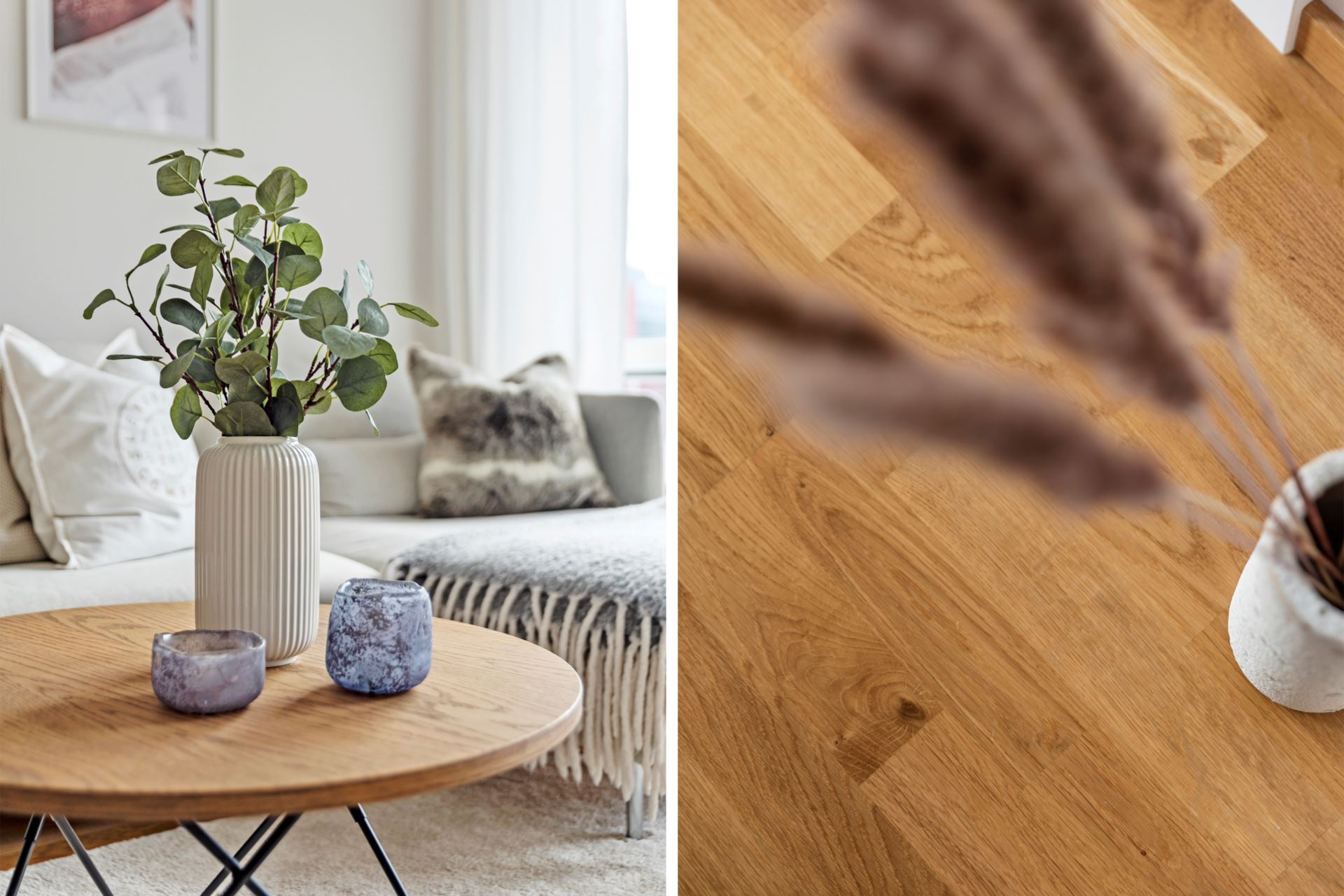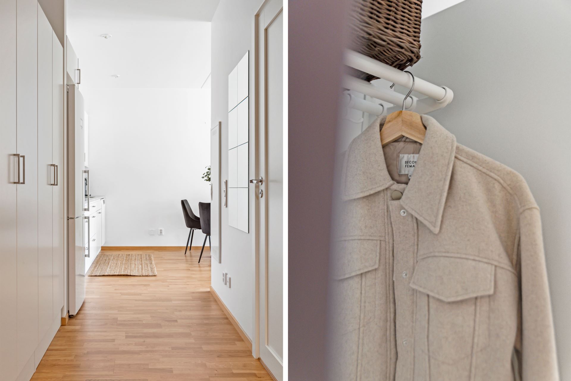 Hallen välkomnar med parkett i trestavig ek, som tillsammans med vitmålade väggar, utgör ett genomgående inslag för hela bostaden. Här finns gott om plats för avhängning av ytterkläderna och även förvaring i flertalet platsbyggda garderober.