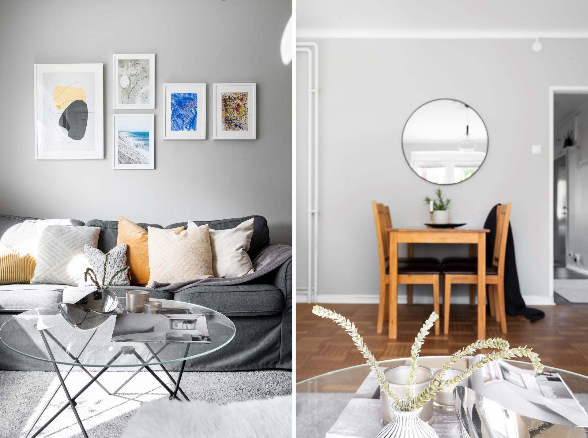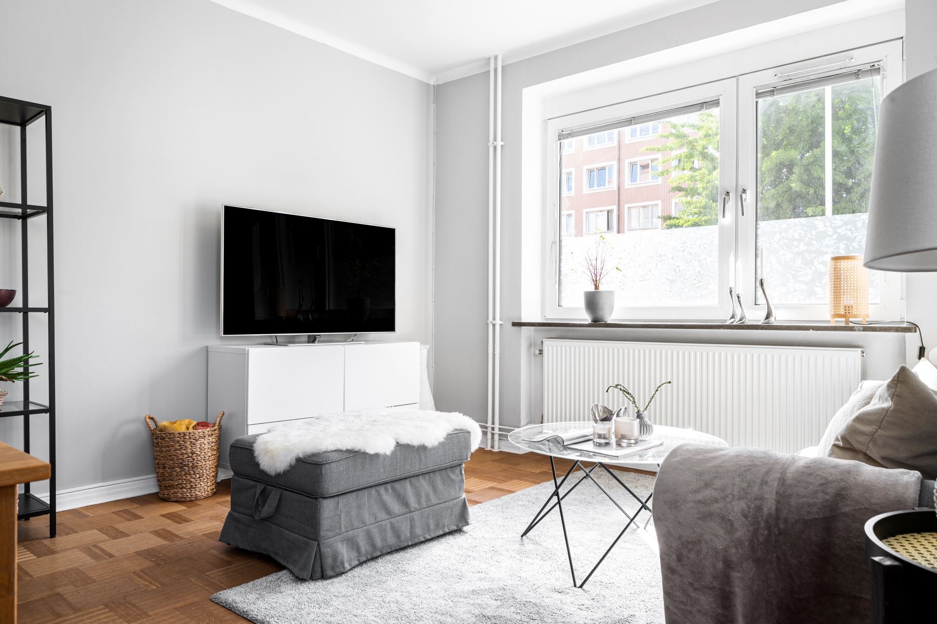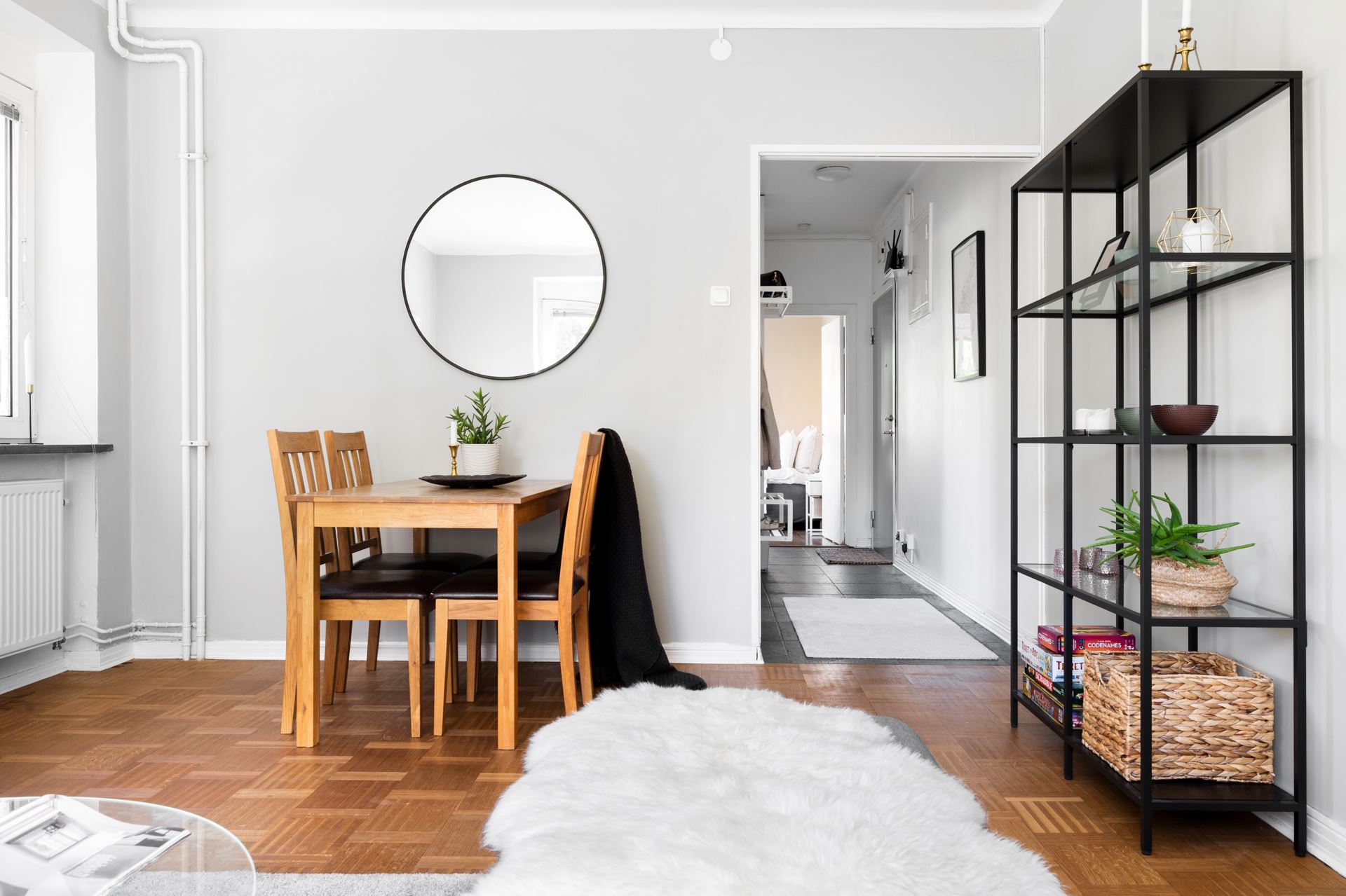Vi tar oss vidare in till vardagsrummet. Här får vi plats med både soffa och matplats intill fönsterparti där vi får generöst med ljusinsläpp från två väderstreck. På golv ligger parkett som kombineras fint med vitmålade väggar.
