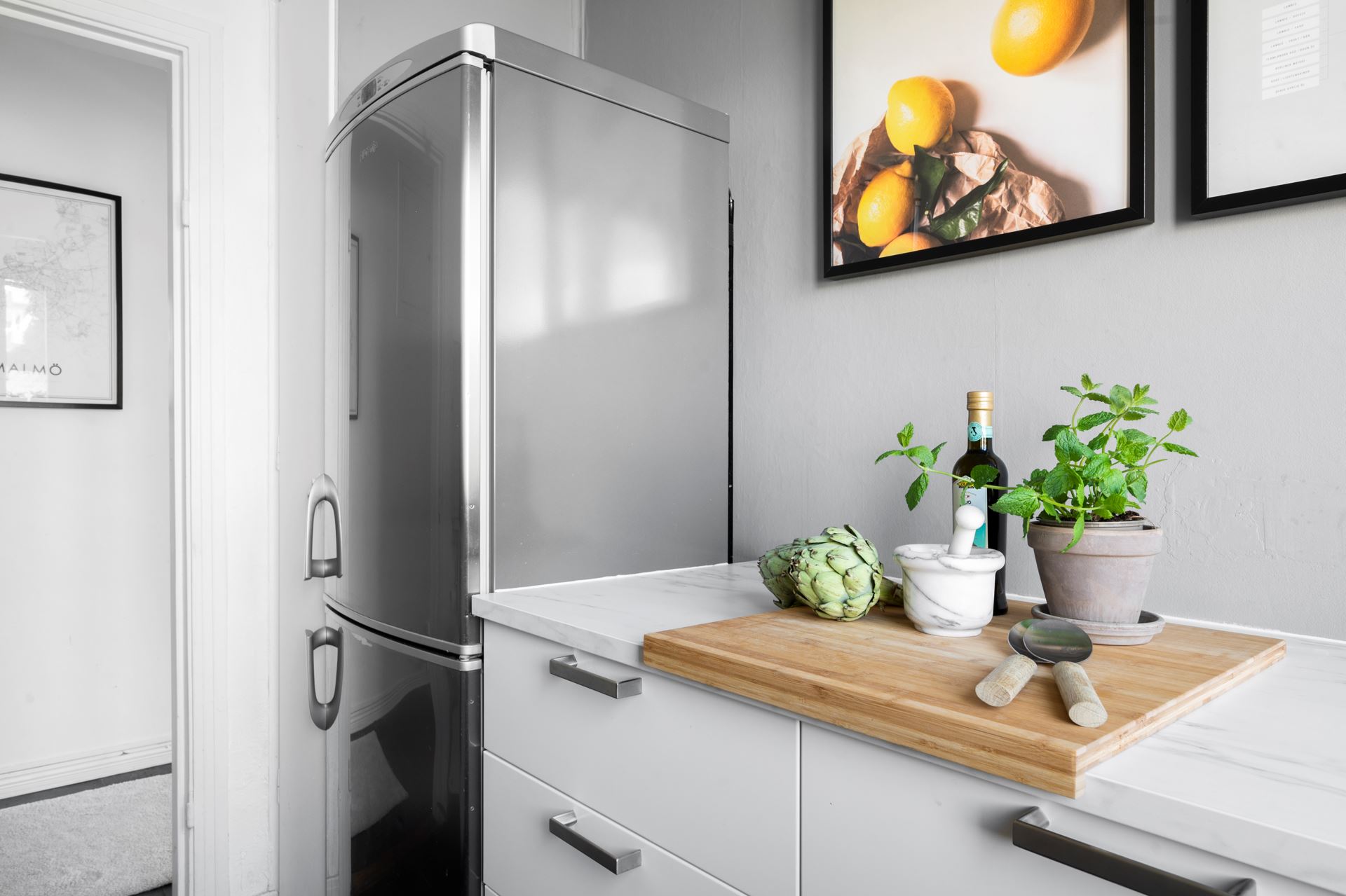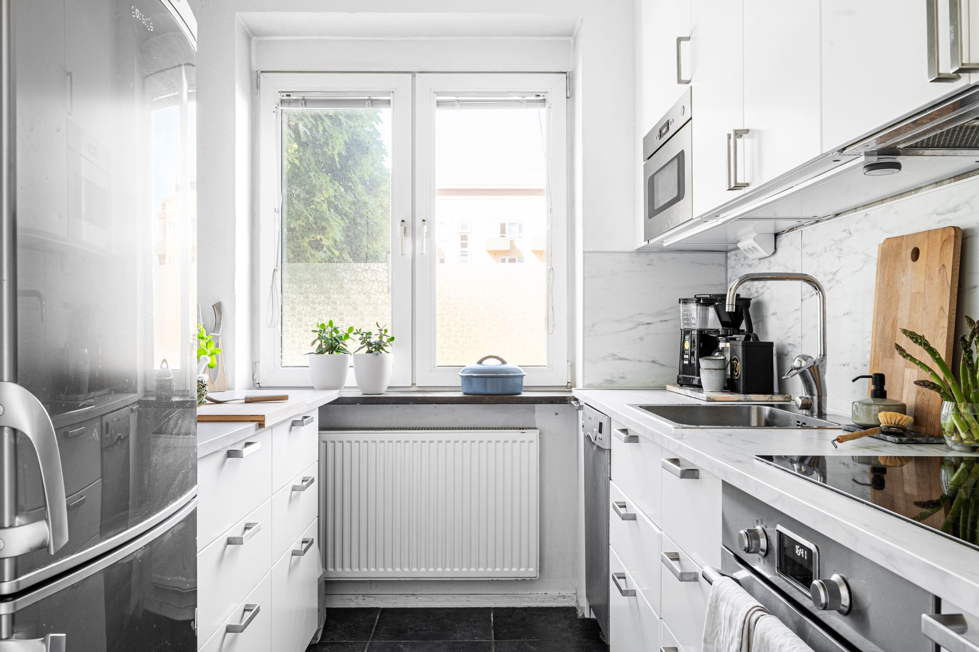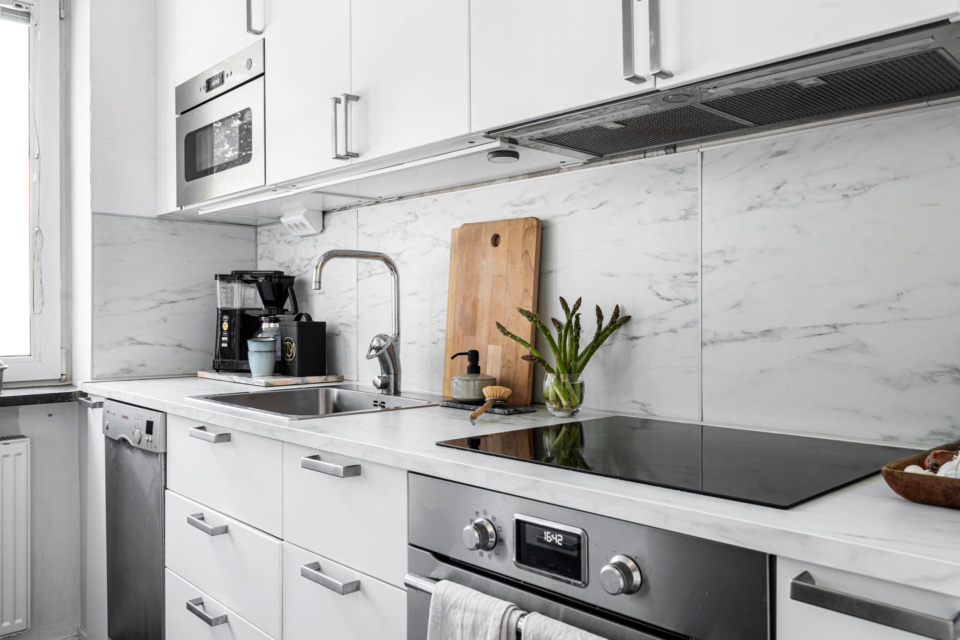 Snyggt och stilrent Ikea-kök med bra förvaringsutrymme bakom vita luckor och marmorfärgad bänkskiva som arbetsyta. Köket är utrustat med kombinerad kyl/frys, spis/ugn, mikro, köksfläkt och diskmaskin.