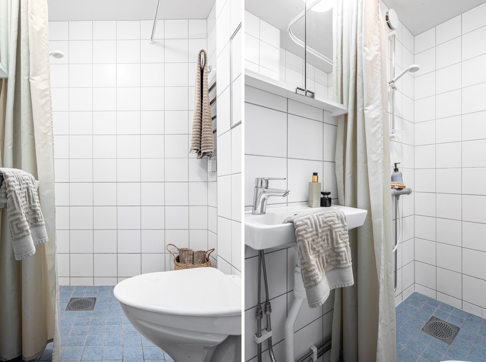 Helkaklat fräscht badrum i ljusa färger. Utrustat med dusch, WC, handfat och kommod.
