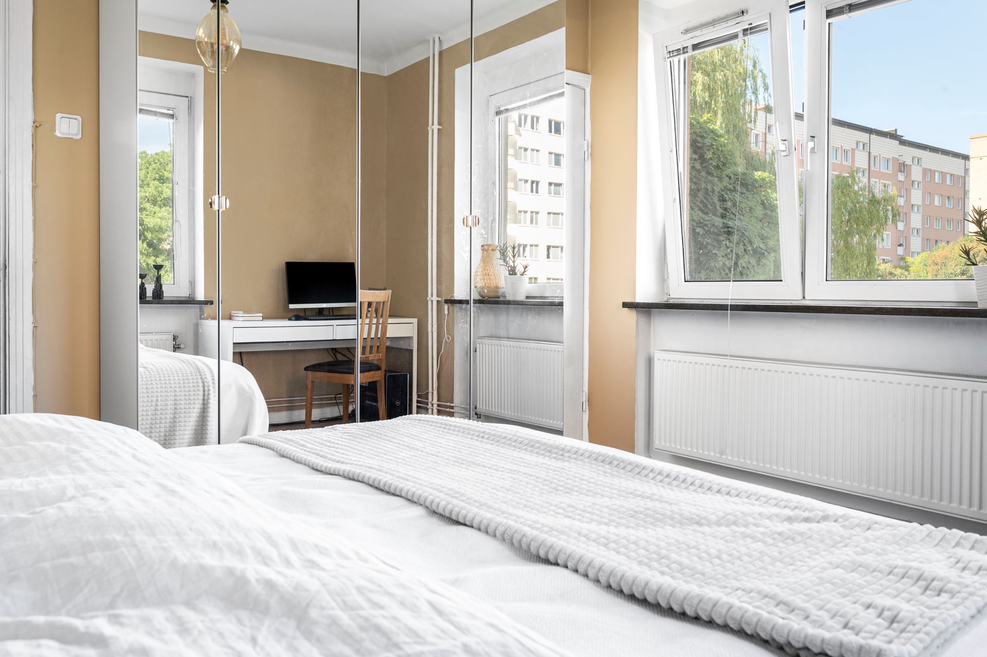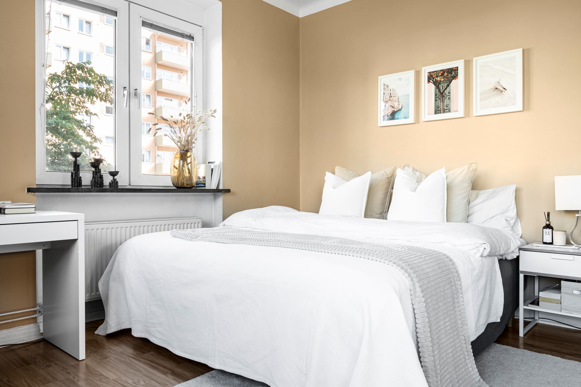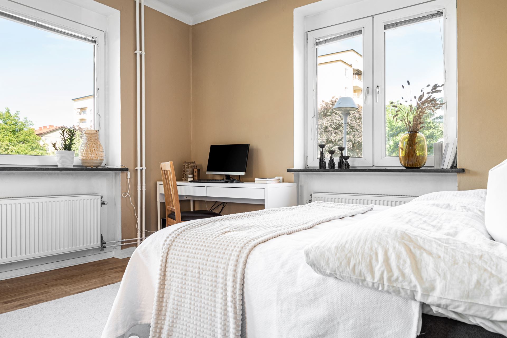 Stort sovrum där det finns plats för dubbelsäng, sängbord och mer möblering efter behov. Här finns utmärkt med förvaringsmöjligheter i rymlig garderob. Även här får vi bra med ljusinsläpp från flertalet fönsterparti då vi är på gaveln. Det ligger snyggt laminat på golv tillsammans med ljusa väggar.