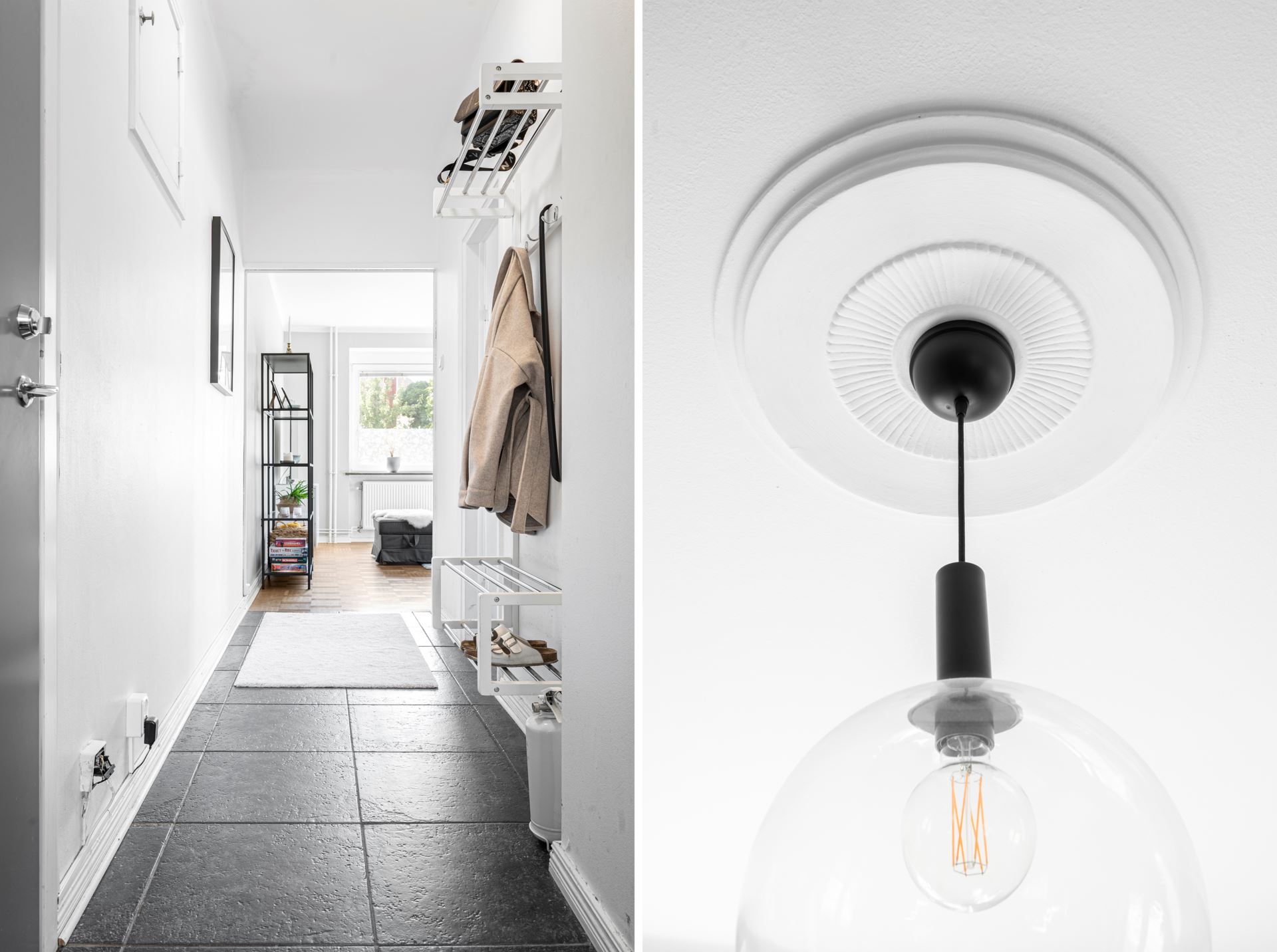 En halv trappa upp tar vi oss in i hallen där det finns gott om plats för avhängning för ytterkläder och skor. Trevlig hallmiljö med snyggt stengolv tillsammans med vitmålade väggar.