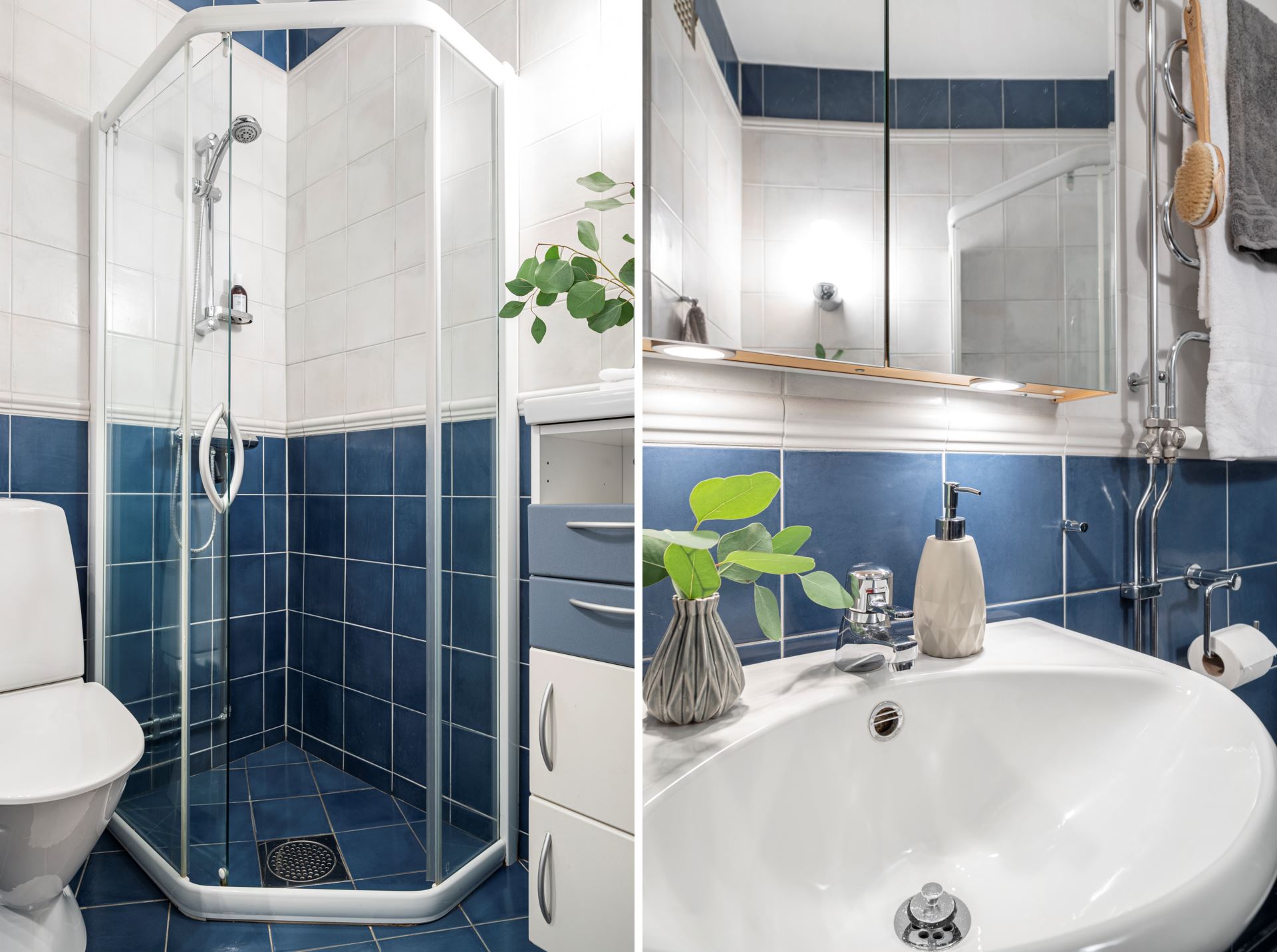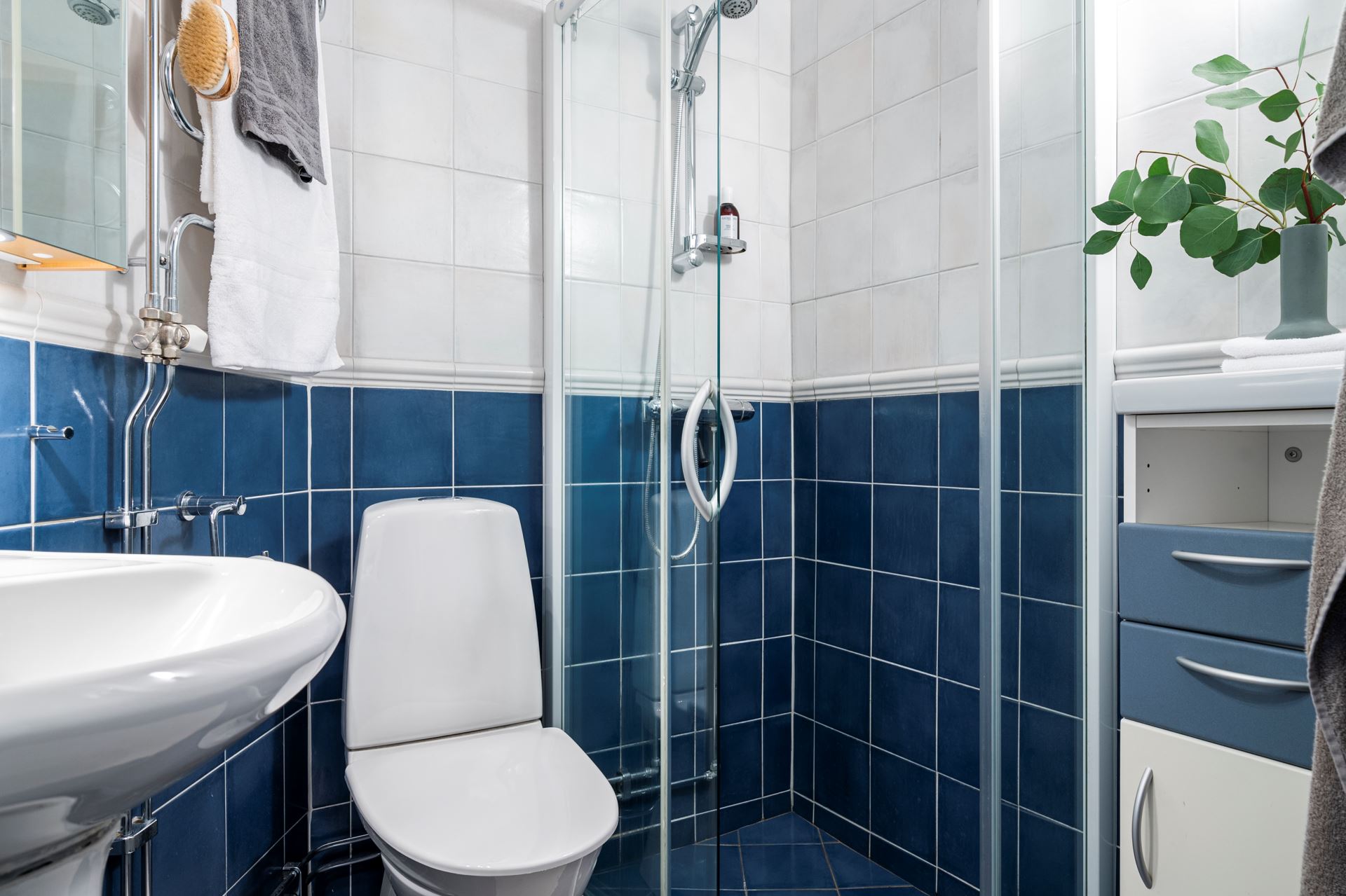 Till höger finner vi det helkaklade badrummet som är renoverat 2001. Badrummet går i vitt och blått och har toalett, handfat, spegelskåp med belysning, duschhörna med glasväggar och vattenburen handdukstork.