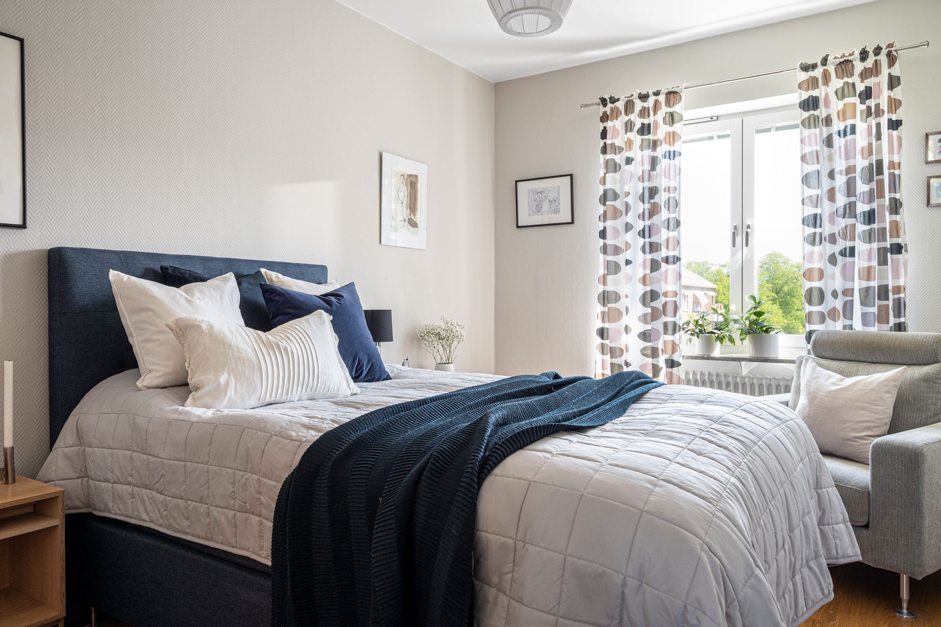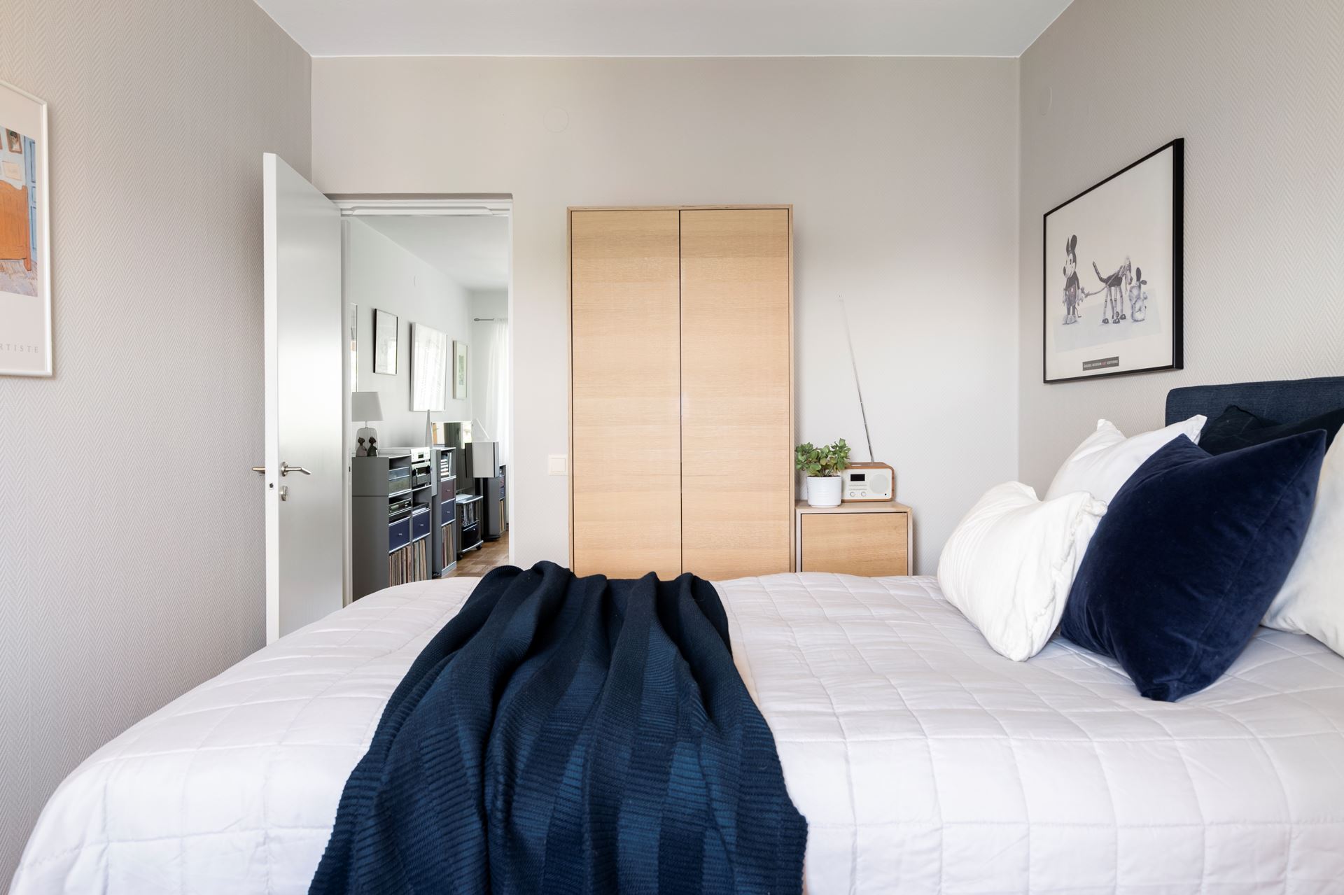 Ljust sovrum med plats för dubbelsäng och tillhörande möblemang. Målad fiskbenstapet i beige och parkettgolv (2010).