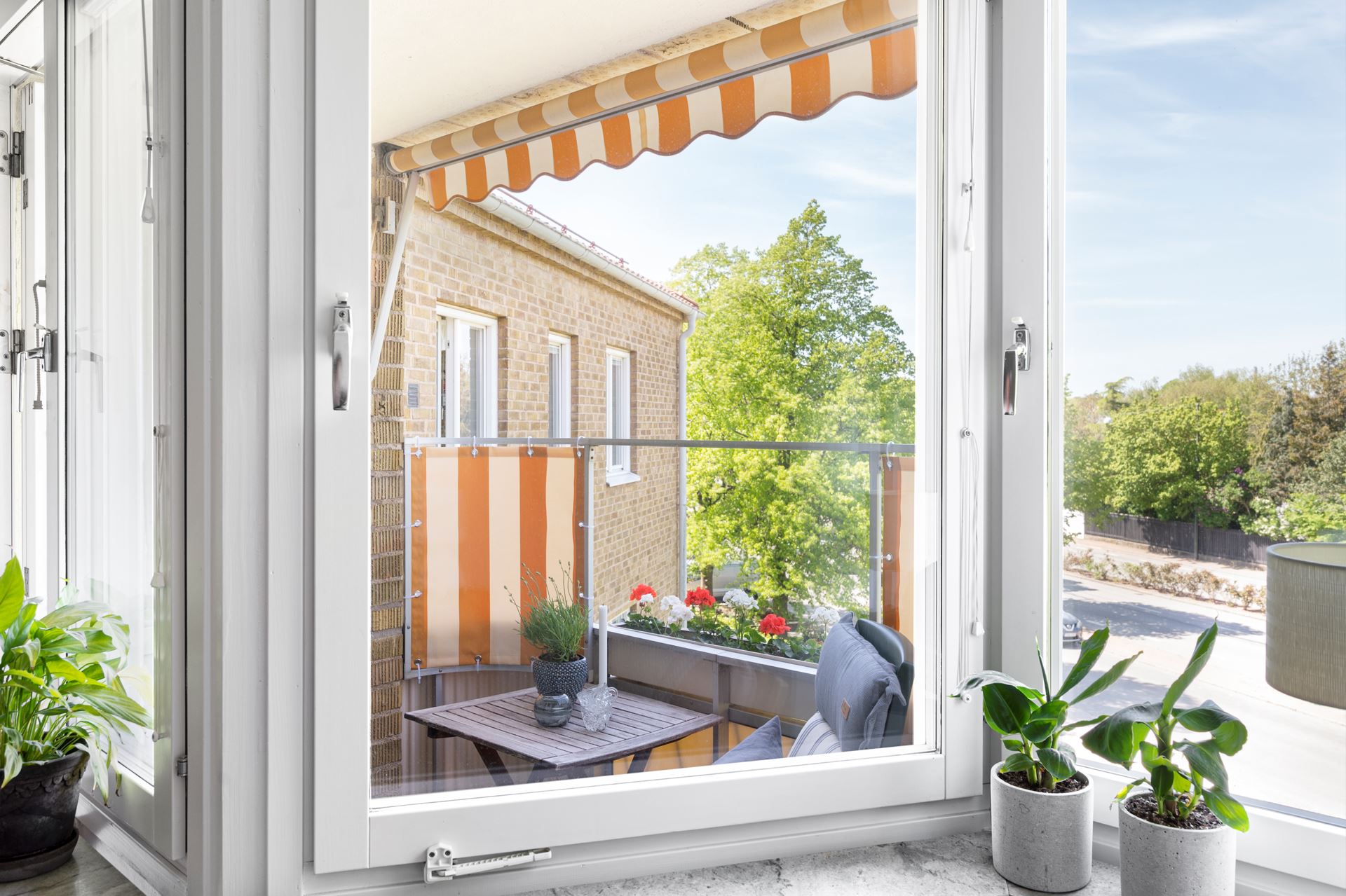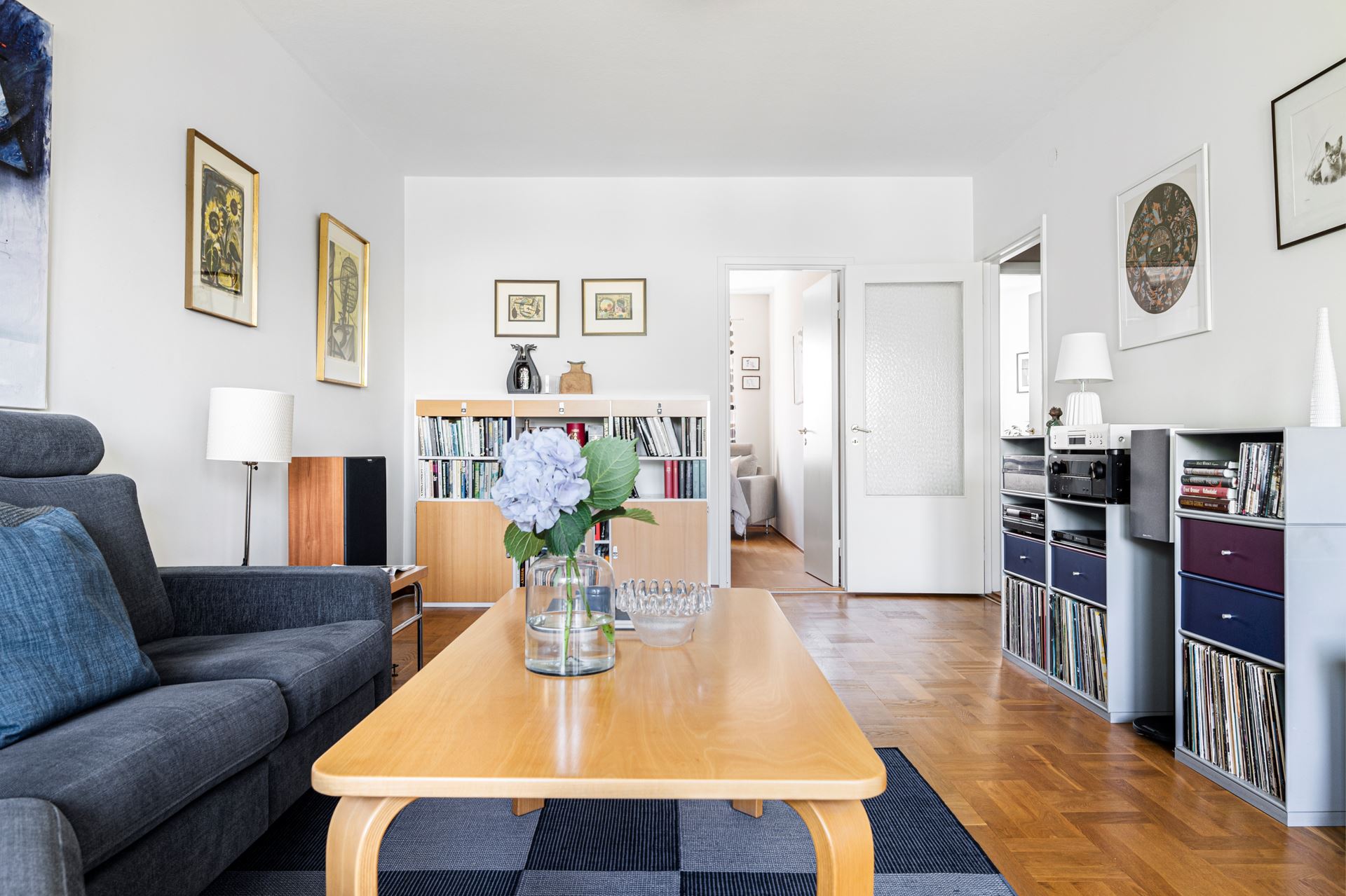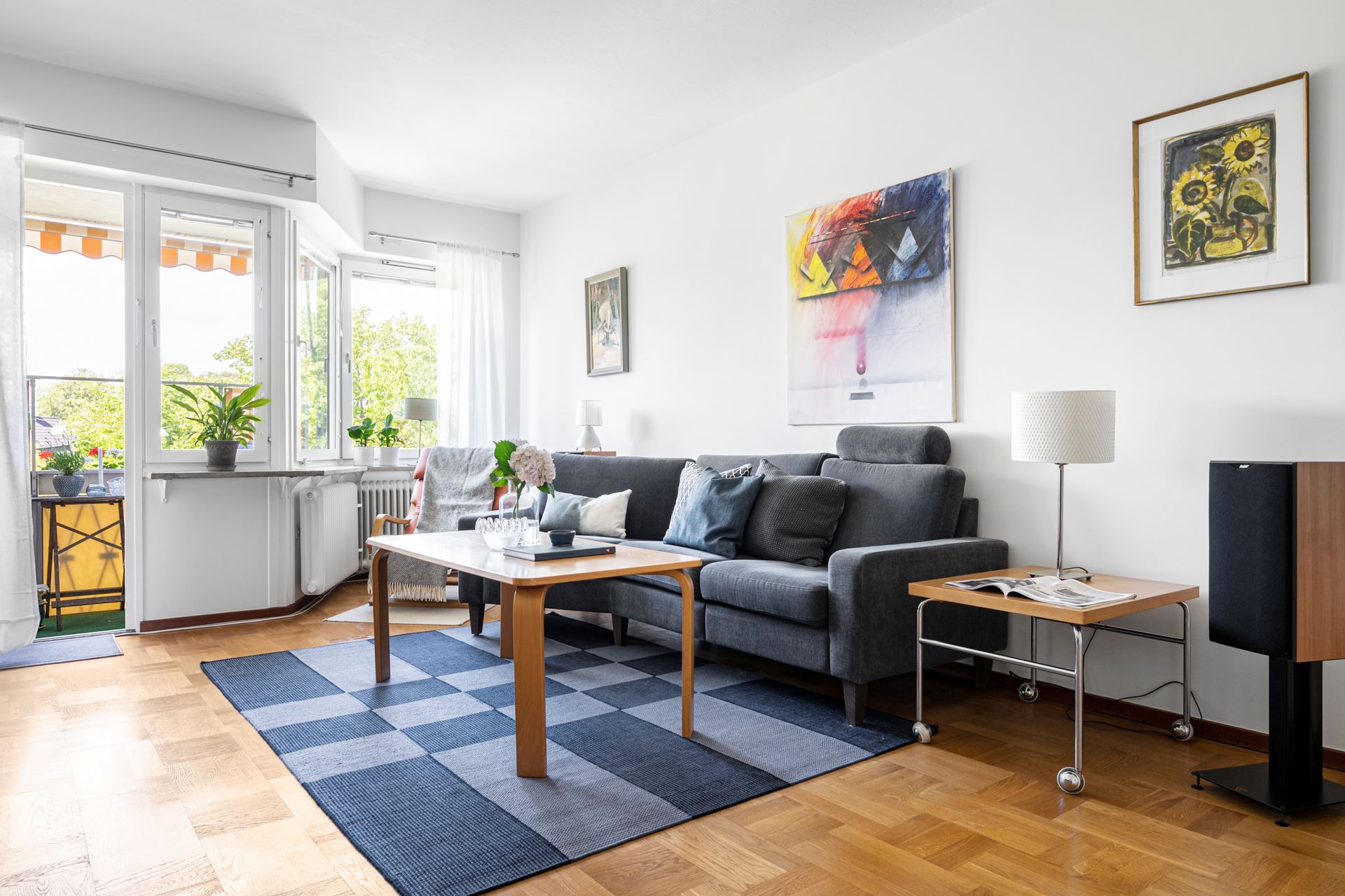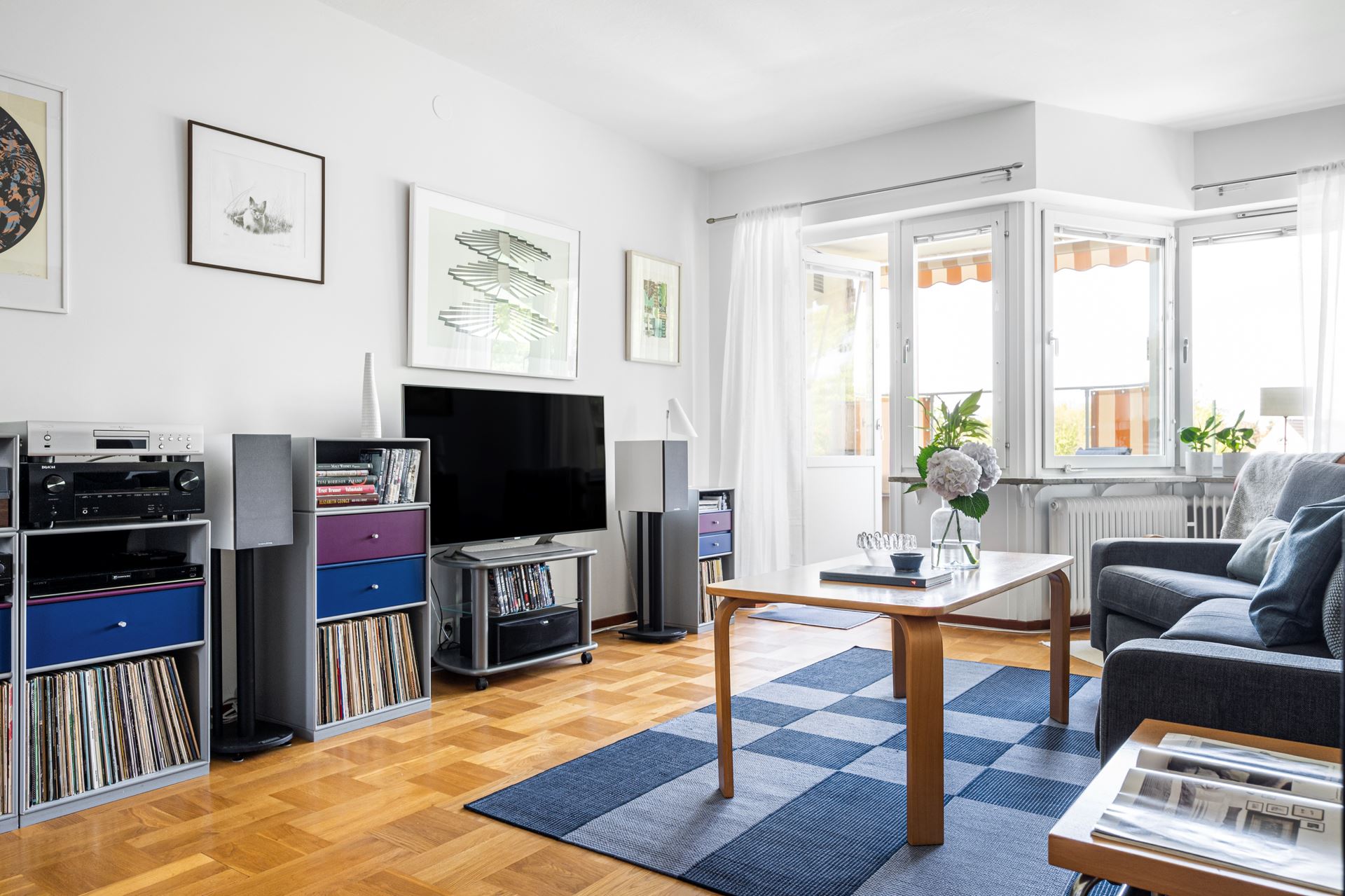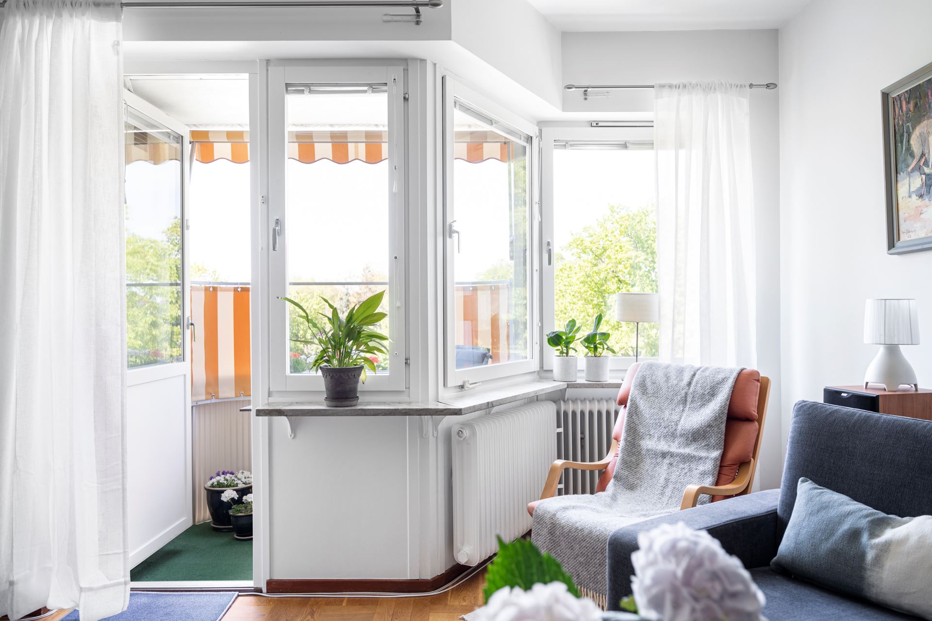 Tar vi oss vidare in i bostaden når vi det generösa vardagsrummet som omedelbart låter det härliga ljusinsläppet från fönsterpartiet hänföra oss. Här åtnjuts parkettgolv i original, klassiskt vita väggar och utgång till en underbar balkong i härligt sydvästläge. Rummet inrymmer med lätthet både soffgrupp och ytterligare möblemang efter behov, förslagsvis en skön fåtölj vid det vinklade fönterpartiet.