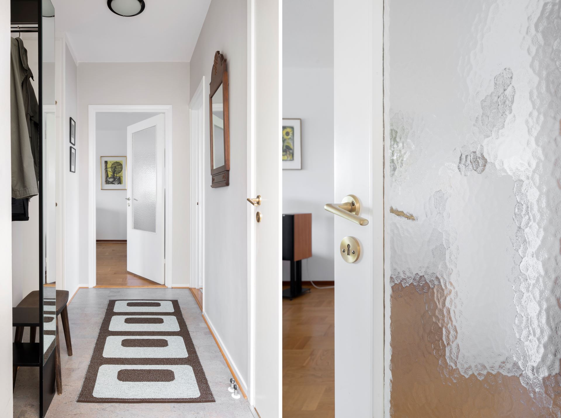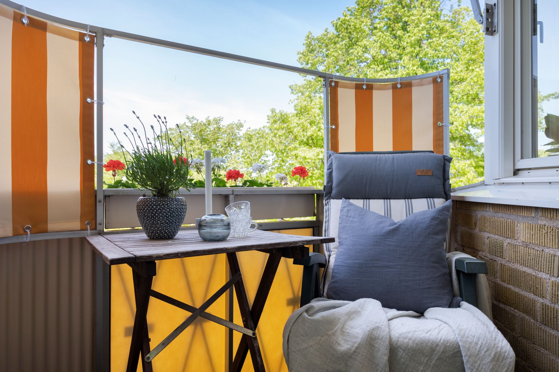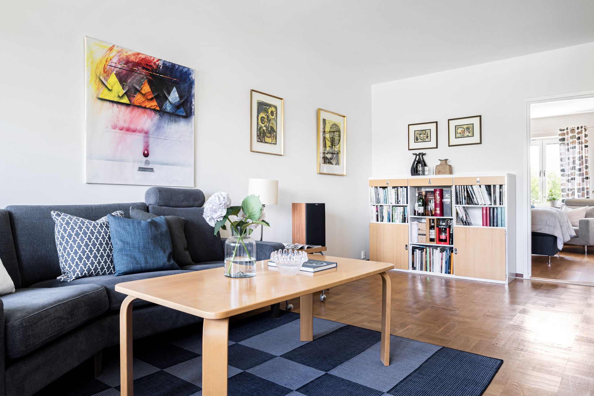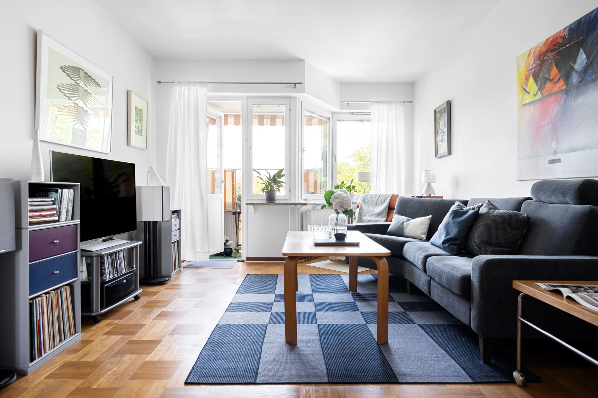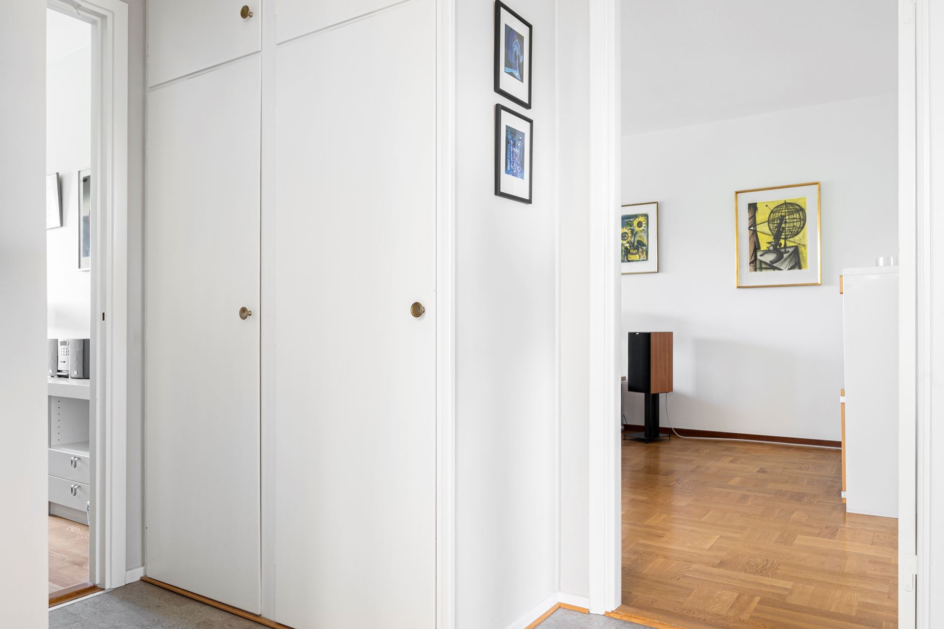 Tar vi oss vidare in i bostaden når vi det generösa vardagsrummet som omedelbart låter det härliga ljusinsläppet från fönsterpartiet hänföra oss. Här åtnjuts parkettgolv i original, klassiskt vita väggar och utgång till en underbar balkong i härligt sydvästläge. Rummet inrymmer med lätthet både soffgrupp och ytterligare möblemang efter behov, förslagsvis en skön fåtölj vid det vinklade fönterpartiet.
