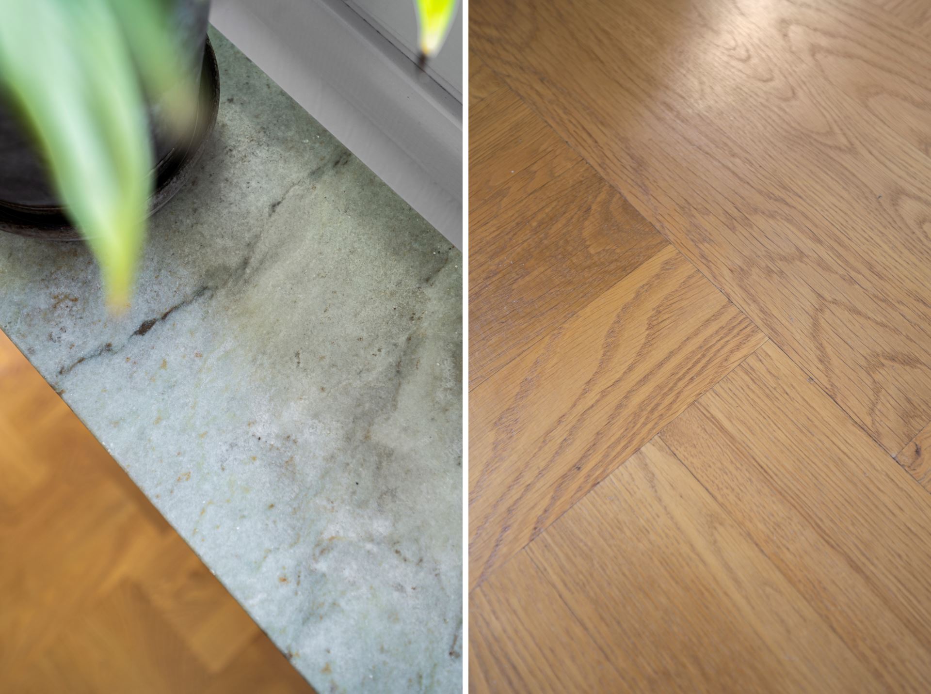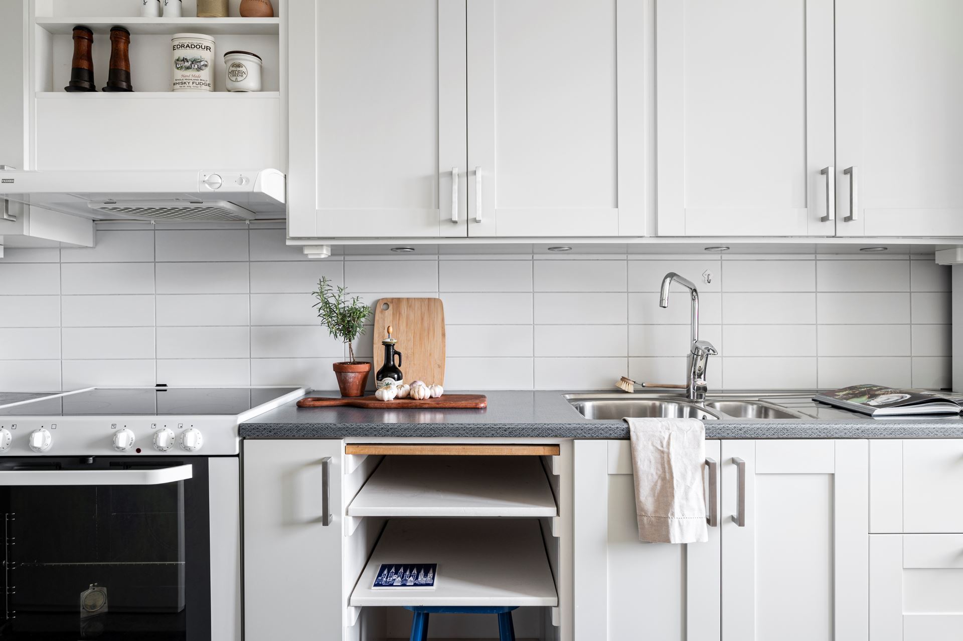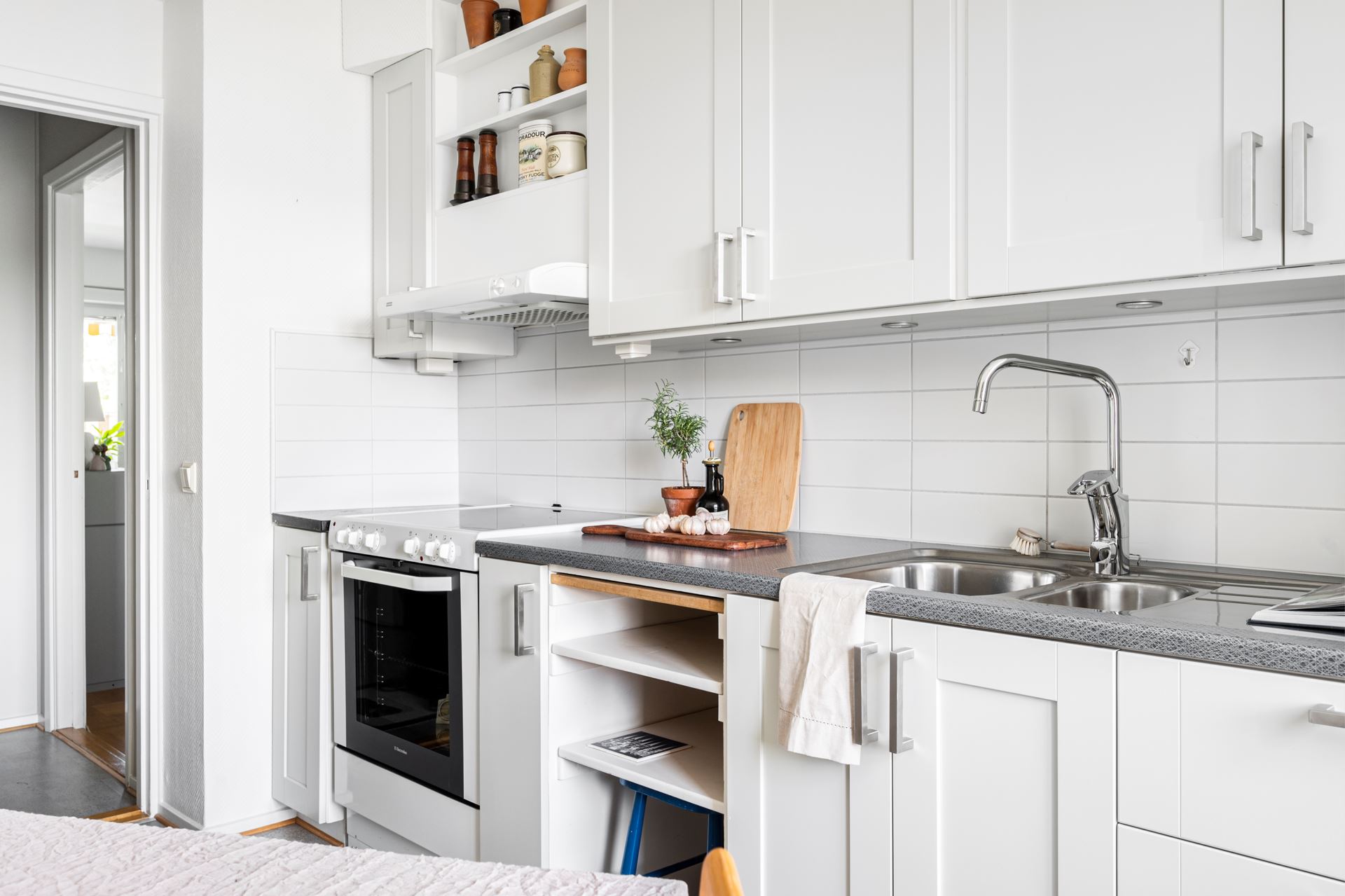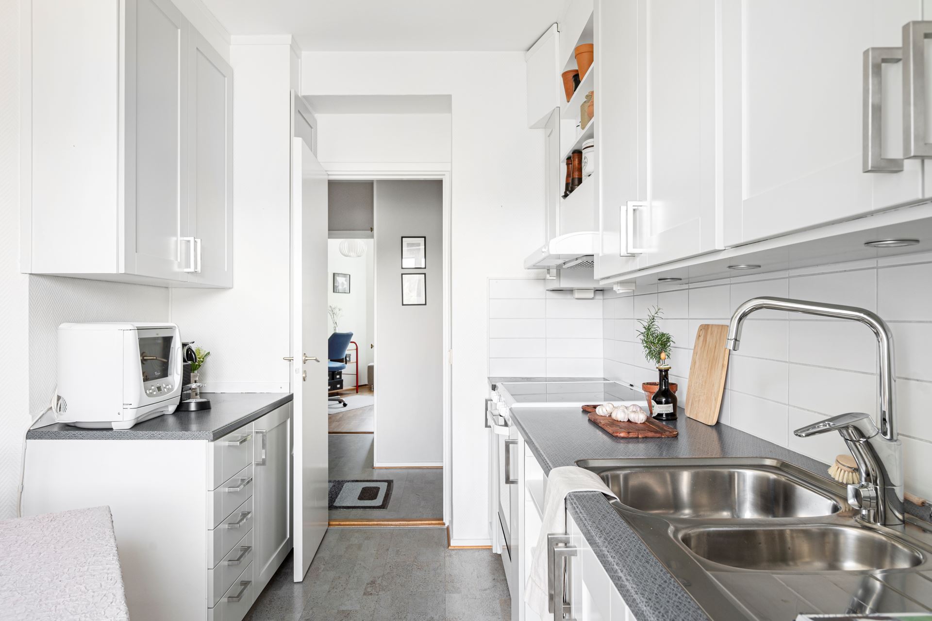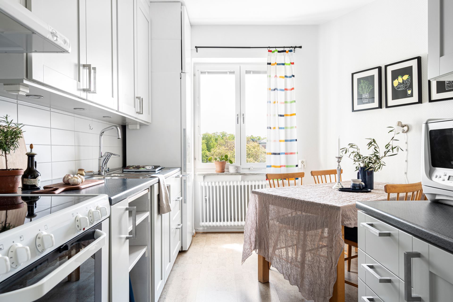 Direkt efter erbjuds det härligt ljusa köket som renoverades 2010 (stommar original) med nya luckor i stilrent ljusgrått, grå arbetsbänk (virrvarr mönster) med vitt kakel ovanför och praktisk bänkbelysning. Den maskinella utrustningen består av delad kyl/frys (2015), mikro, ugn med spishäll och fläkt. Grått golv och vitmålad fiskbenstapet förhöjer den stilrena och moderna känslan.